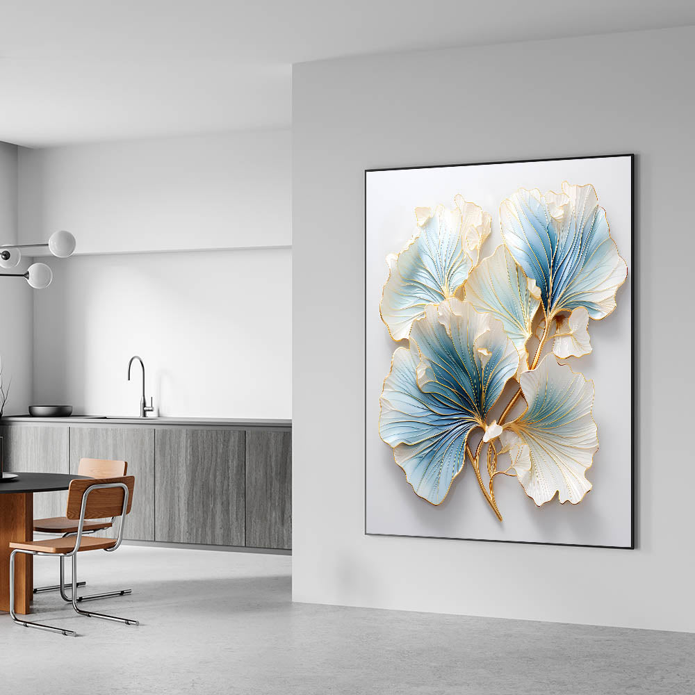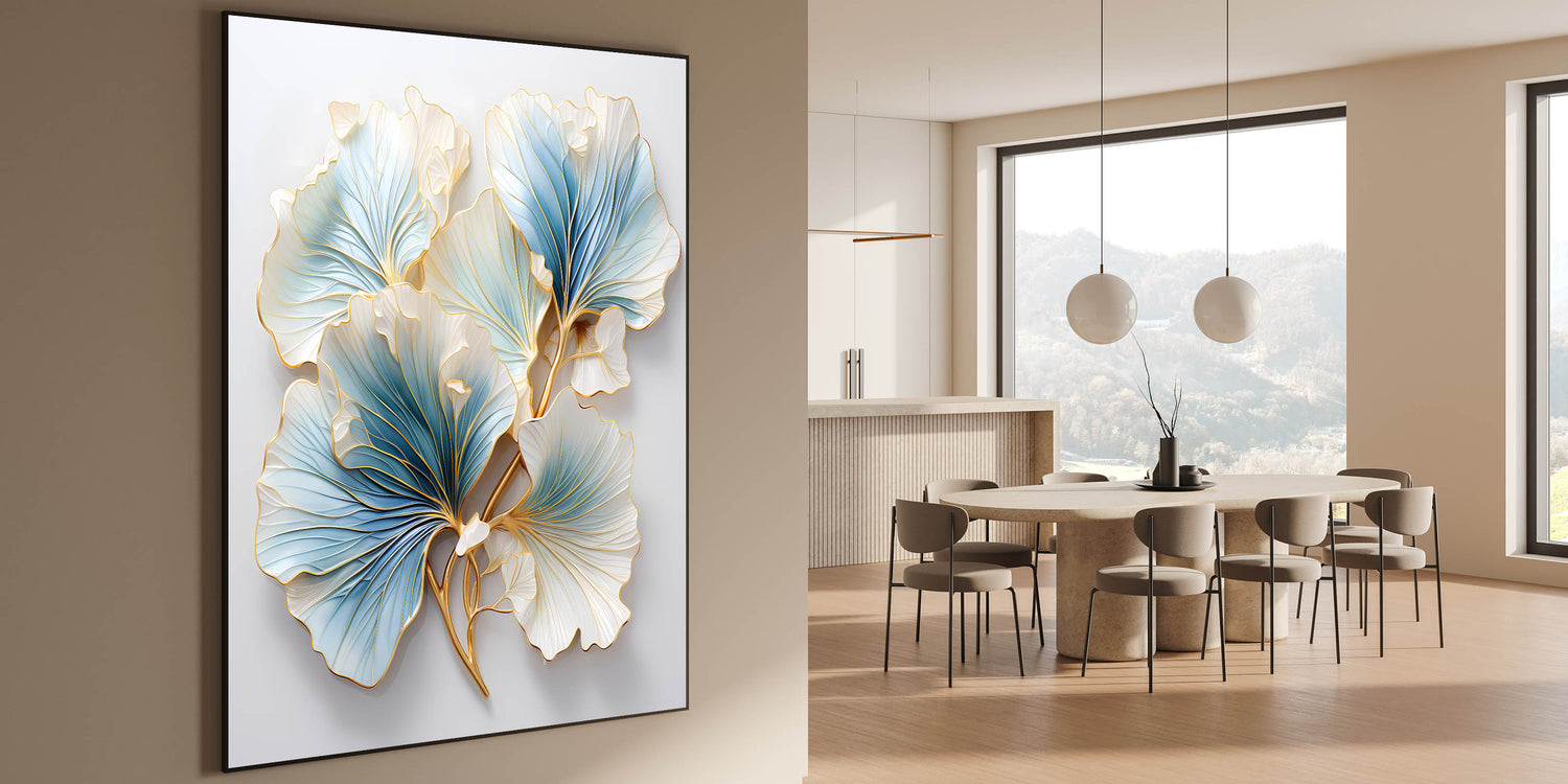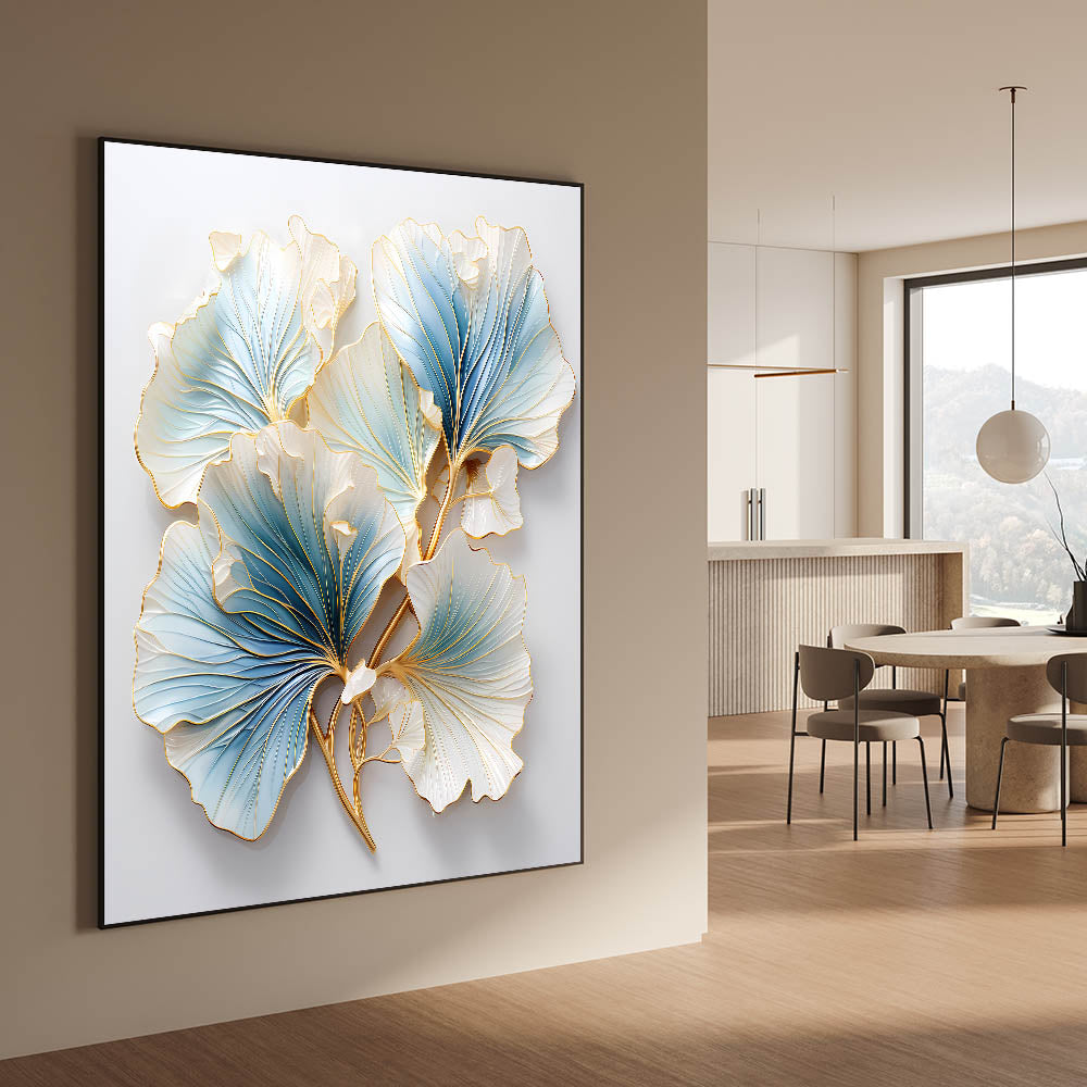 Enhance your dining space with this elegant dining room wall art, featuring a stunning floral-inspired design in soft blue, white, and gold. The intricate detailing and metallic accents bring a sense of luxury and sophistication, making it a perfect statement piece for contemporary and classic interiors. This framed dining room print blends artistic craftsmanship with timeless beauty, creating an inviting atmosphere.