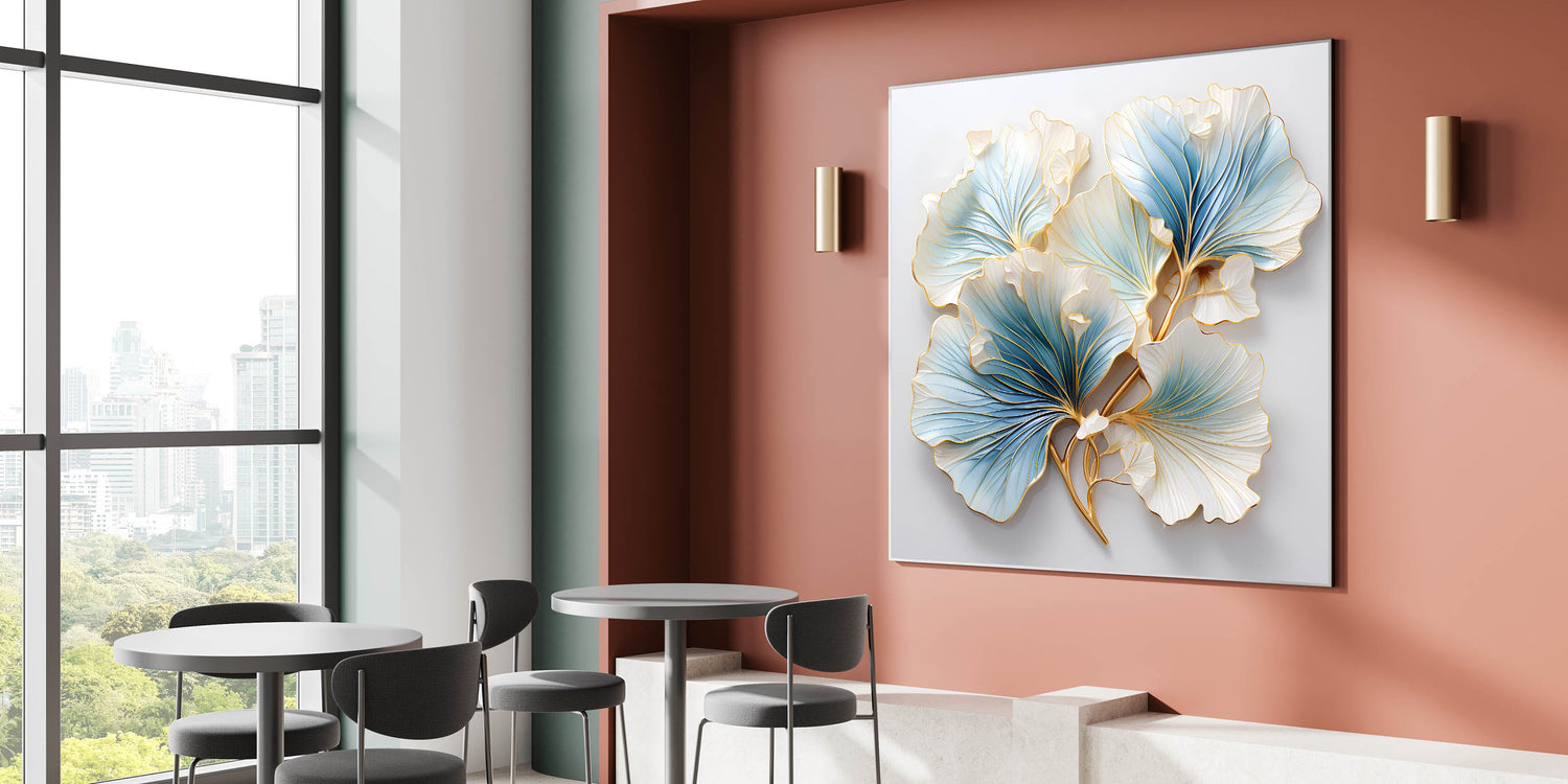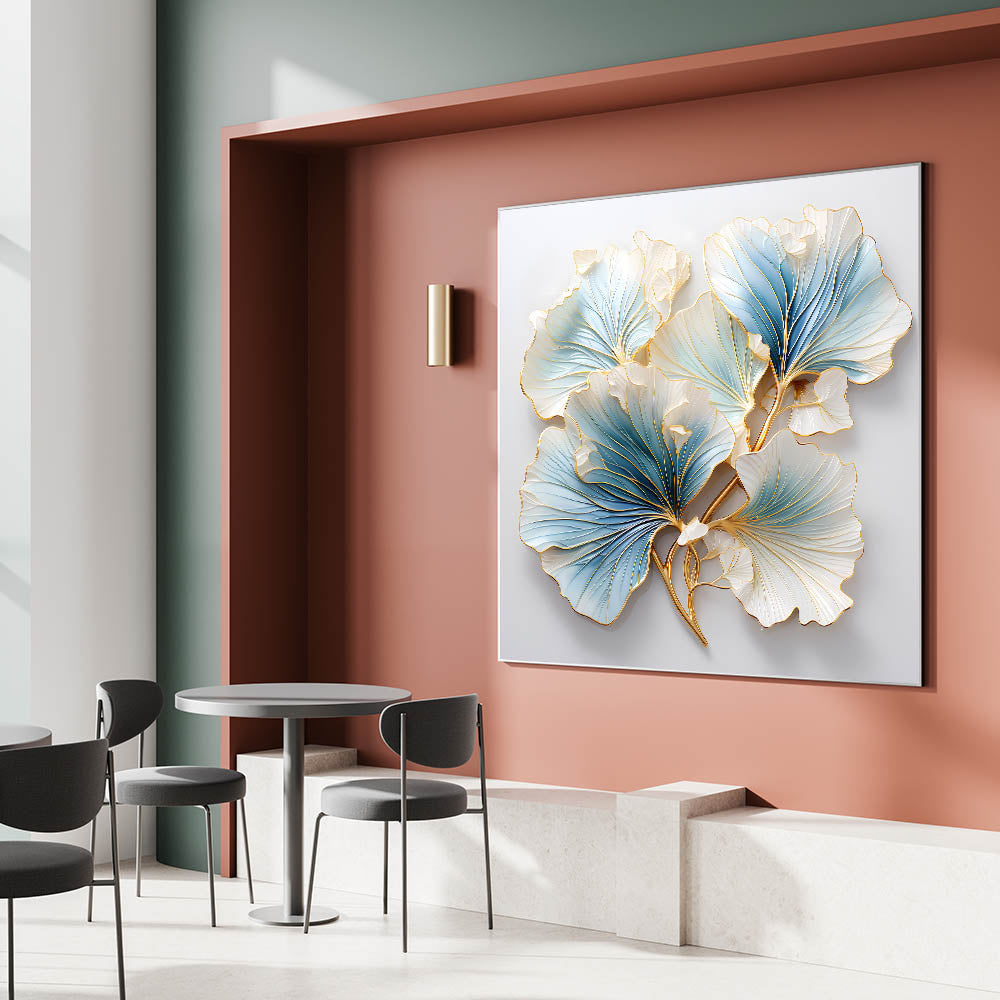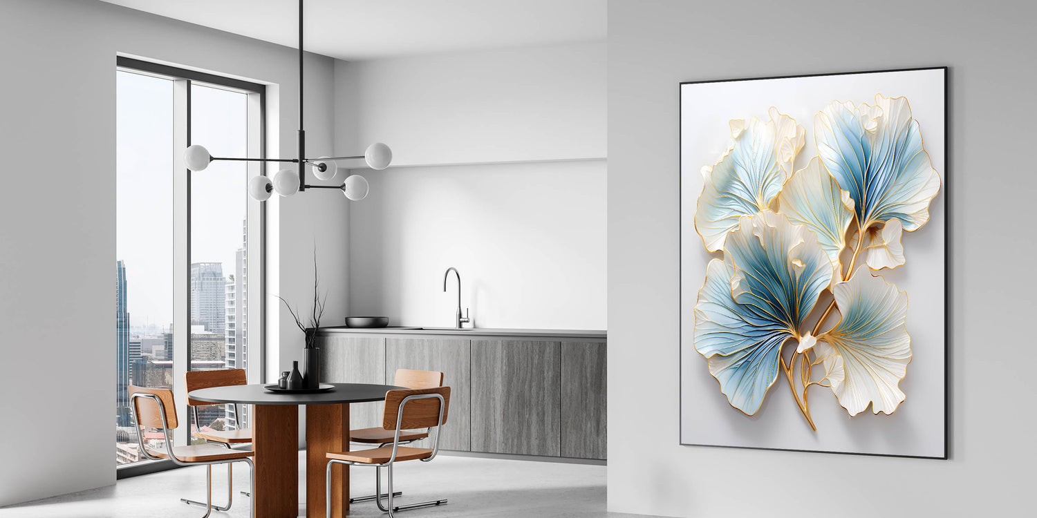 Enhance your dining space with this elegant dining room wall art, featuring a stunning floral-inspired design in soft blue, white, and gold. The intricate detailing and metallic accents bring a sense of luxury and sophistication, making it a perfect statement piece for contemporary and classic interiors. This framed dining room print blends artistic craftsmanship with timeless beauty, creating an inviting atmosphere.