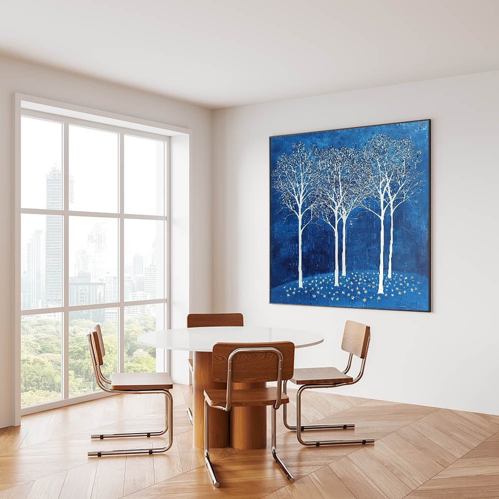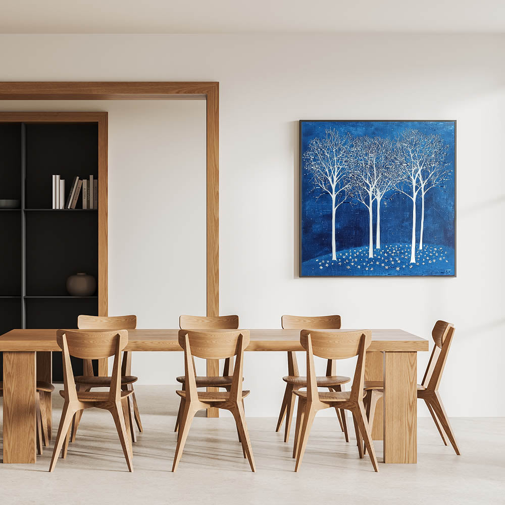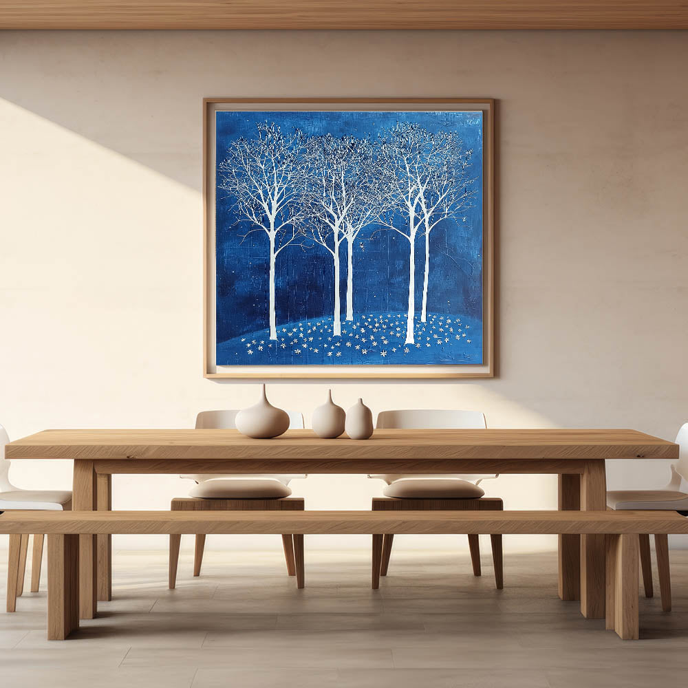 Create a captivating dining space with this dining room wall decor, featuring an enchanting winter forest scene in deep navy blue and crisp white. The intricate white tree silhouettes and twinkling stars create a serene, dreamlike ambiance, making this elegant dining room wall art a perfect addition to contemporary and classic interiors.