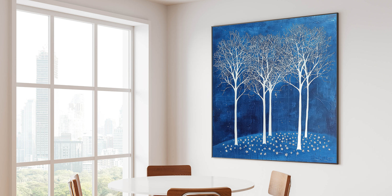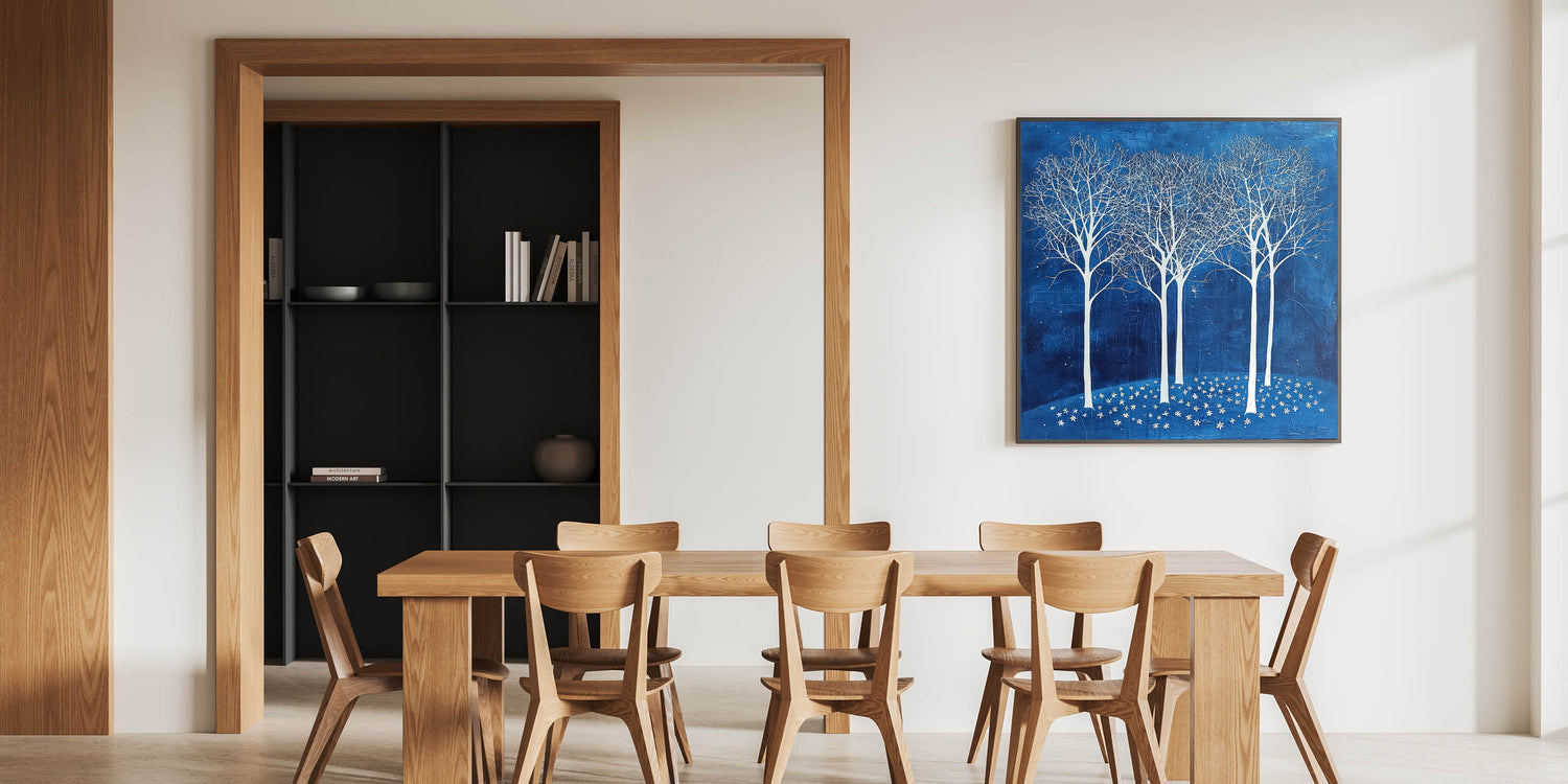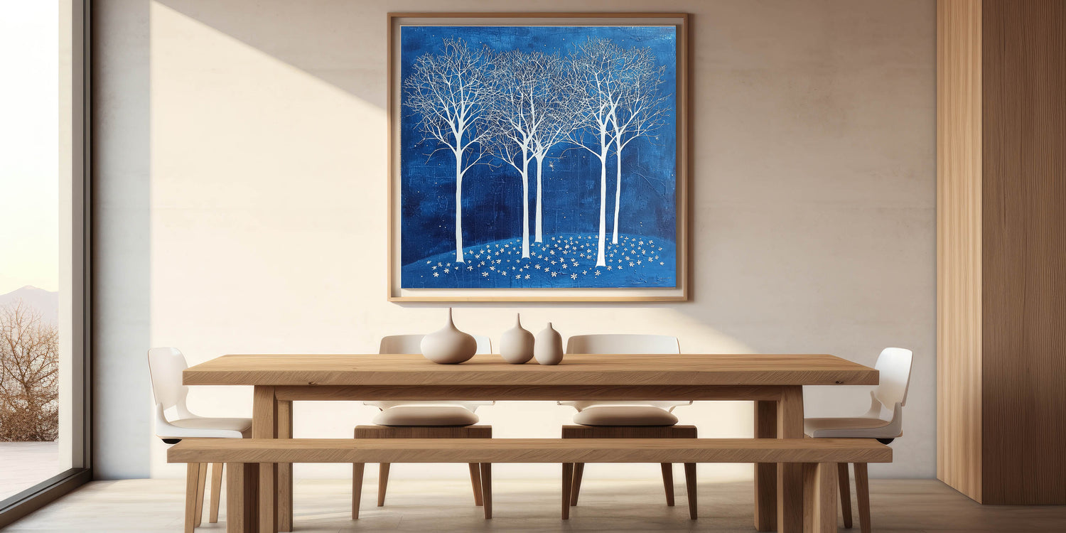 Create a captivating dining space with this dining room wall decor, featuring an enchanting winter forest scene in deep navy blue and crisp white. The intricate white tree silhouettes and twinkling stars create a serene, dreamlike ambiance, making this elegant dining room wall art a perfect addition to contemporary and classic interiors.
