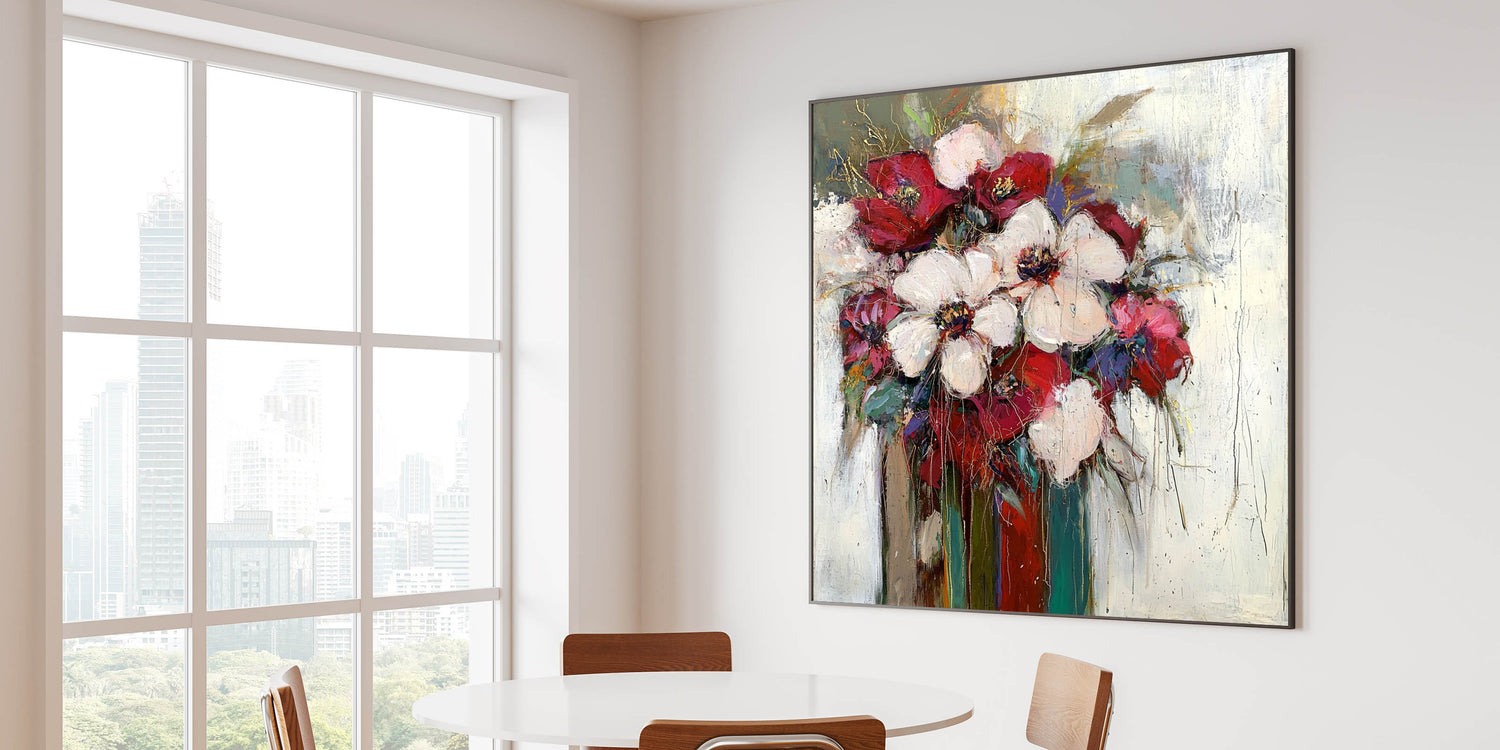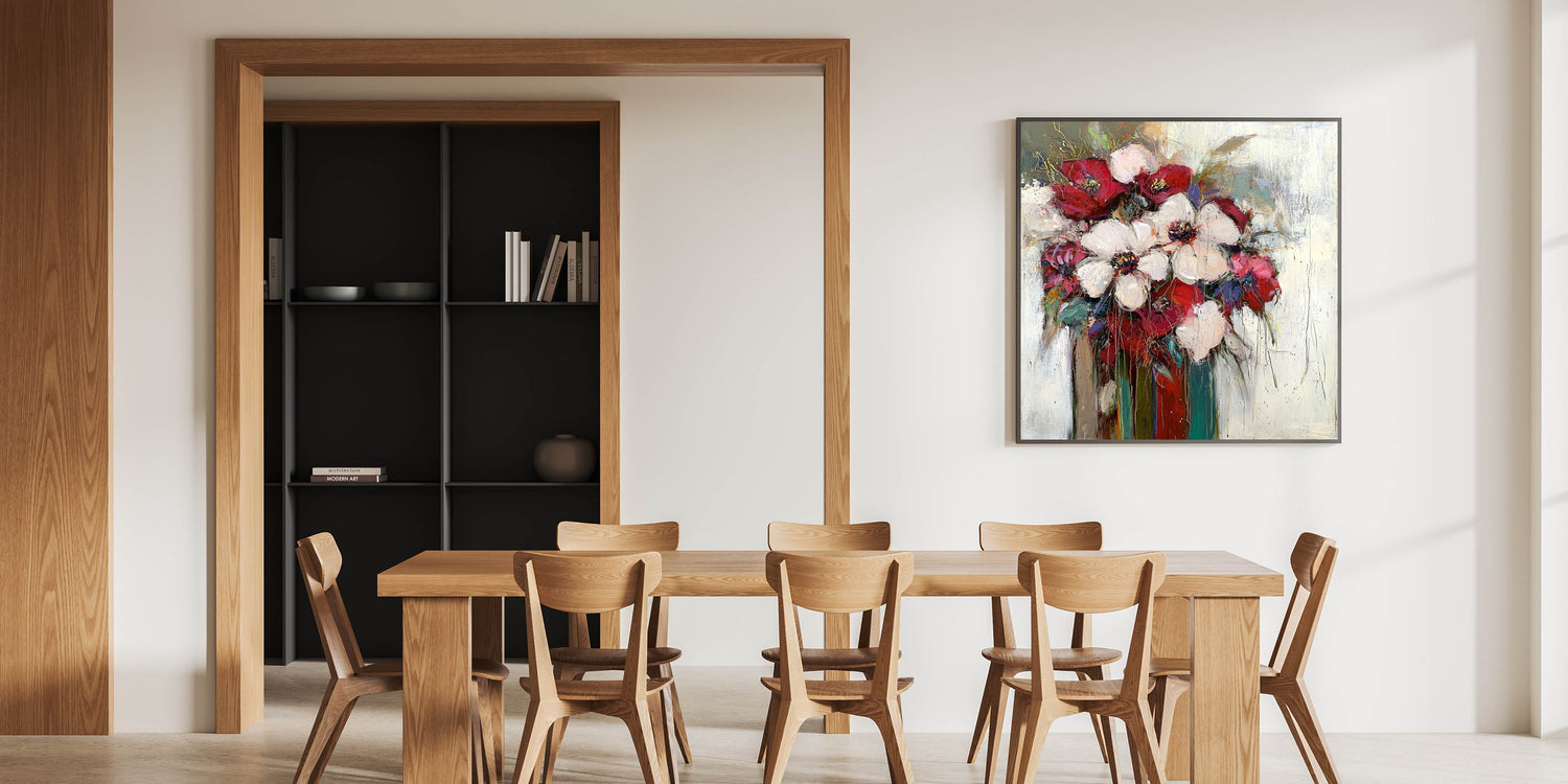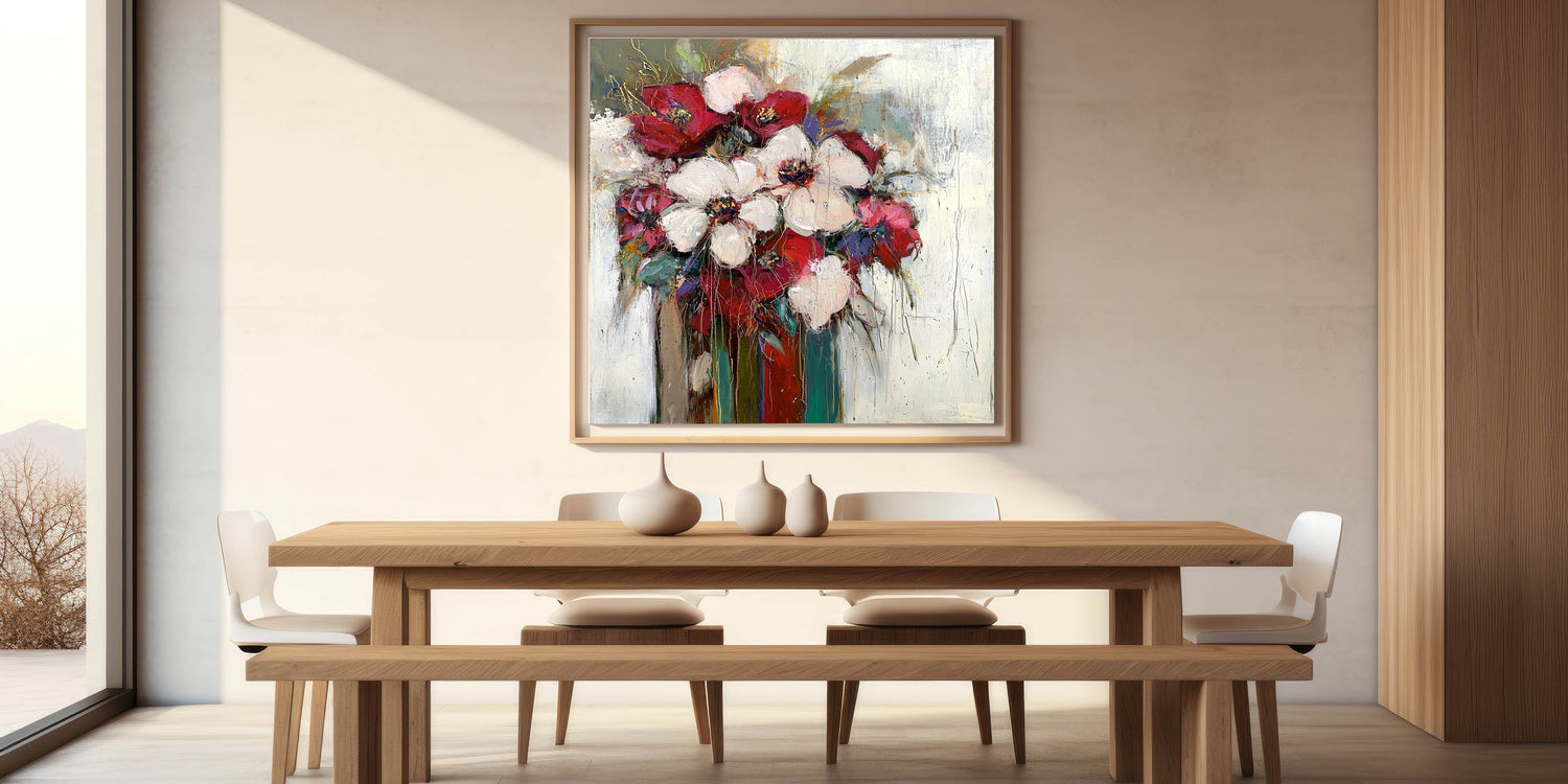 Add a sophisticated touch to your dining space with this elegant dining room wall art, featuring a stunning floral arrangement in burgundy, white, and green hues. The textured brushstrokes and rich color palette make this modern dining room art a statement piece, perfect for enhancing any dining setting.