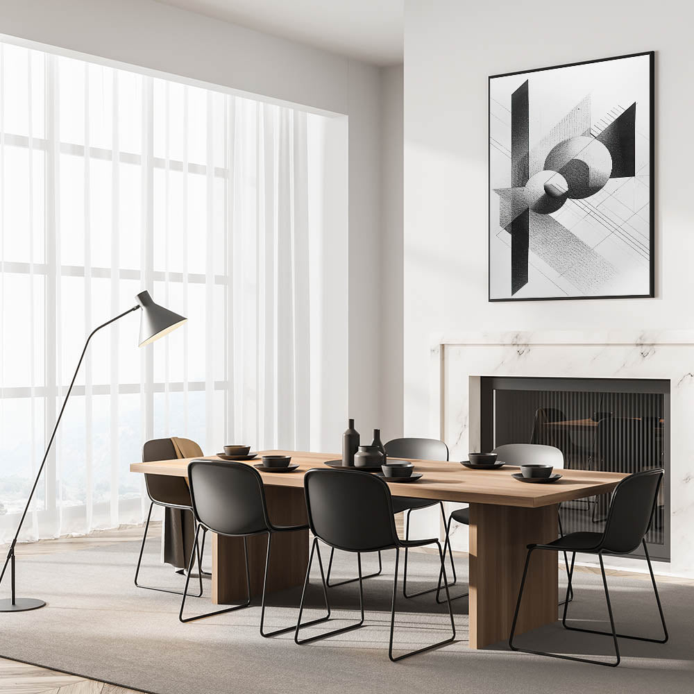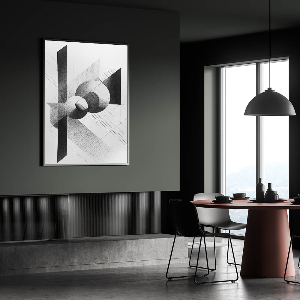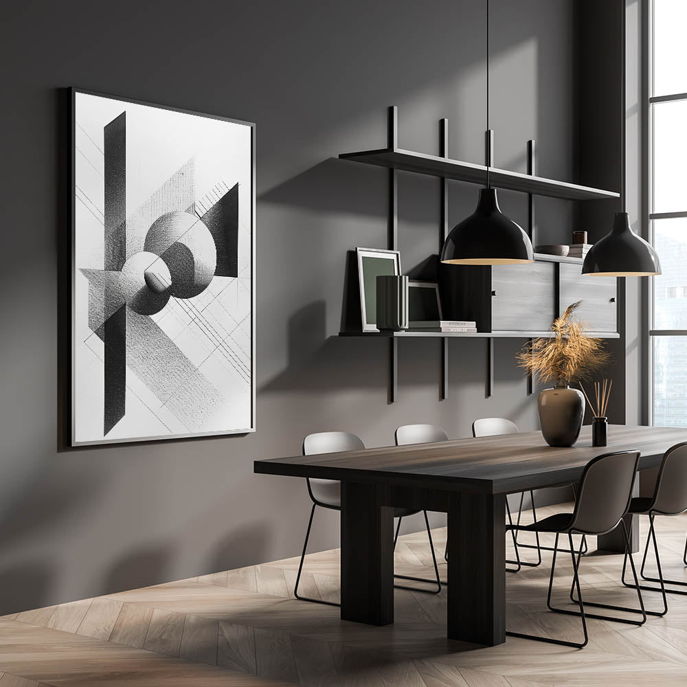 Enhance your dining area with this contemporary dining art piece, featuring a striking black-and-white geometric design. The interplay of sharp angles, bold contrasts, and intricate shading makes this dining room wall decor a sophisticated addition to modern interiors. Perfect for minimalist and industrial-style spaces, this piece blends artistic precision with modern elegance.