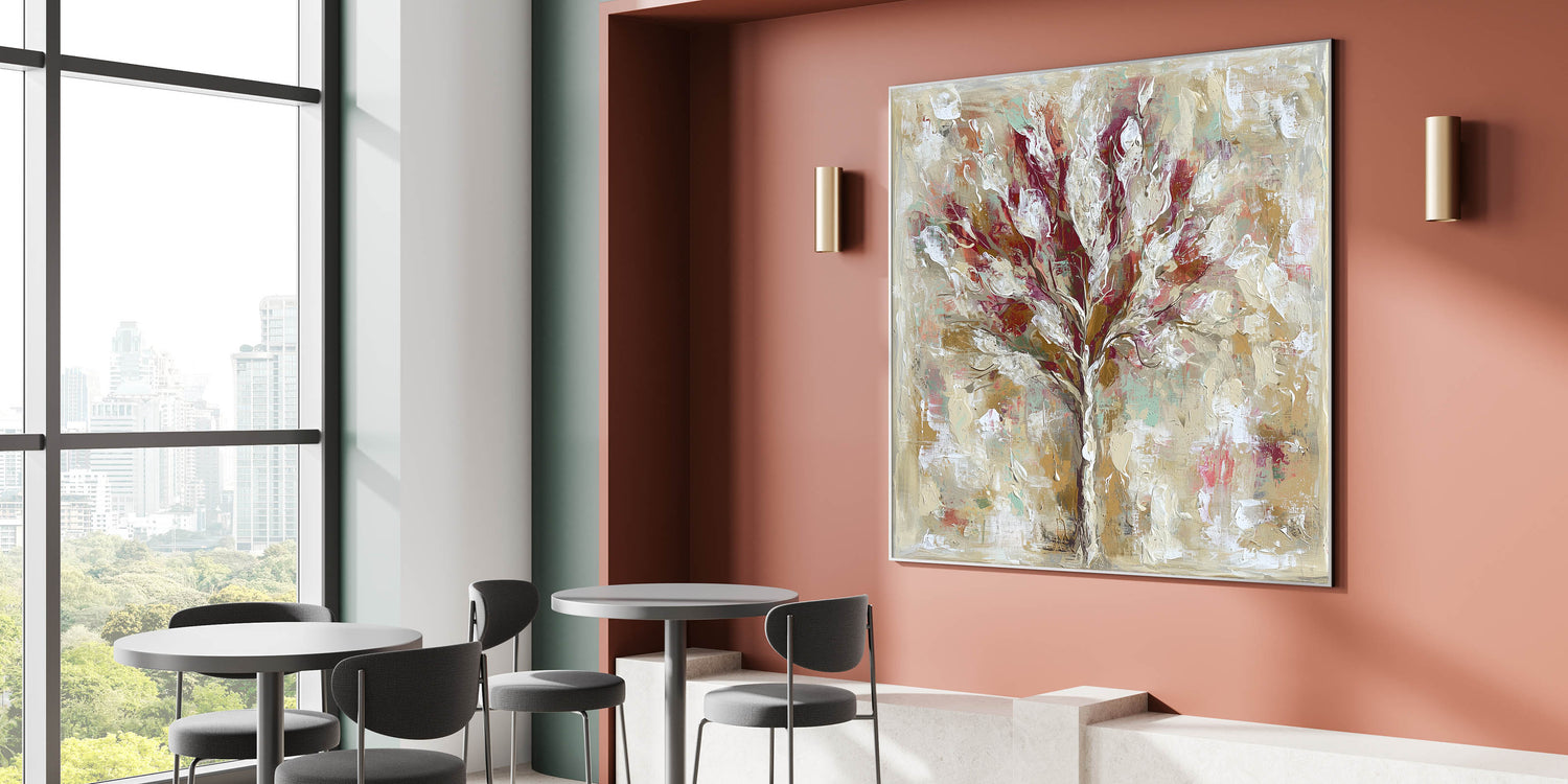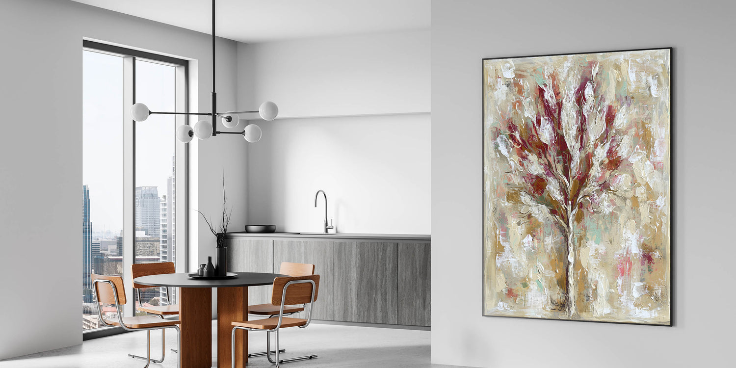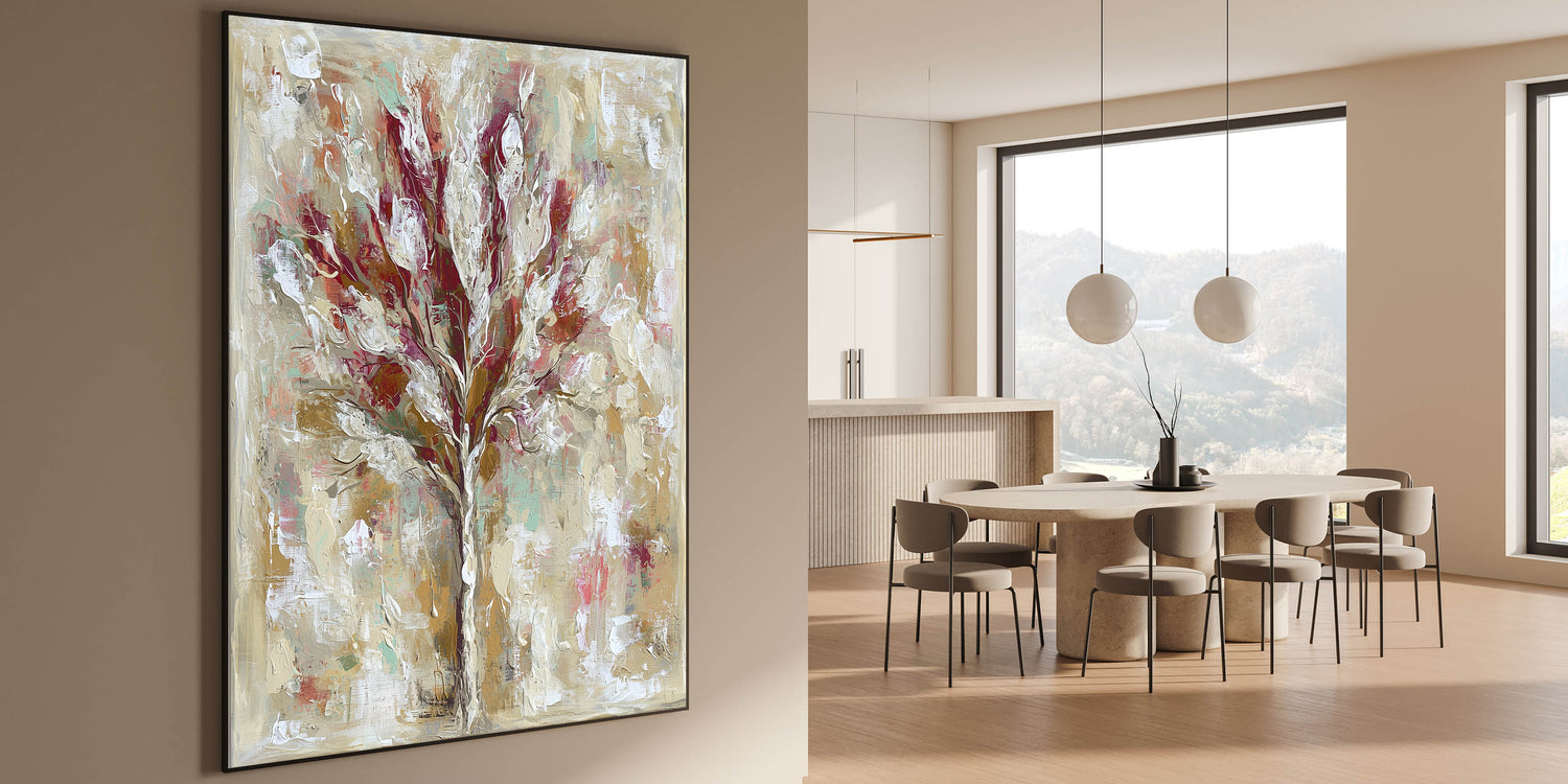 Bring warmth and sophistication to your dining space with this dining room wall decor, featuring a beautifully textured abstract tree. The dynamic blend of burgundy, beige, and gold tones creates a striking yet elegant centerpiece, making it ideal for a modern or classic dining area. Whether displayed as framed dining room prints, canvas art for dining areas, or acrylic dining room artwork, this piece adds depth and character to your walls.