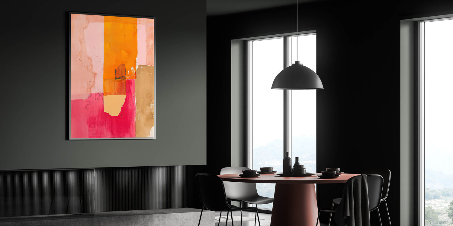 This high-quality canvas art for dining rooms brings warmth and vibrancy to any setting. Whether displayed as a framed dining room print or an acrylic dining room artwork, this contemporary abstract piece enhances your space with a lively and sophisticated touch.