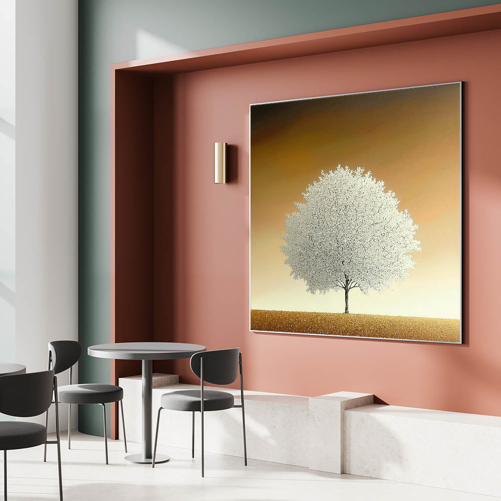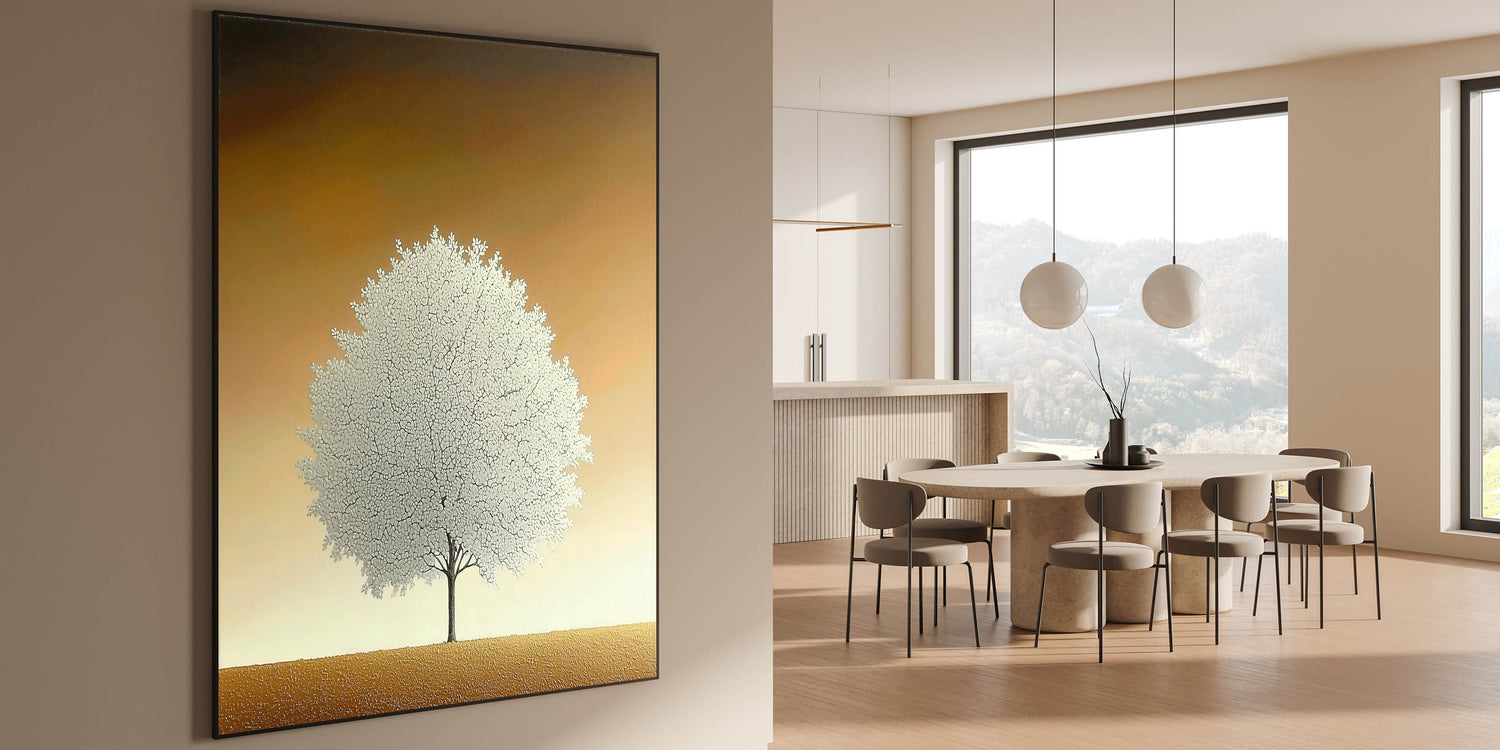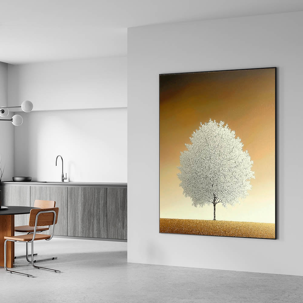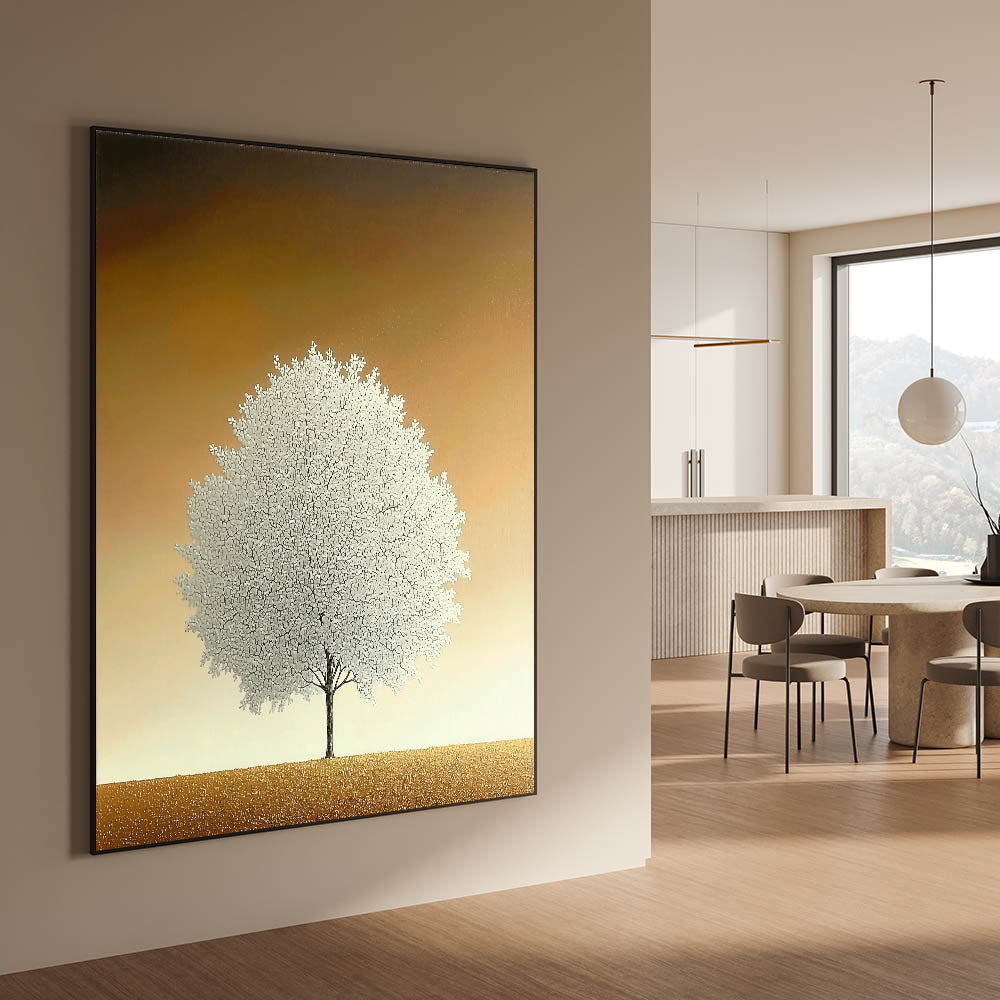 Enhance your dining space with this elegant dining room wall art, showcasing a beautifully detailed white tree against a warm, earthy background in beige and brown hues. This modern dining room art evokes a sense of peace and sophistication, making it an ideal centerpiece for contemporary interiors.