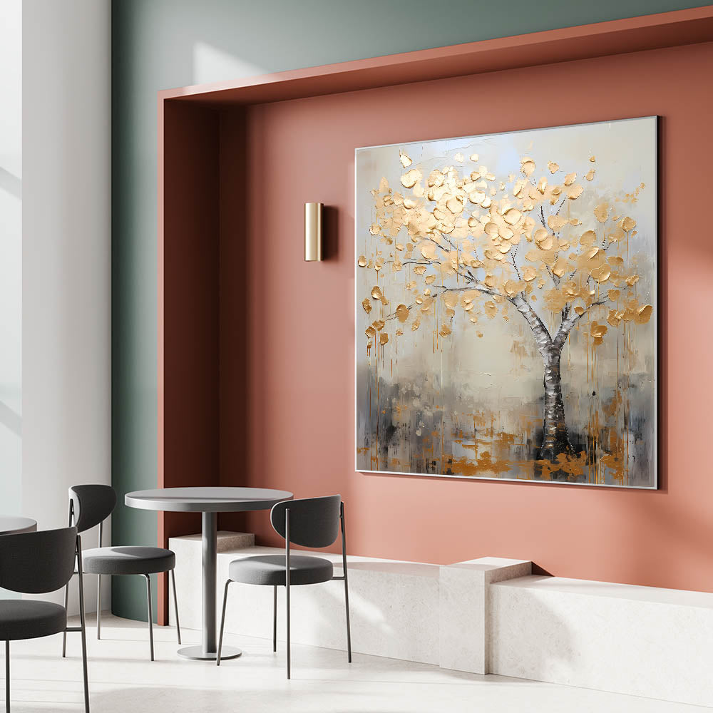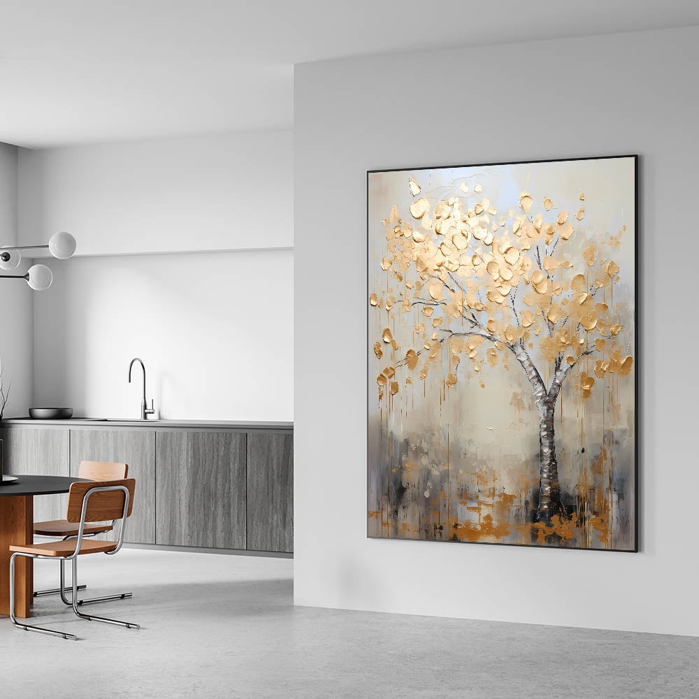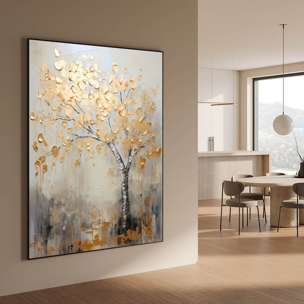 Enhance your dining space with elegant dining room wall art featuring a stunning gold and gray tree design. This modern dining room art showcases a delicate balance of metallic gold leaves against a neutral gray and beige background, making it a luxurious yet calming statement piece. Whether displayed as framed dining room prints, acrylic dining room artwork, or canvas art for dining areas, this piece radiates sophistication and warmth.