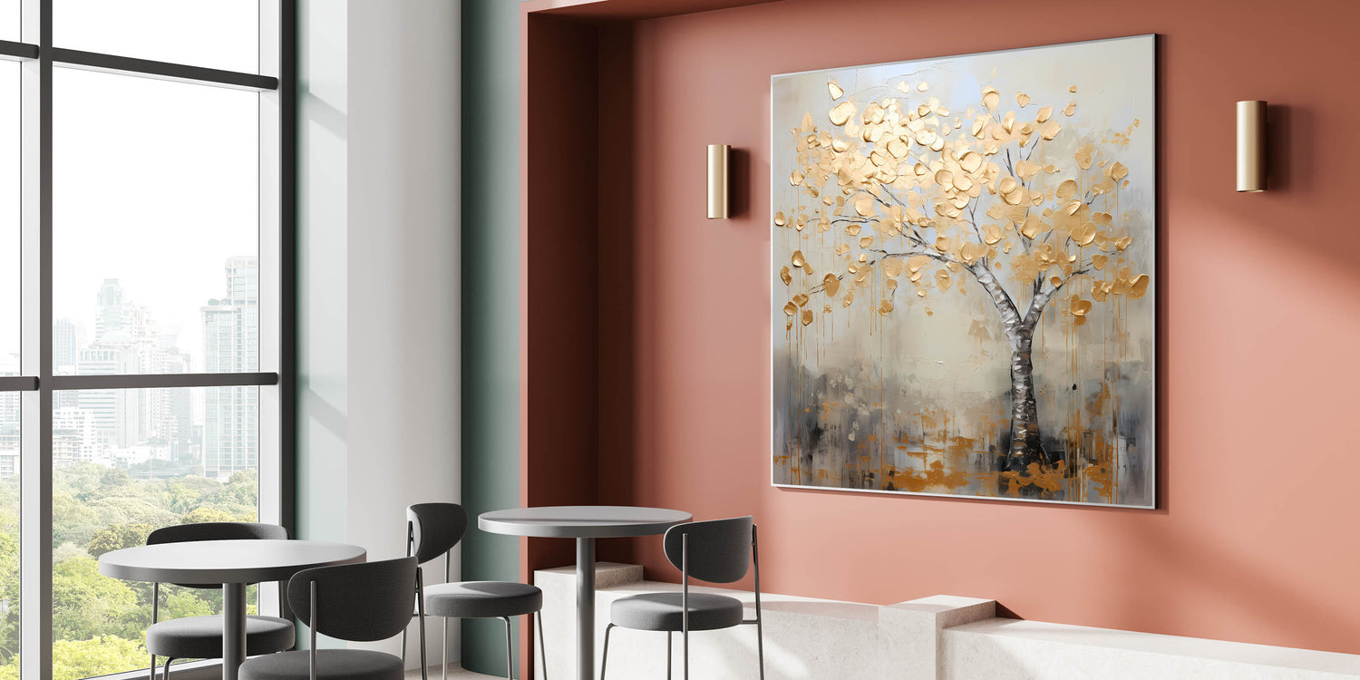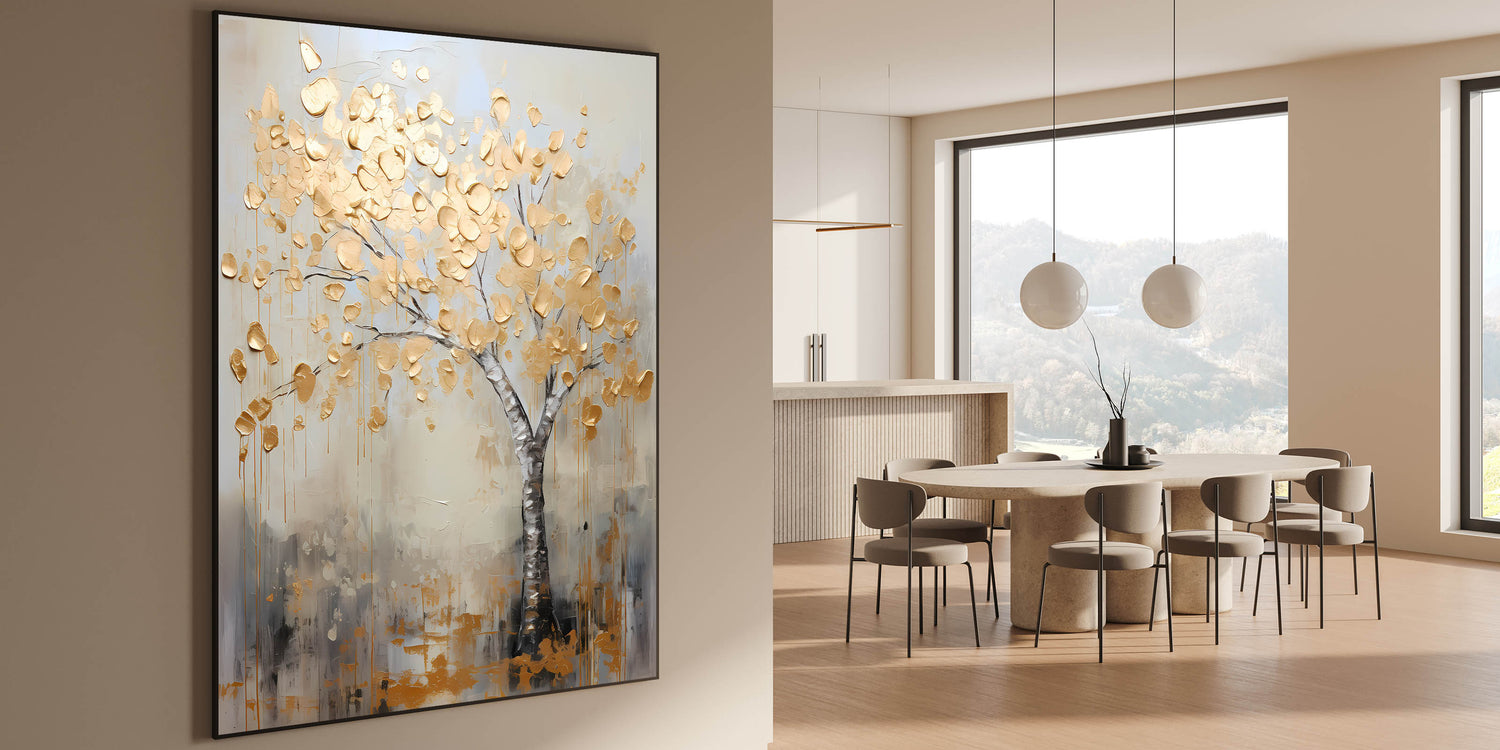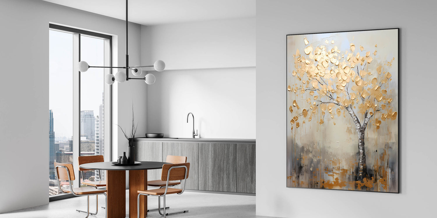This contemporary dining art piece adds warmth, depth, and elegance to any space. Whether you are looking for canvas art for dining areas or a framed dining room print, this gold tree design will create a timeless and inviting ambiance.