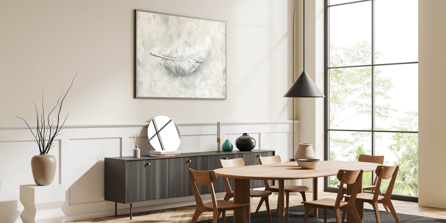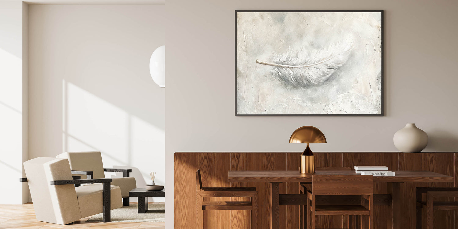 Enhance your dining area with this elegant dining room wall art, featuring a soft, feather-inspired abstract design. The delicate brush strokes and subtle textures create a serene and modern aesthetic, perfect for contemporary dining spaces. This piece brings a sense of tranquility, making it an ideal focal point for your dining room.