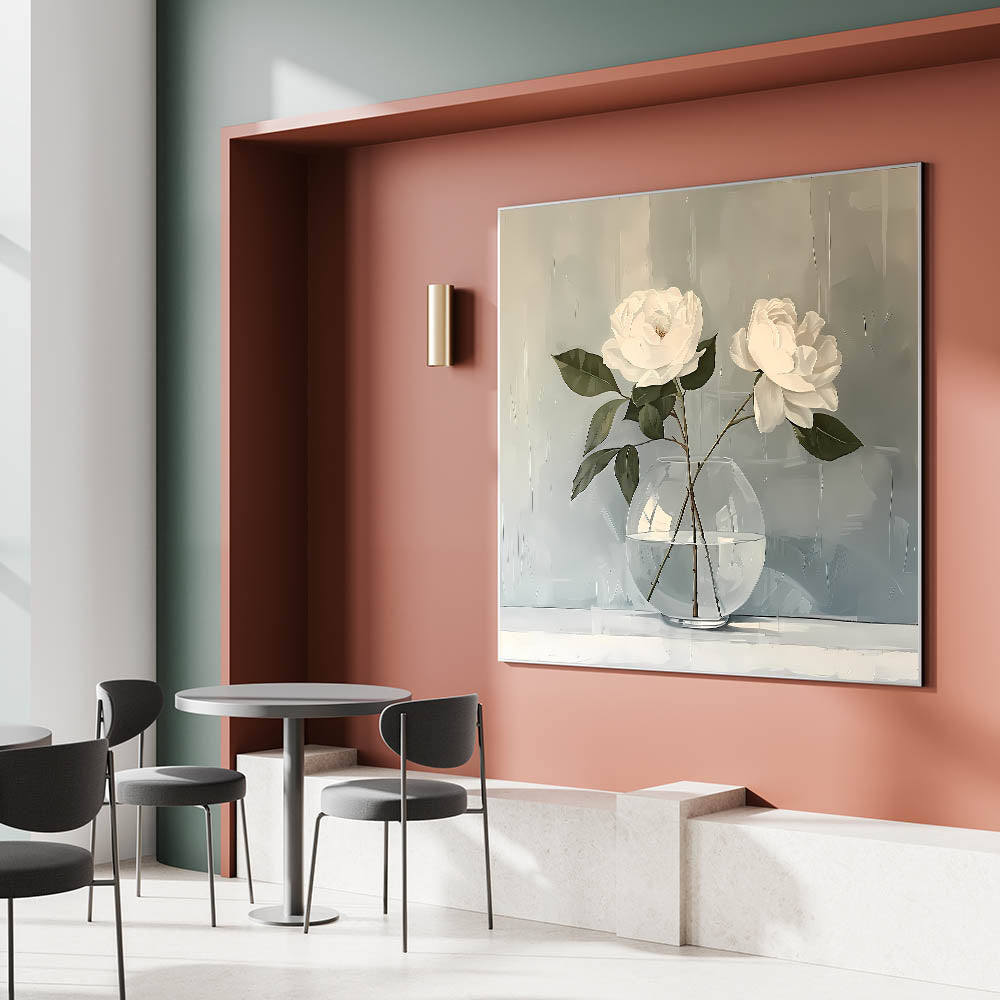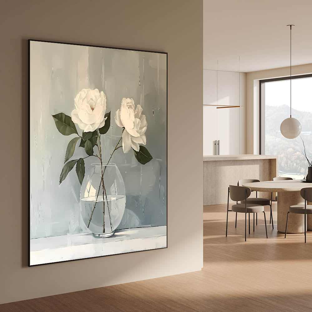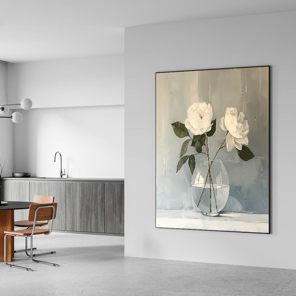 Enhance your dining area with this elegant dining room wall art, featuring a serene floral design with soft, neutral tones. This modern dining room art is a timeless piece that adds sophistication and tranquility to your space. The delicate white roses in a glass vase create a calming ambiance, making it a perfect addition to contemporary and classic interiors alike.