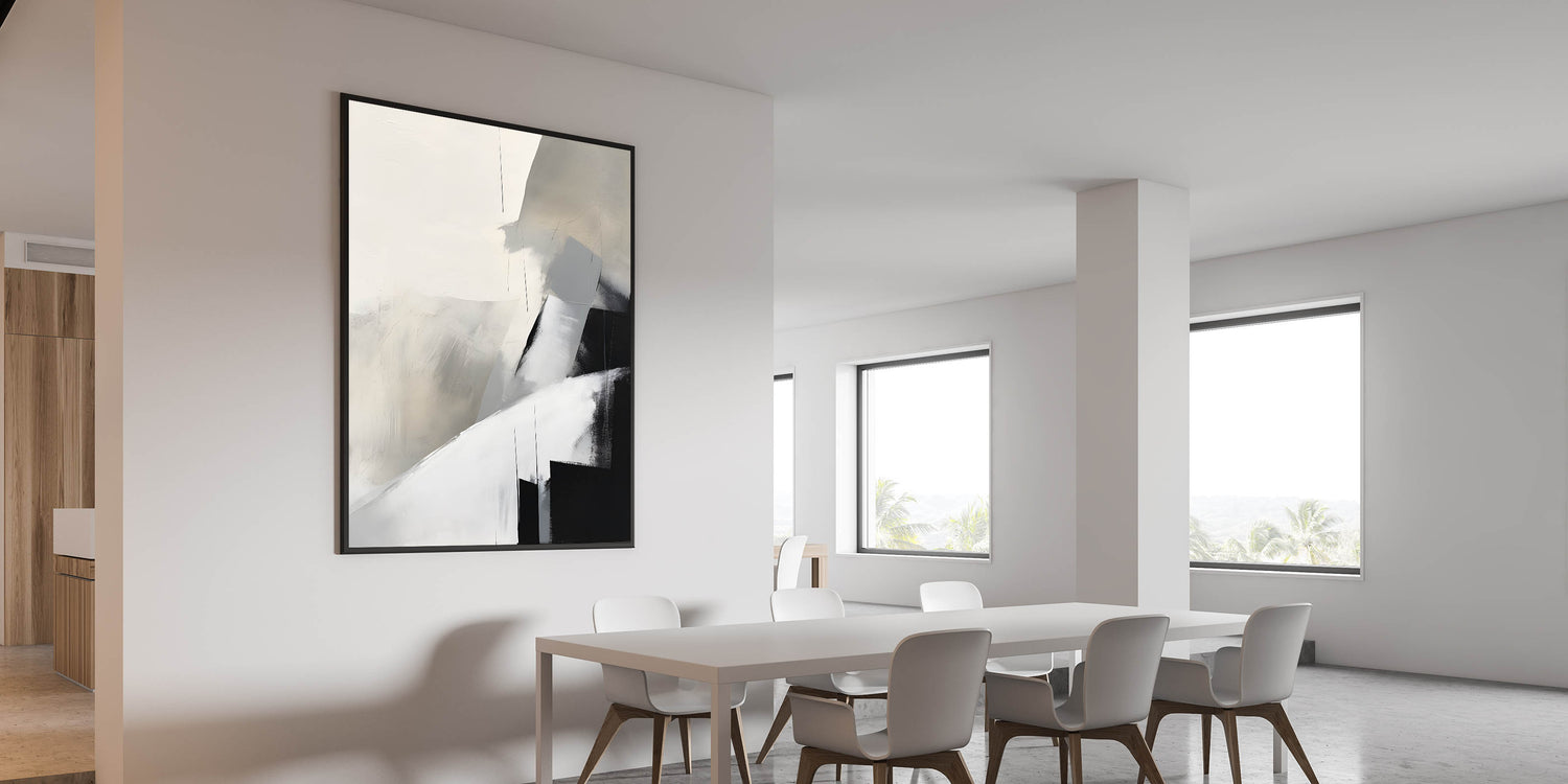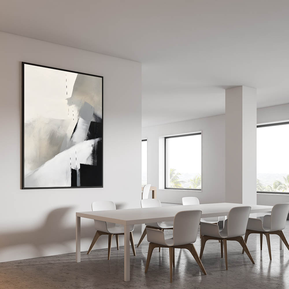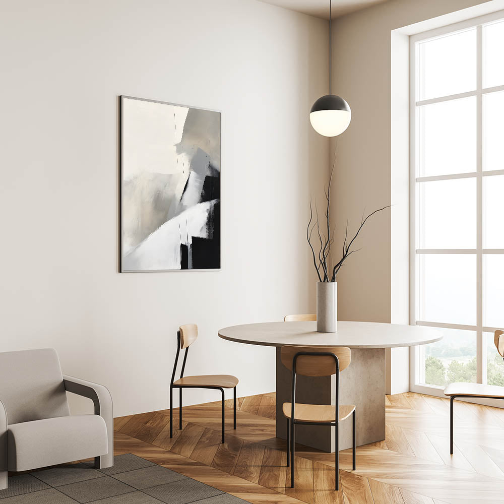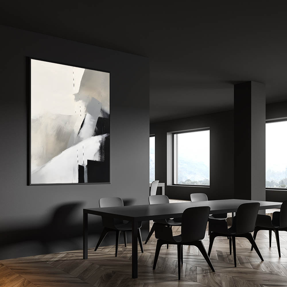 Elevate your dining space with this framed dining room print, featuring a stunning abstract composition in neutral tones of black, gray, and beige. The soft, blended textures and bold geometric elements create a modern dining area art piece, perfect for contemporary interiors. This artwork is available in high-quality canvas art for dining rooms, framed prints, and acrylic glass art for dining room walls, ensuring a versatile and stylish fit for your décor.