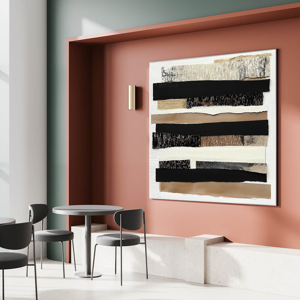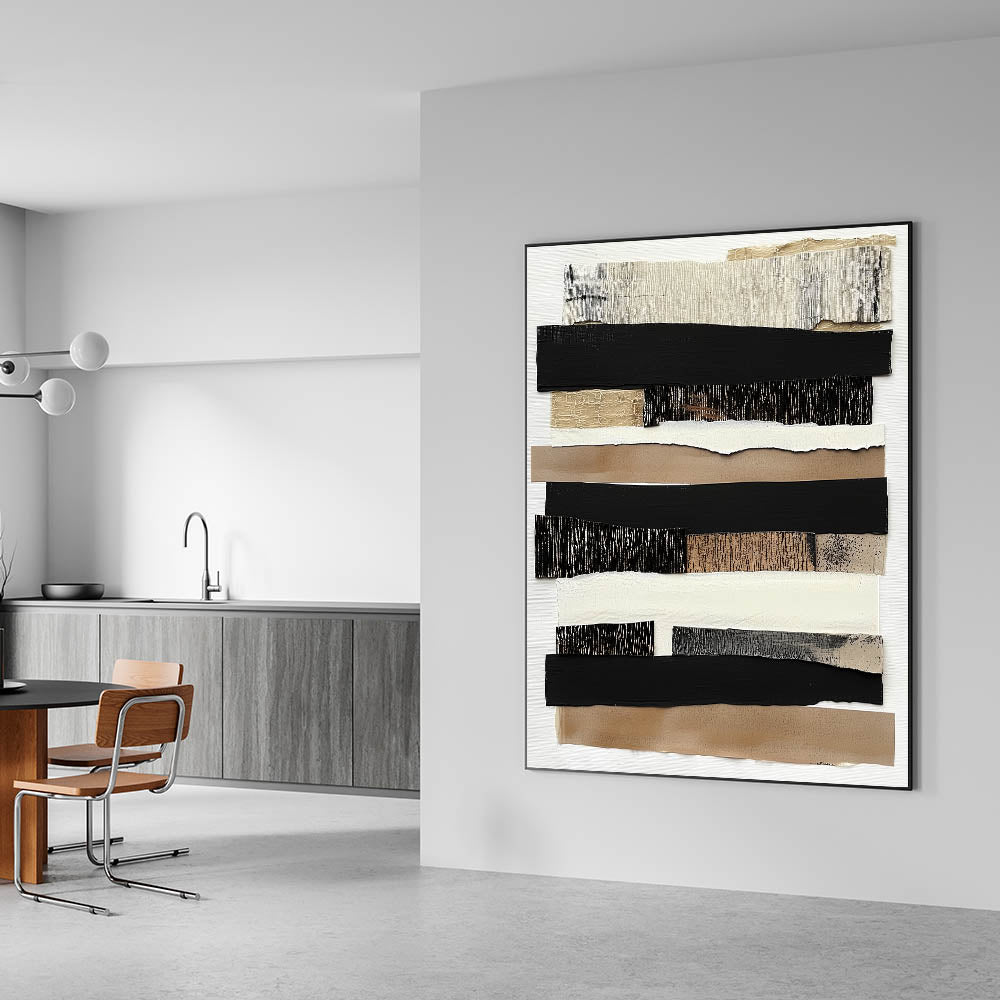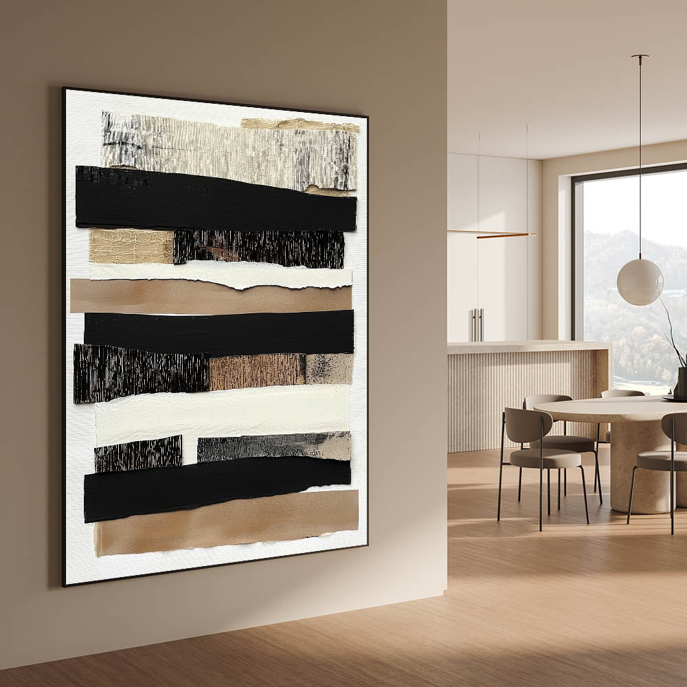 Add a touch of modern sophistication to your dining area with this framed dining room print, featuring a striking black, beige, and brown abstract design. The unique layered composition brings depth and texture, making it a stylish focal point for contemporary interiors. Whether your dining space follows a minimalist, rustic, or industrial aesthetic, this artwork blends effortlessly into various decor styles.