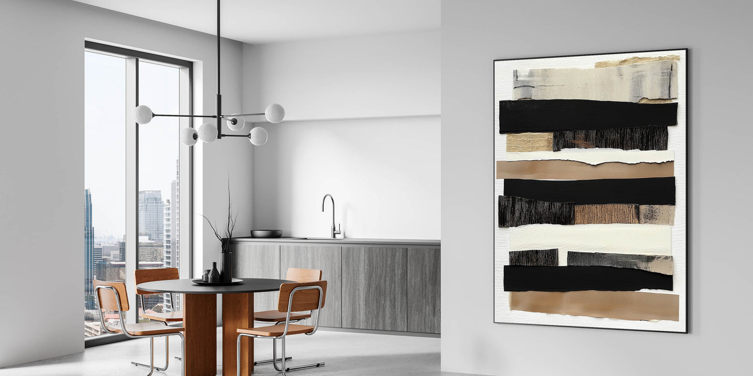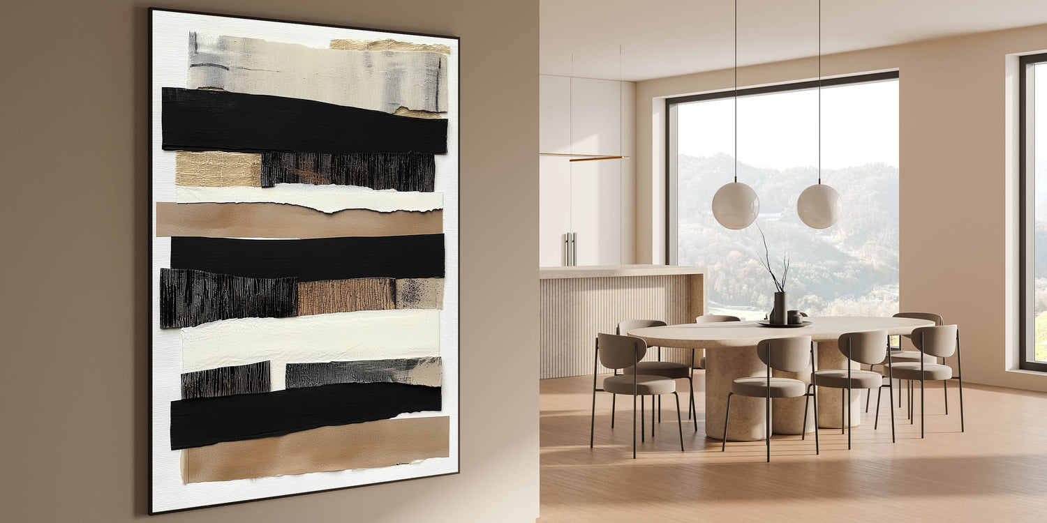 Perfect for those who appreciate contemporary dining art pieces, this framed and canvas dining room art brings warmth and modern elegance to your dining area. Its neutral color palette ensures it complements various dining room designs.