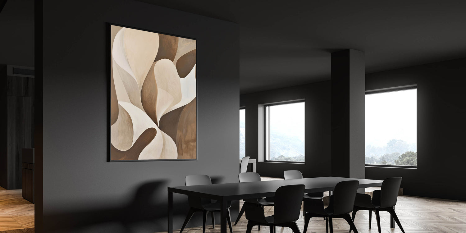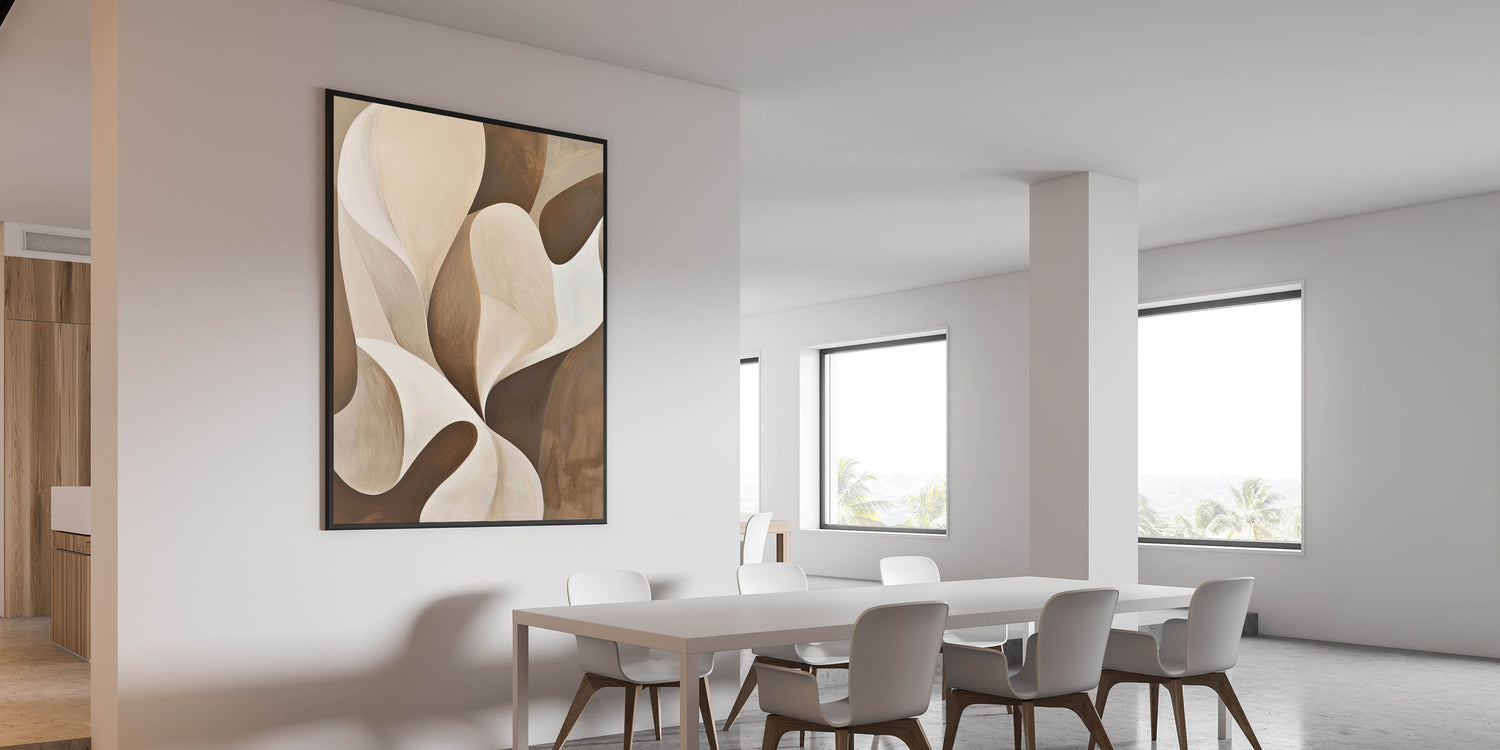 Elevate your dining area with this framed dining room print, featuring a mesmerizing abstract composition in warm beige, brown, and cream tones. Designed to bring elegance and a modern touch to your space, this contemporary dining art piece seamlessly blends into various interior styles, from minimalist to upscale decor.