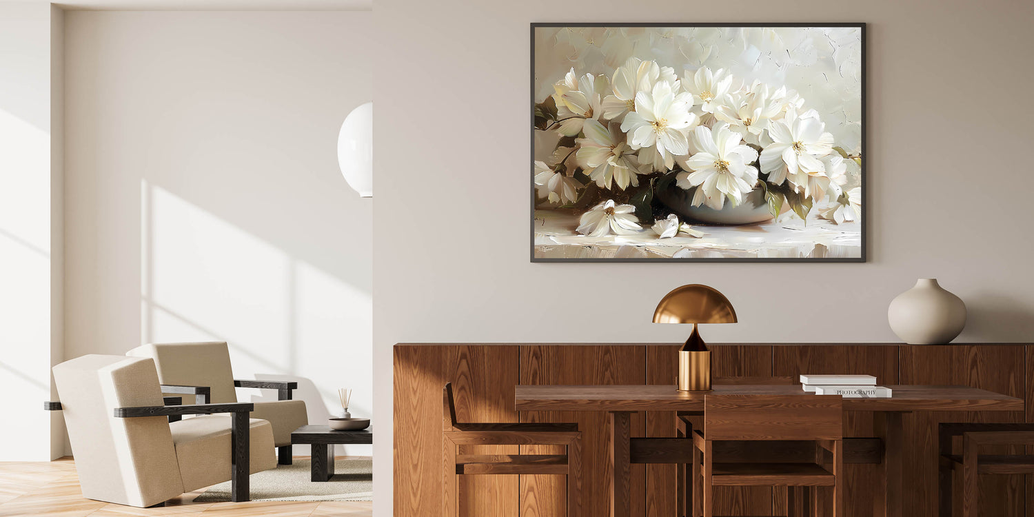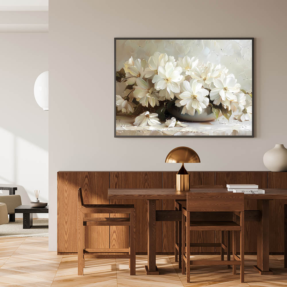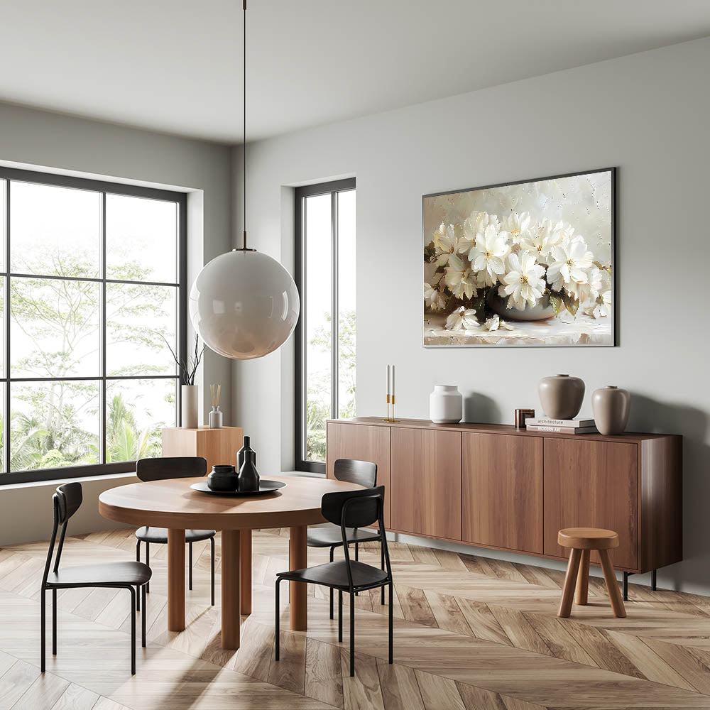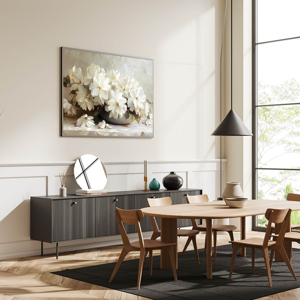 Bring elegance and charm to your dining space with this framed dining room print, featuring a delicate floral arrangement in soft beige, white, and green tones. The beautifully painted flowers exude sophistication, making this canvas art for dining area a perfect addition to classic, modern, or rustic interiors. The gentle brushstrokes and warm hues create a serene and inviting ambiance, enhancing your dining room wall decor.