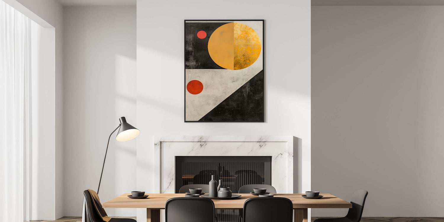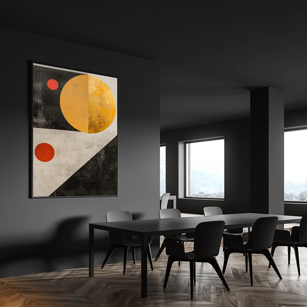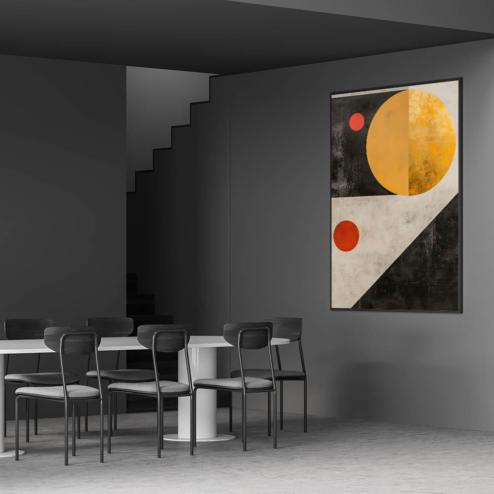 Enhance your dining area with this bold and modern dining room wall art. This geometric piece features a striking combination of black, gold, and red, adding a sophisticated yet contemporary touch to any dining space. The balance of abstract shapes and metallic hues creates an eye-catching focal point that complements various interior styles.