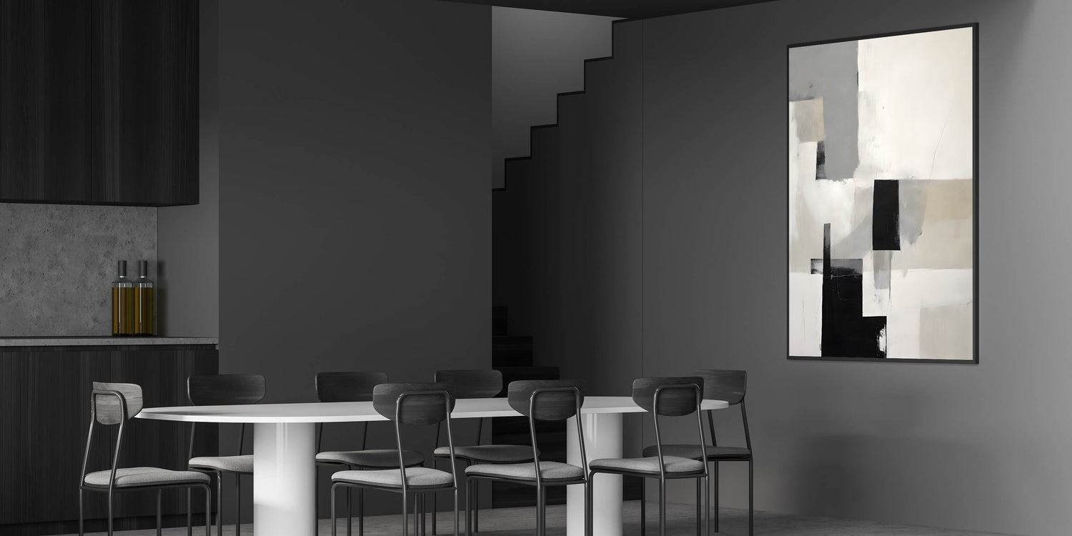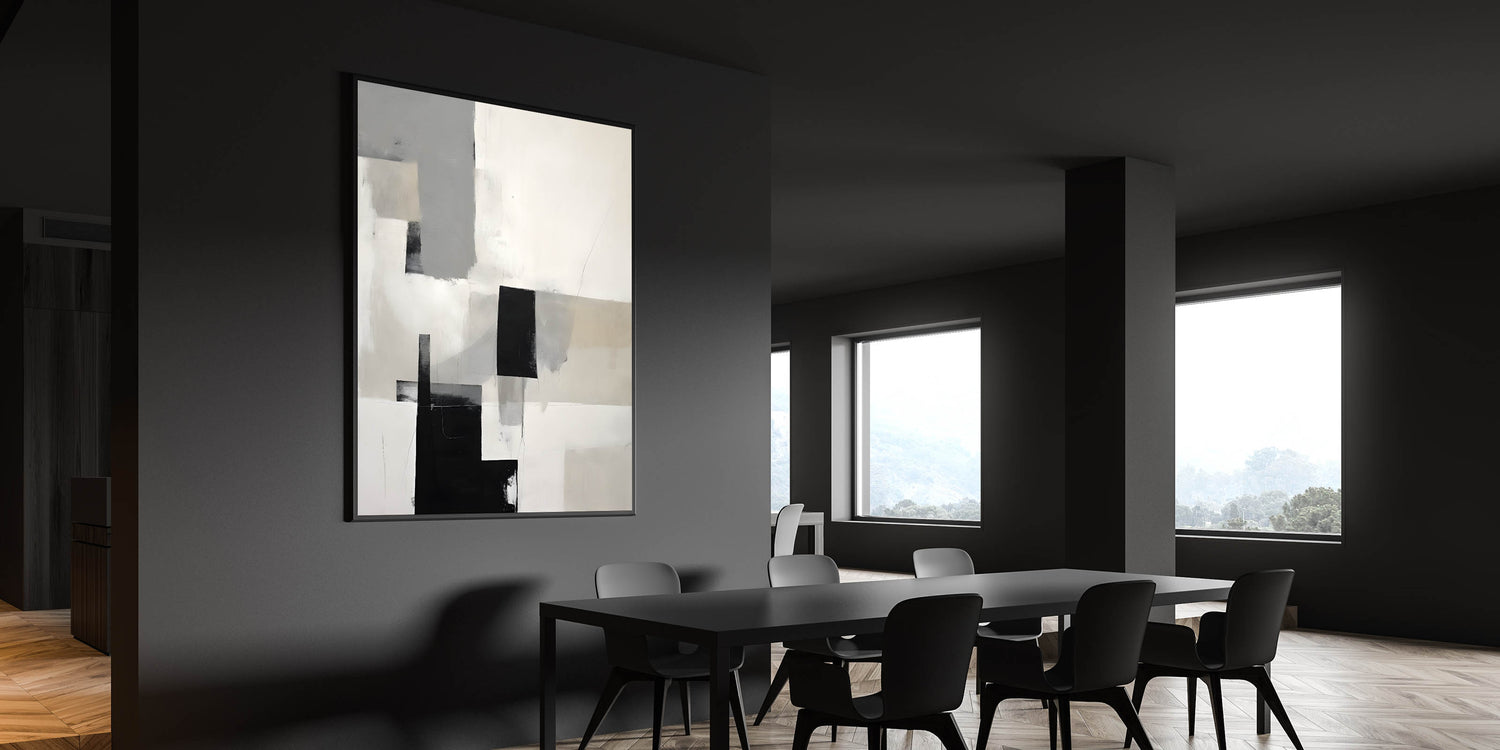 Transform your dining space with this framed dining room print, featuring a sophisticated abstract design in black, gray, and white. The modern geometric composition blends elegance with simplicity, making it the perfect statement piece for contemporary dining art pieces. Whether you're looking for high-quality canvas art for dining rooms or acrylic glass art for dining room walls, this artwork is available in multiple formats to suit your décor.