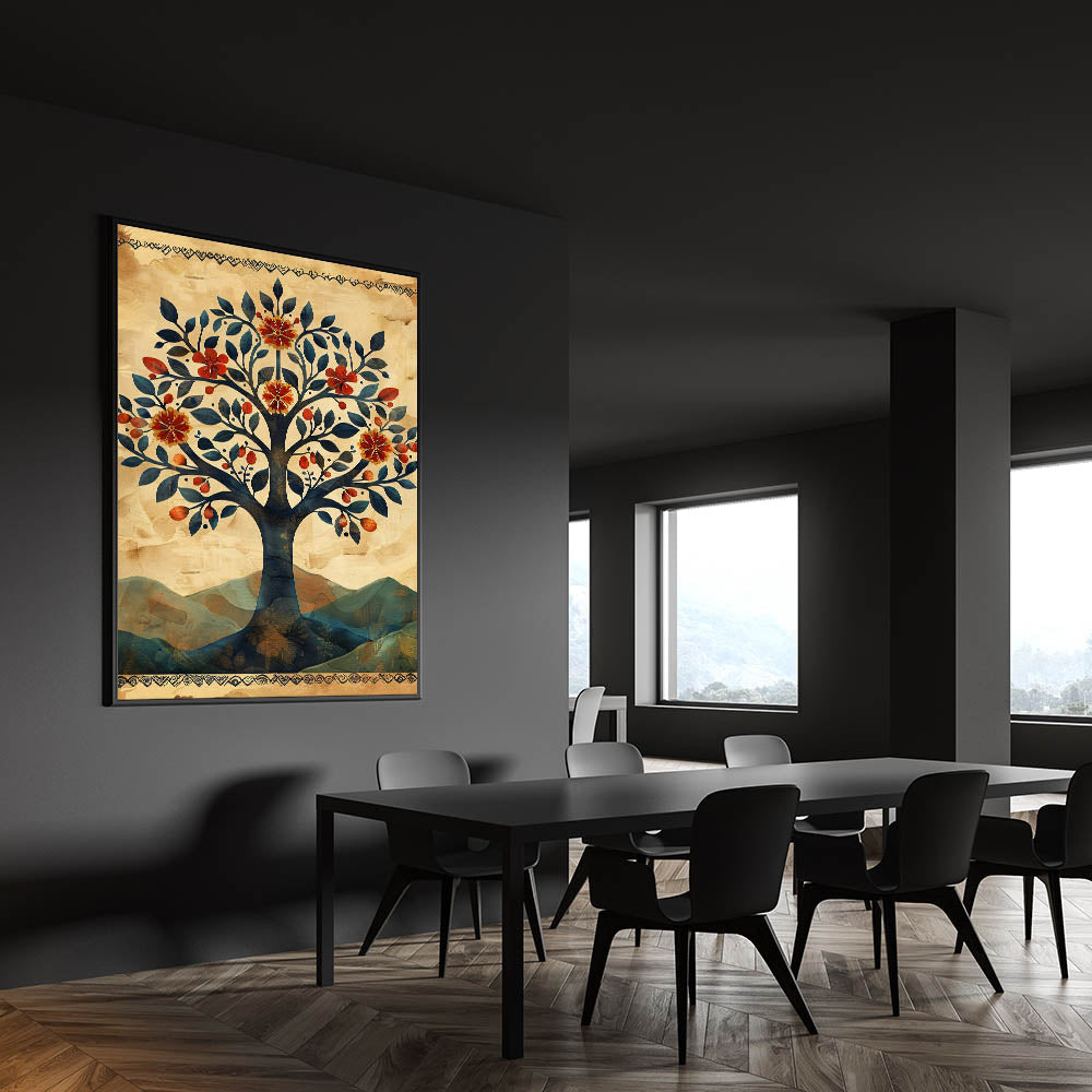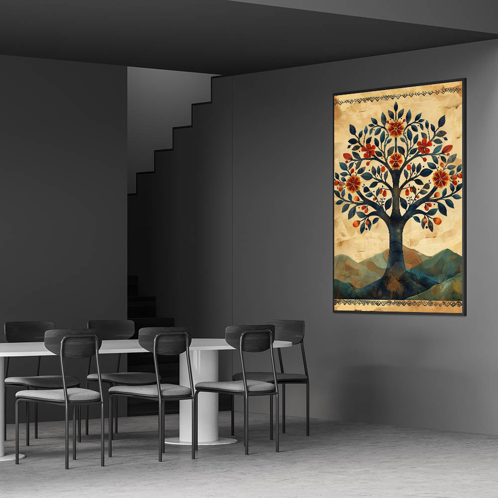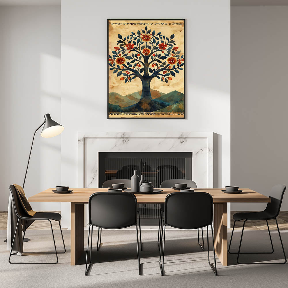 Enhance your dining space with this framed dining room print, featuring a beautifully intricate folk art tree design. The deep navy blue leaves contrast against the warm beige and earthy tones, while vibrant orange flowers add a striking pop of color. This canvas art for dining area is inspired by traditional vintage aesthetics, making it a perfect addition to rustic, bohemian, or eclectic interiors.
