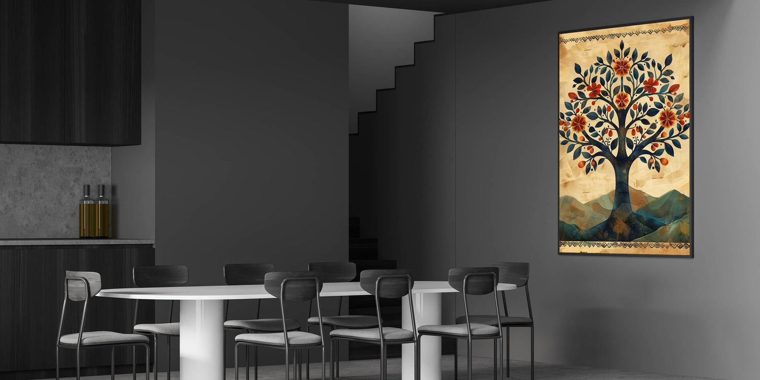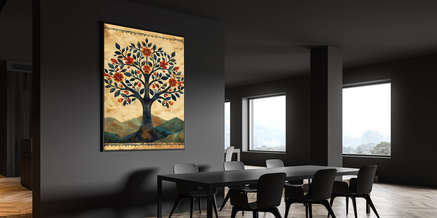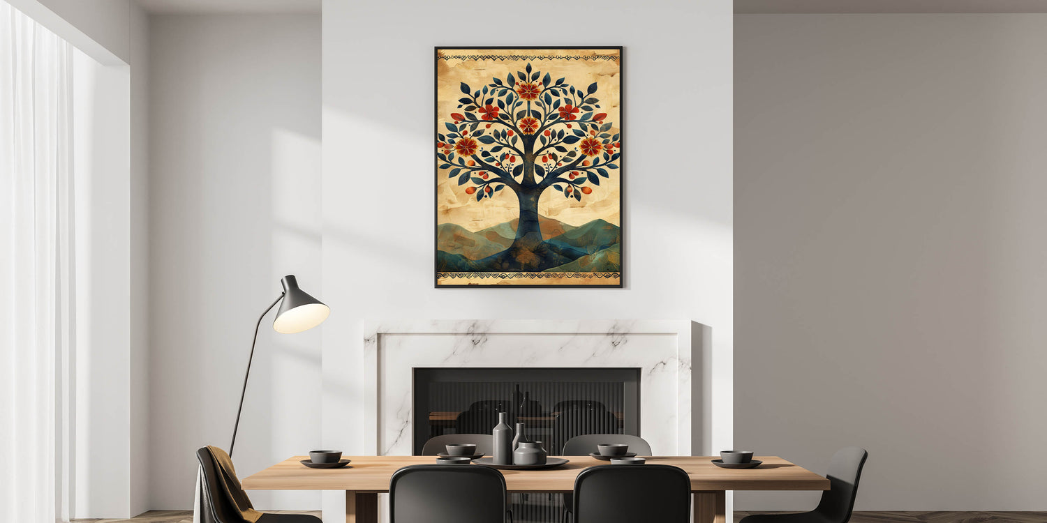 Enhance your dining space with this framed dining room print, featuring a beautifully intricate folk art tree design. The deep navy blue leaves contrast against the warm beige and earthy tones, while vibrant orange flowers add a striking pop of color. This canvas art for dining area is inspired by traditional vintage aesthetics, making it a perfect addition to rustic, bohemian, or eclectic interiors.