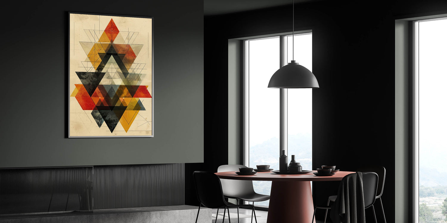 Enhance your dining space with this elegant dining room wall art, featuring a striking geometric design in warm hues of black, gold, orange, and red. Perfect for contemporary interiors, this modern dining room art blends abstract elements with precise lines, creating a visually engaging piece that complements a stylish dining setting.