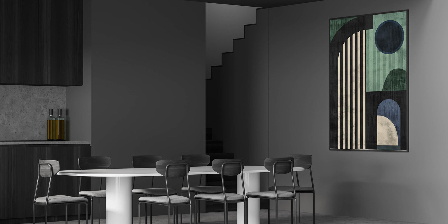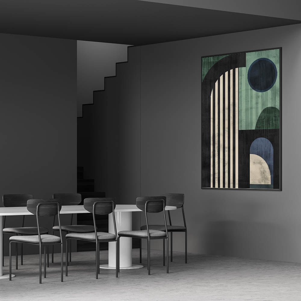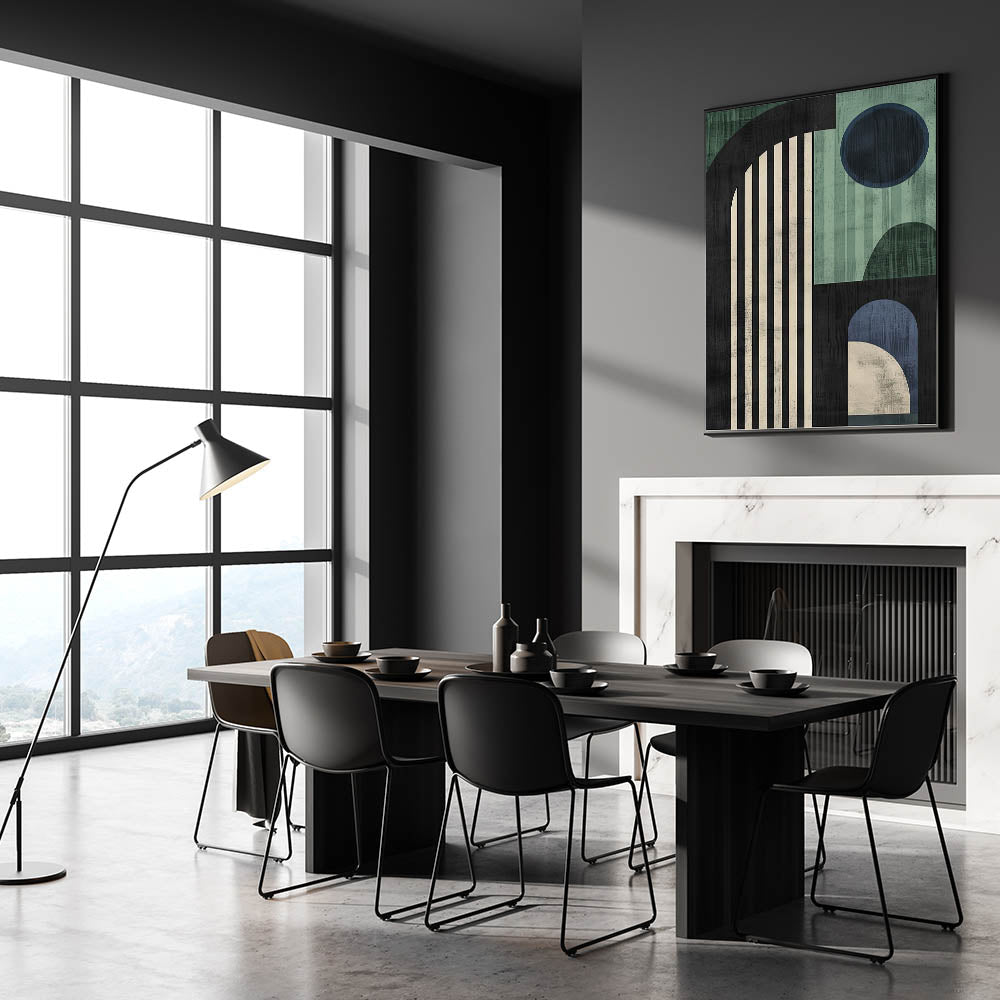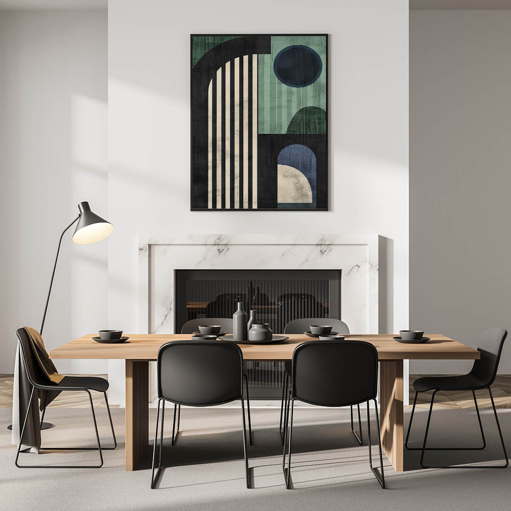 Elevate your dining area with this elegant dining room wall art, showcasing a striking geometric design in shades of green, black, beige, and navy blue. The bold interplay of shapes and lines makes this contemporary dining art piece a perfect addition to dining room wall decor, blending modern sophistication with artistic depth.