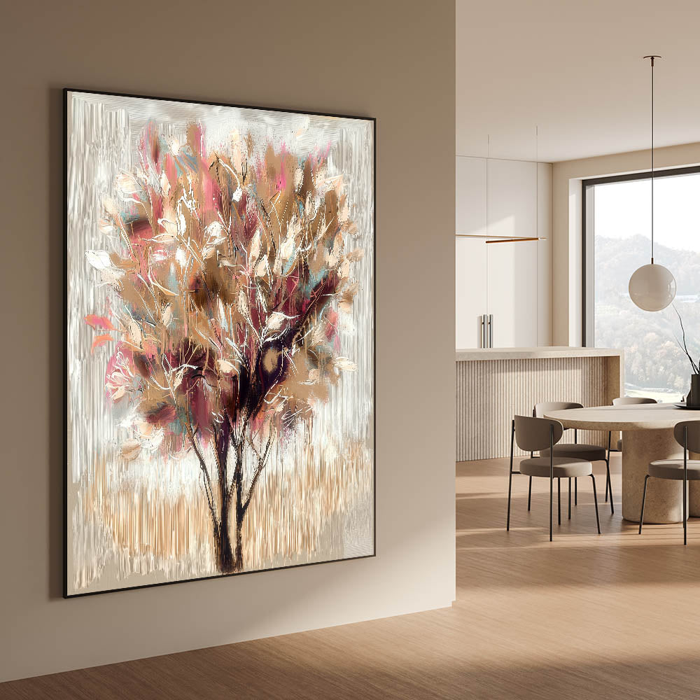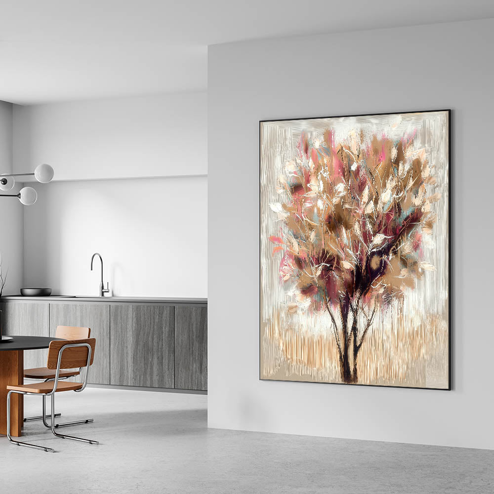 Add warmth and sophistication to your dining area with this framed dining room print, featuring a stunning golden-hued tree with soft beige and brown tones. The delicate brushstrokes and artistic detailing create a modern dining room art piece that complements both contemporary and rustic interiors. This artwork is perfect for bringing a natural, organic feel to your dining space.