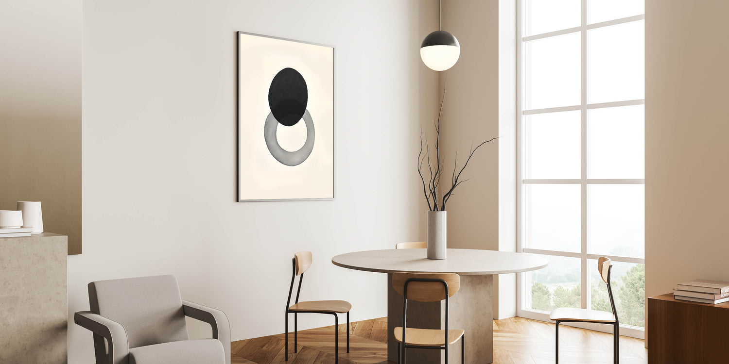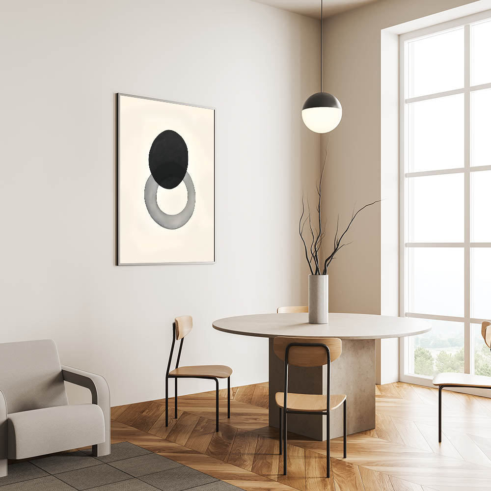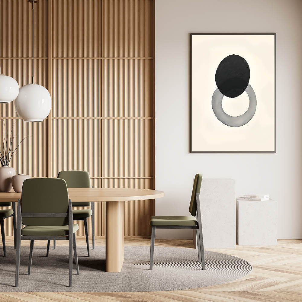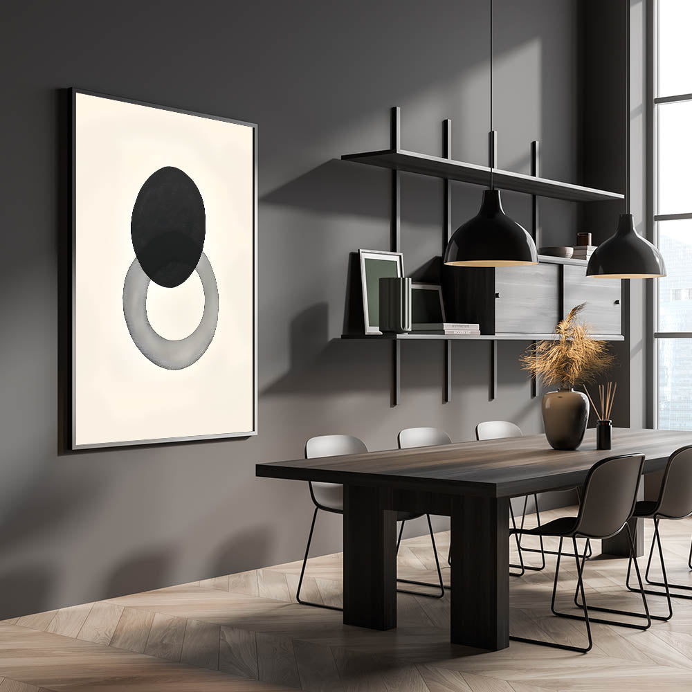 Elevate your dining space with high-quality canvas art for dining rooms, featuring a minimalist abstract composition in black and gray tones. This elegant dining room wall art blends simplicity and sophistication, making it an ideal focal point for contemporary interiors.