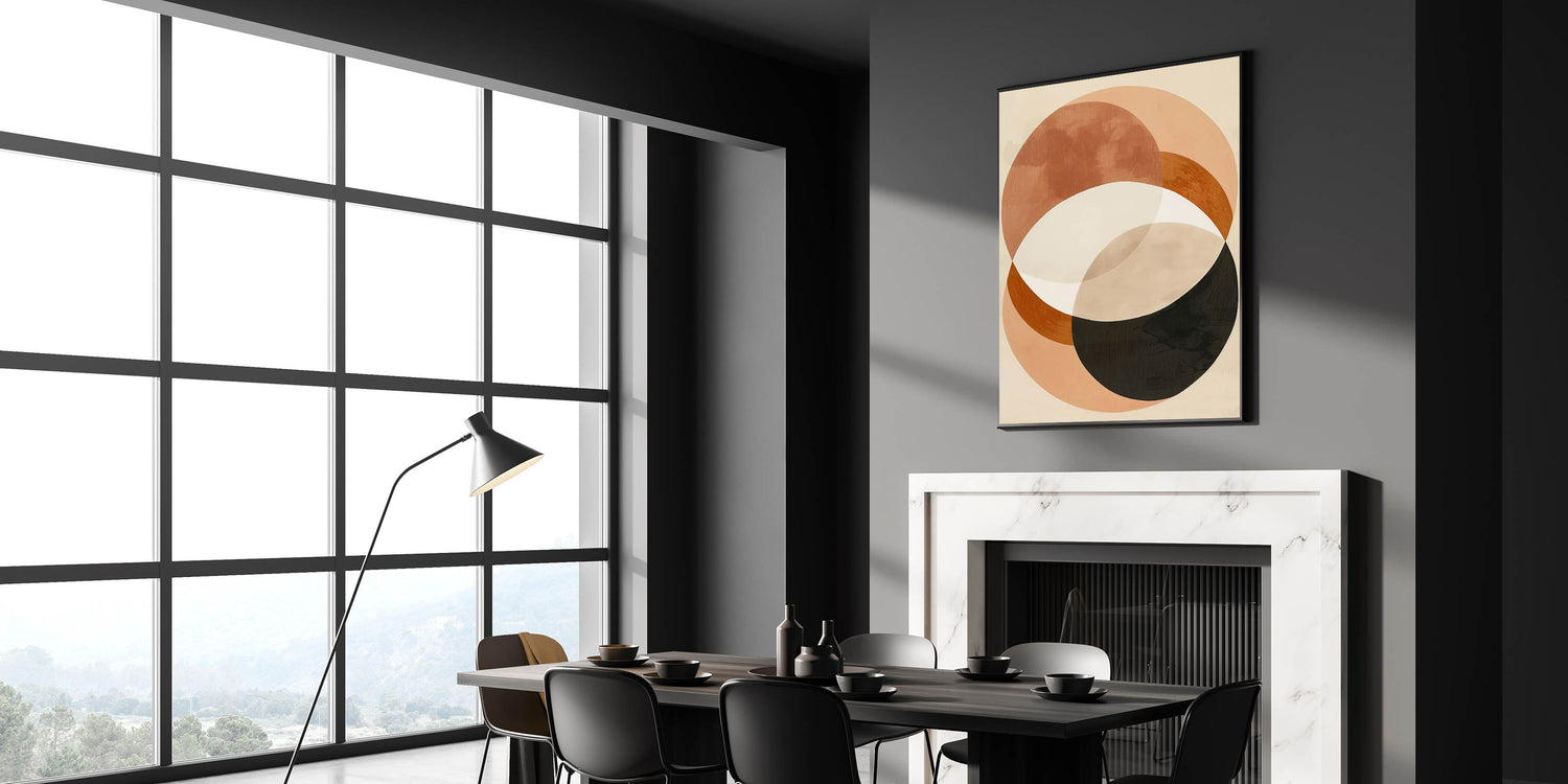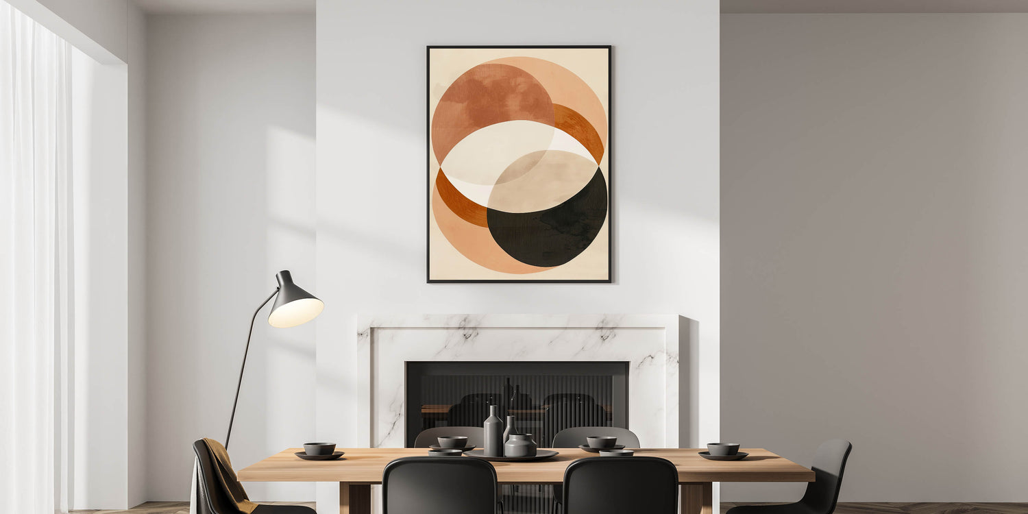 Transform your dining space with this modern dining area art piece, featuring an elegant geometric design in warm earth tones. The overlapping circular shapes in black, brown, beige, and peach create a sense of harmony and depth, making it an ideal addition to contemporary and minimalist interiors. This sophisticated abstract artwork blends natural hues with modern aesthetics, enhancing any dining space with a refined touch.