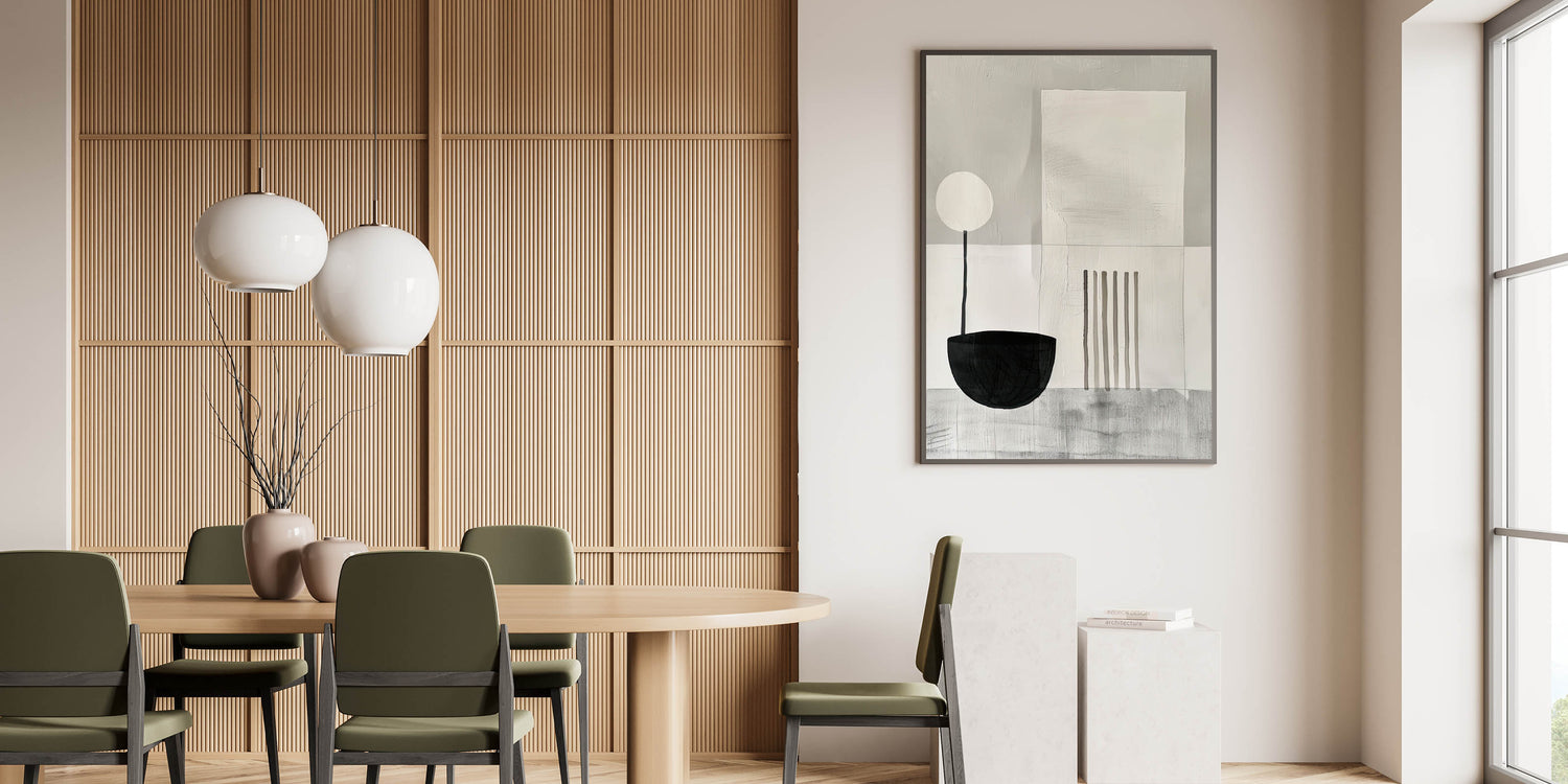 This dining room wall decor brings balance and elegance to any dining area. Whether displayed as a premium rolled paper art print, rolled canvas print for dining areas, or framed dining room print, this piece offers a timeless, modern touch to elevate your space.
