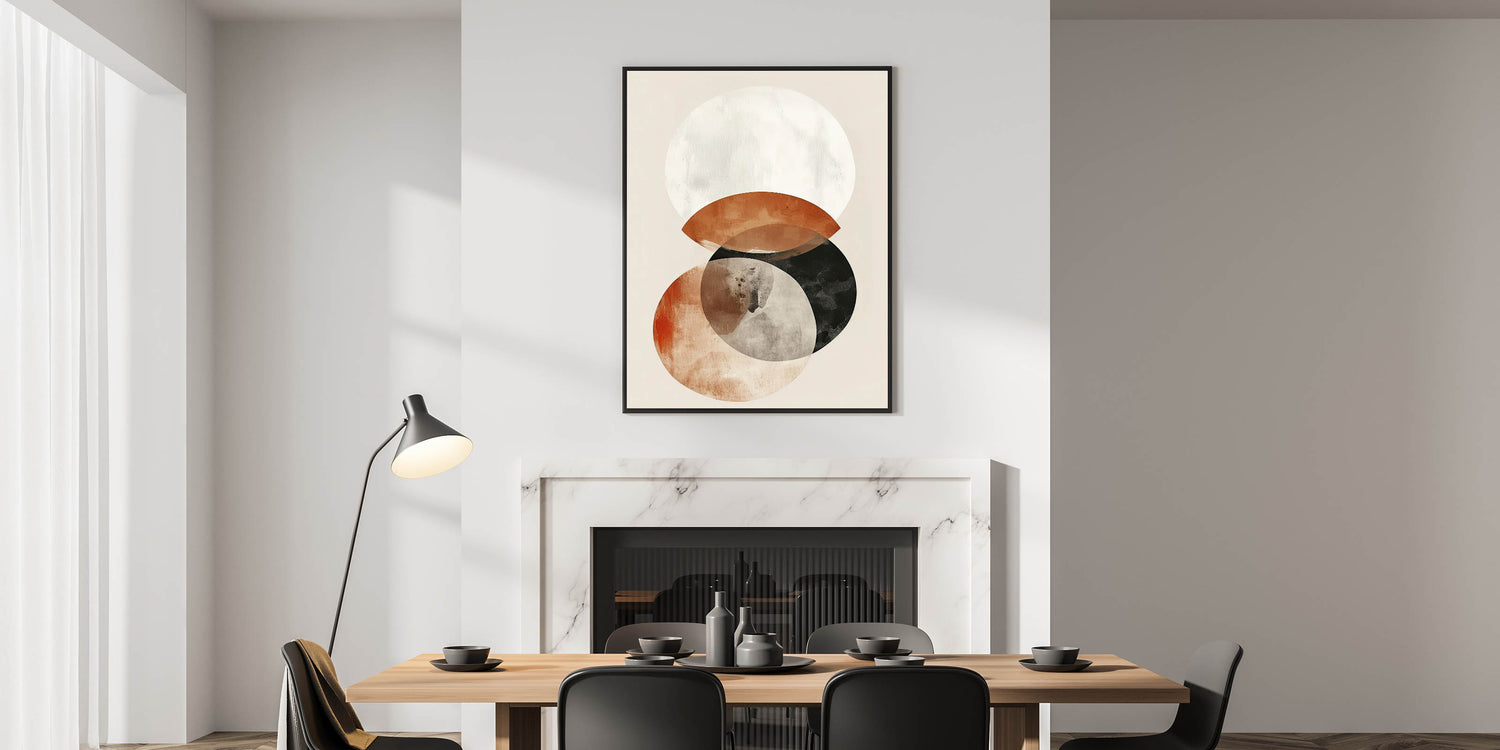 Elevate your dining space with this elegant dining room wall art, featuring a sophisticated blend of geometric abstraction and earthy tones. This contemporary piece seamlessly complements modern dining room aesthetics, adding warmth and character to your space.