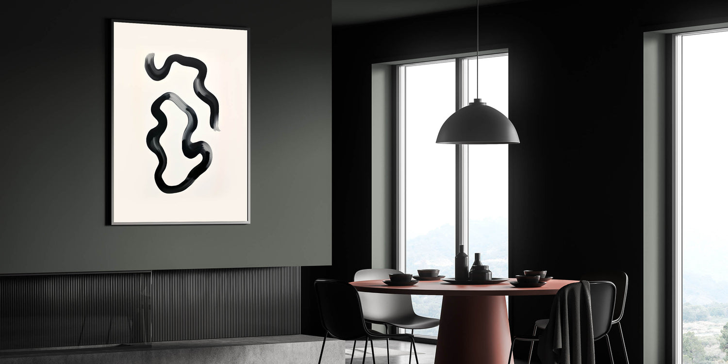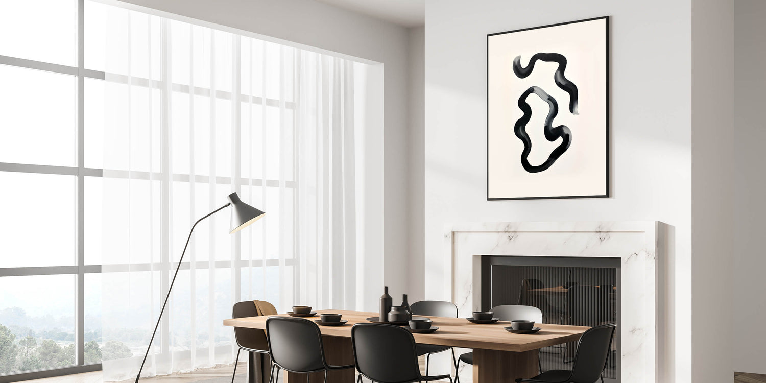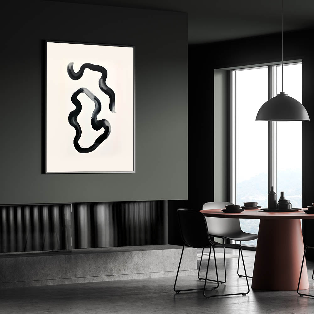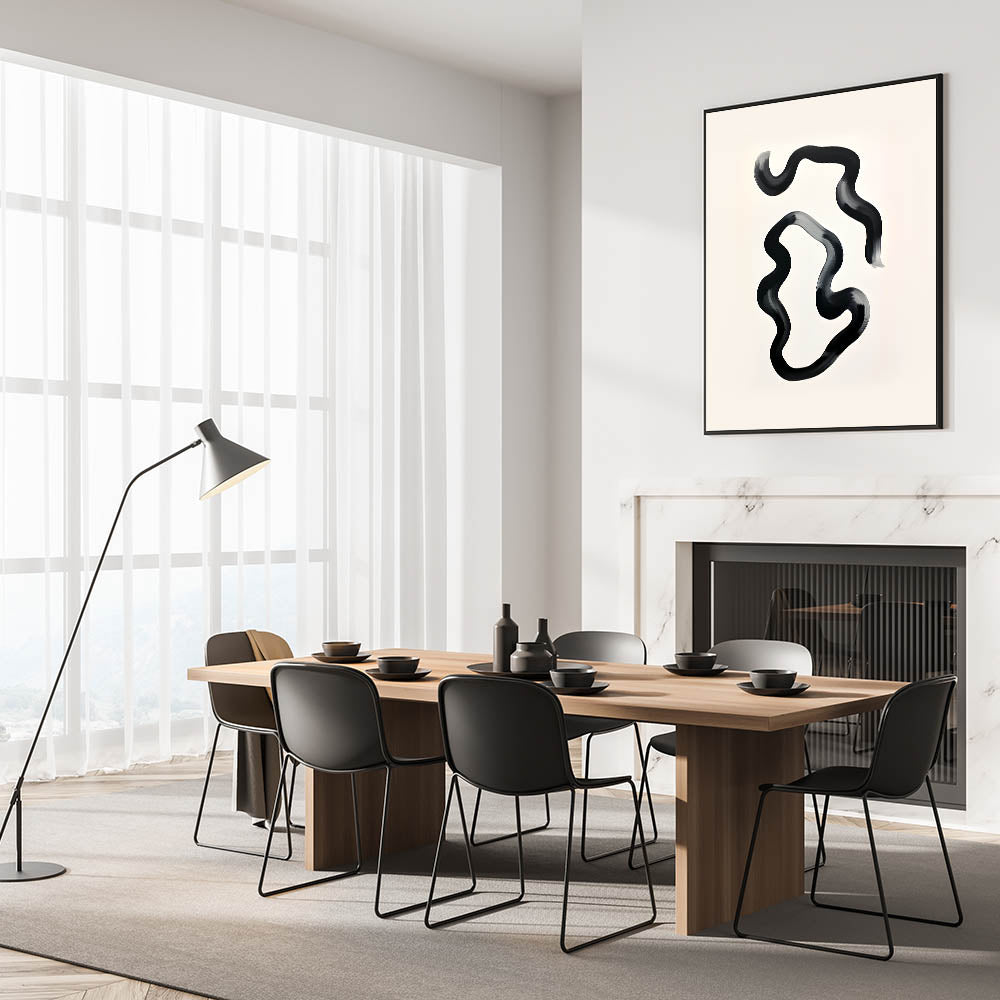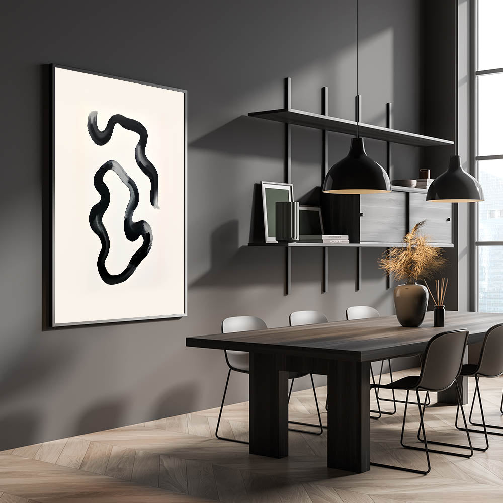 Enhance your dining space with this elegant dining room wall art, featuring a modern black and white abstract design. The fluid brushstrokes create a sense of movement, adding a contemporary touch to your home. Whether displayed in a framed dining room print, stretched canvas, or acrylic glass, this artwork transforms any dining area into a stylish retreat.