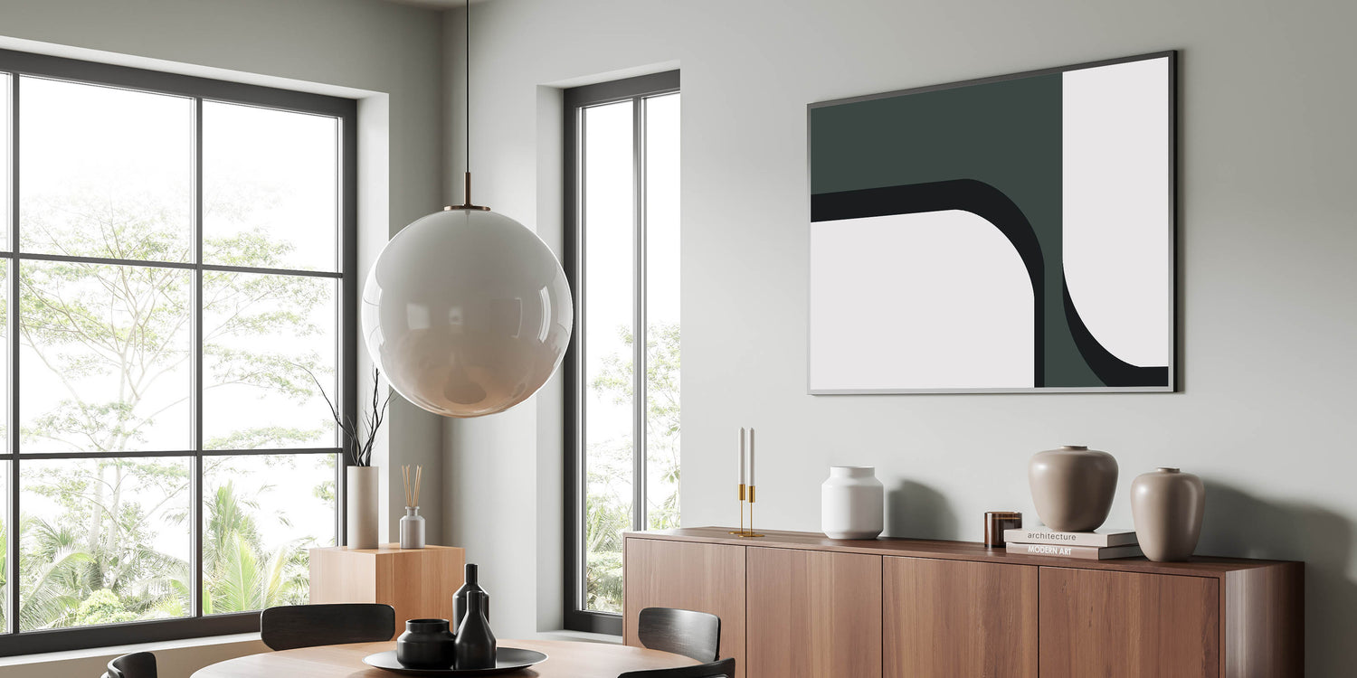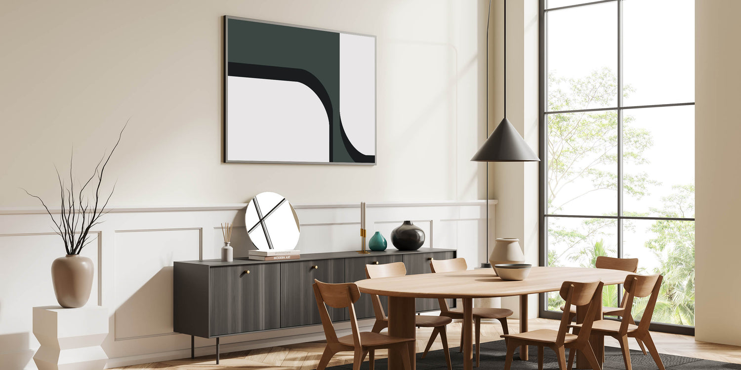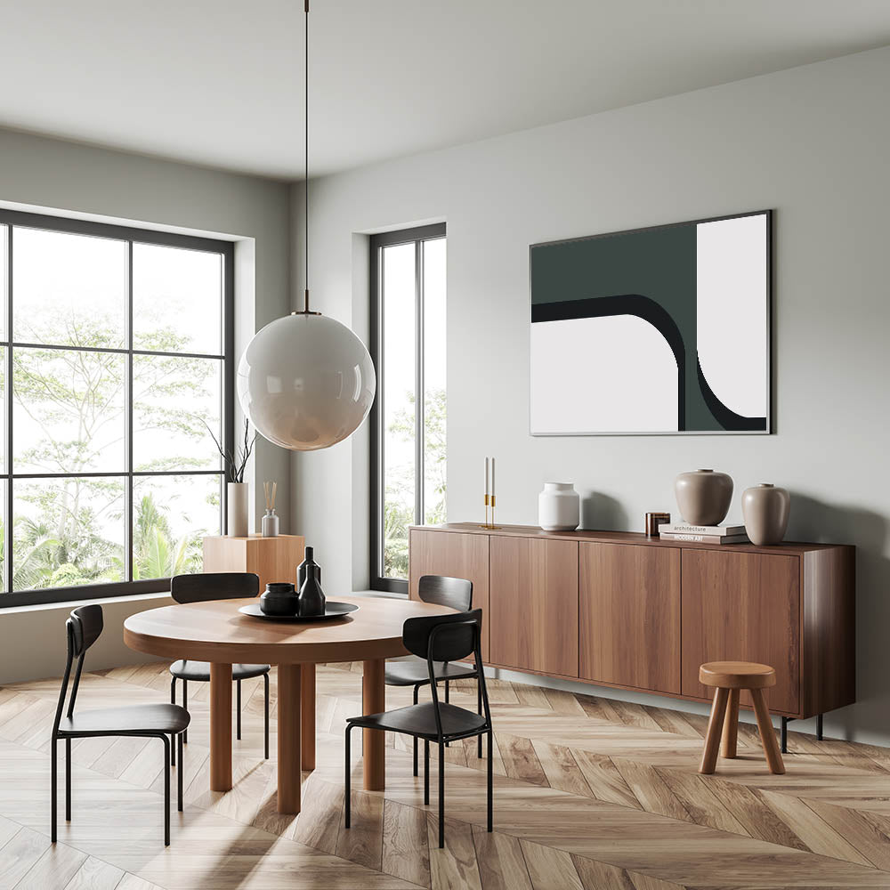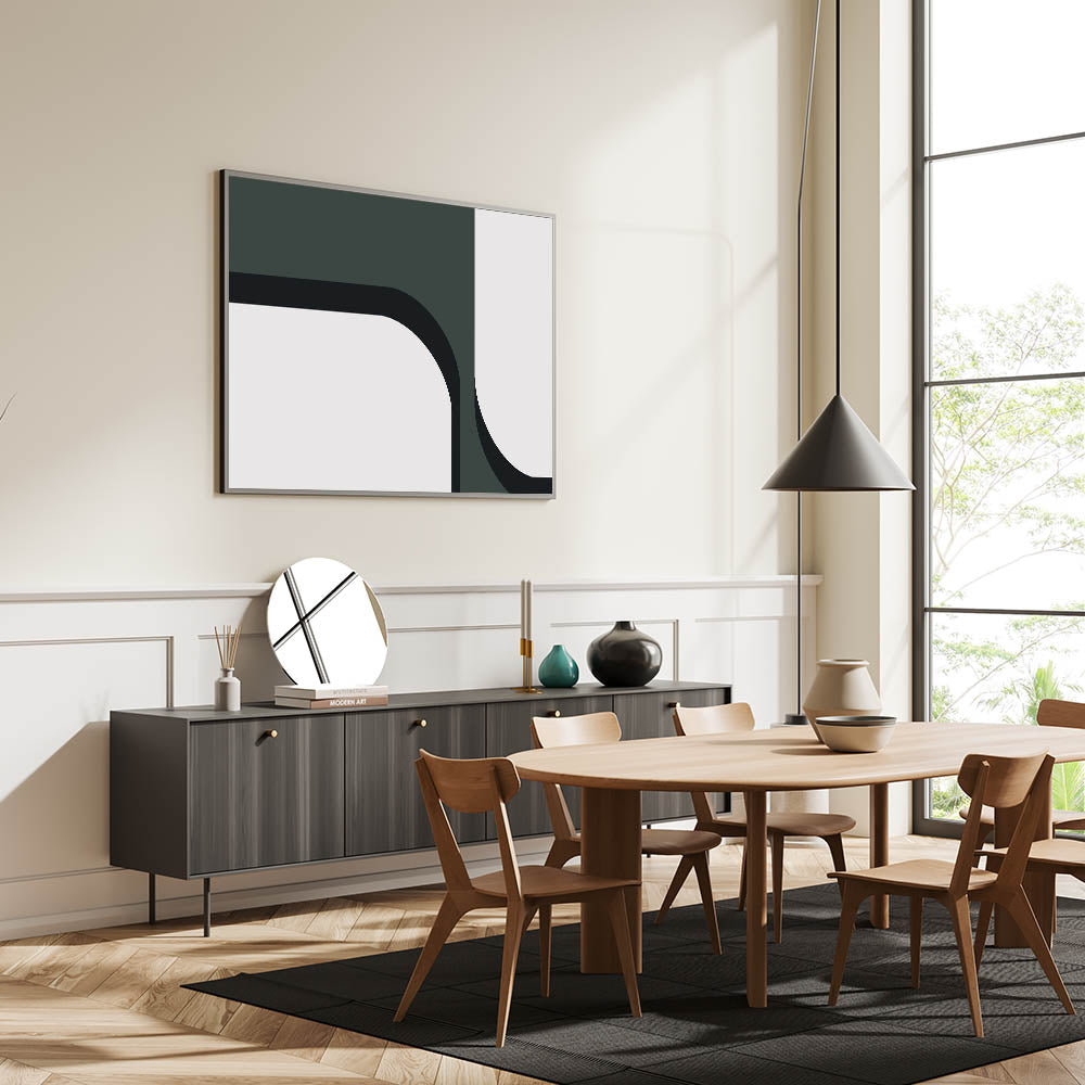 Upgrade your dining space with this modern dining room art, featuring a sleek geometric design in dark green, black, and light gray. The structured composition and curved elements create a contemporary yet minimalist aesthetic, making it an ideal choice for modern interiors. This canvas art for dining areas is perfect for adding balance and sophistication to your decor.