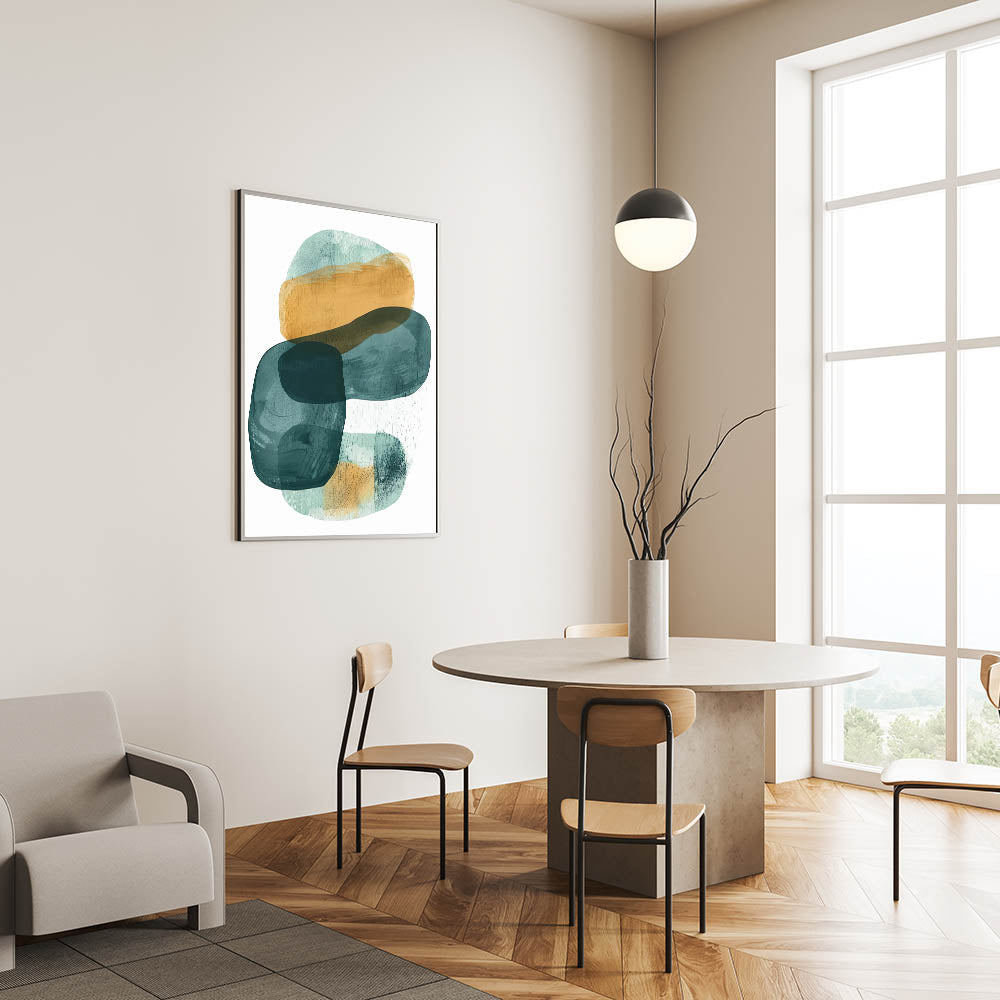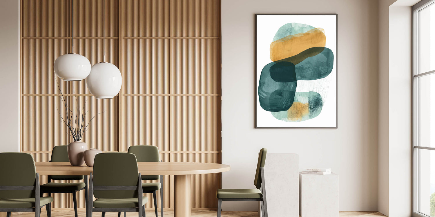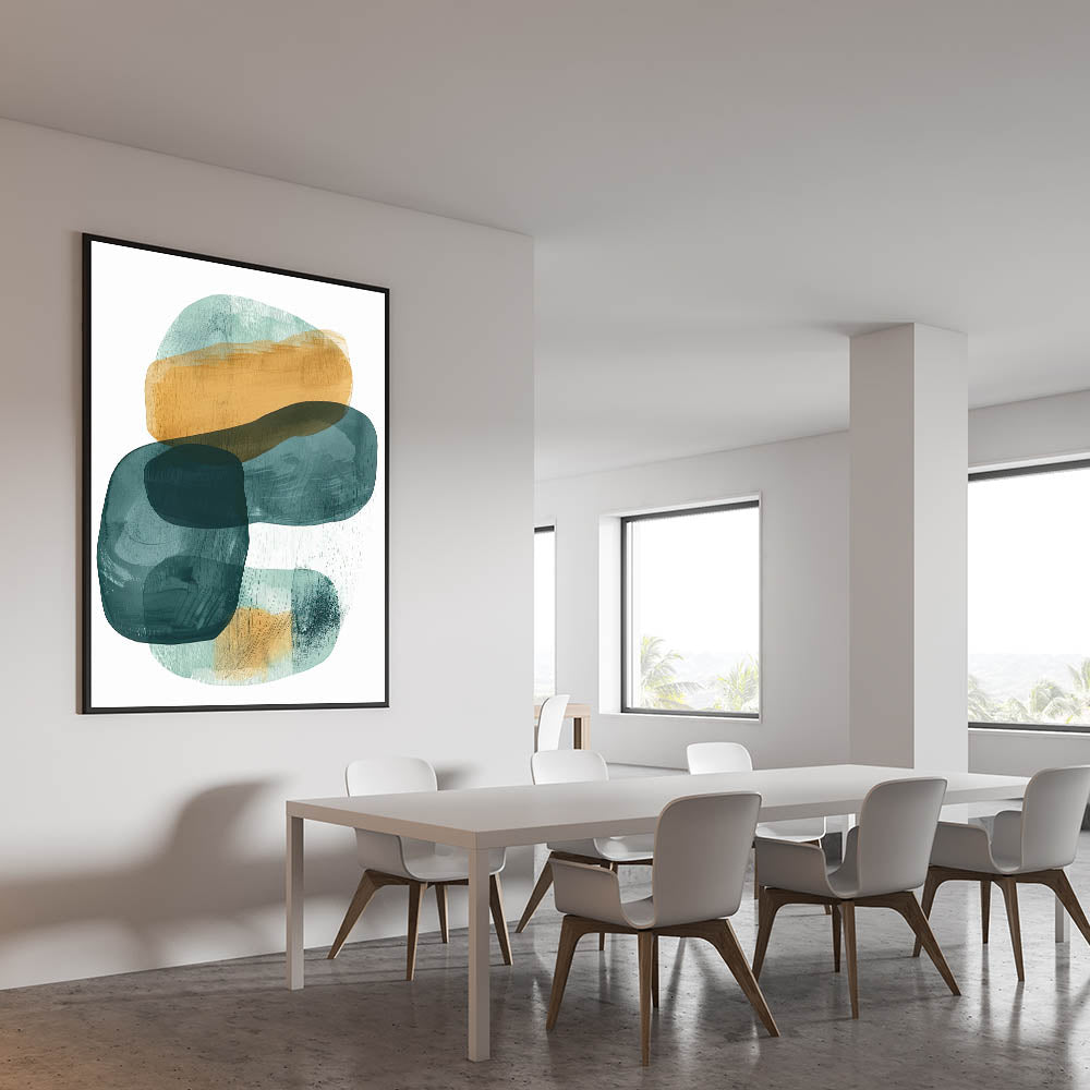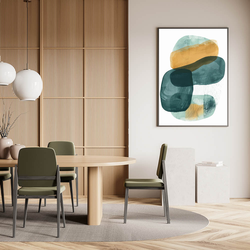 Enhance your dining space with this elegant dining room wall art, a sophisticated blend of deep teal, muted green, and warm gold hues. This modern dining room art piece brings a refined yet artistic touch to your home, making it a perfect centerpiece for contemporary interiors.