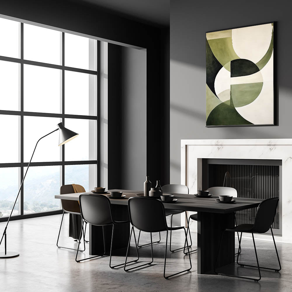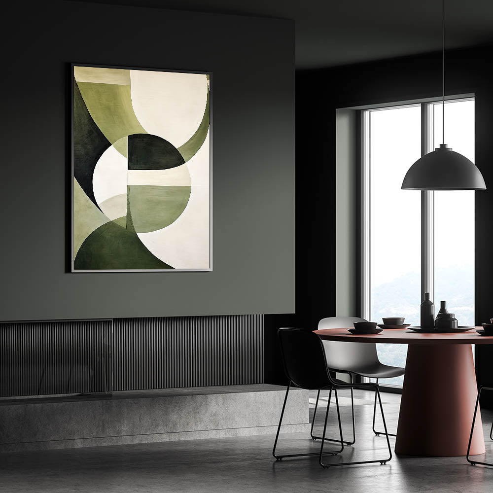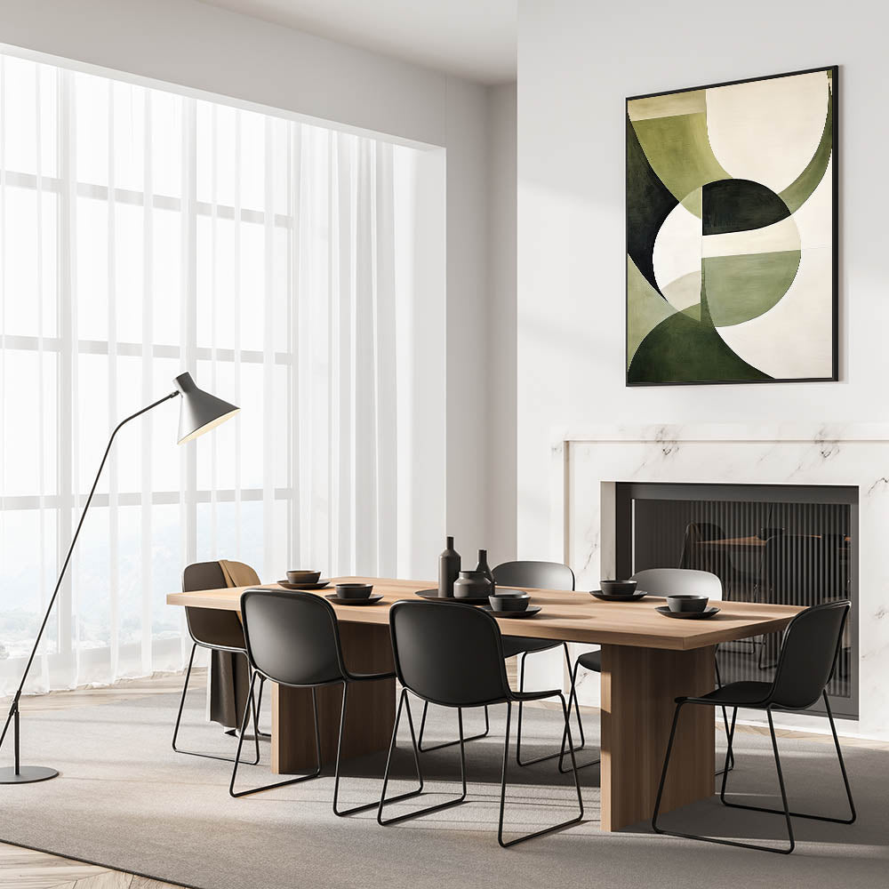 Enhance your dining space with this elegant dining room wall art, featuring an abstract design in soothing green and white tones. The harmonious blend of dark and light green with neutral hues makes this artwork a perfect statement piece for modern dining rooms. Designed to complement various interior styles, this piece adds sophistication and depth to your dining area.