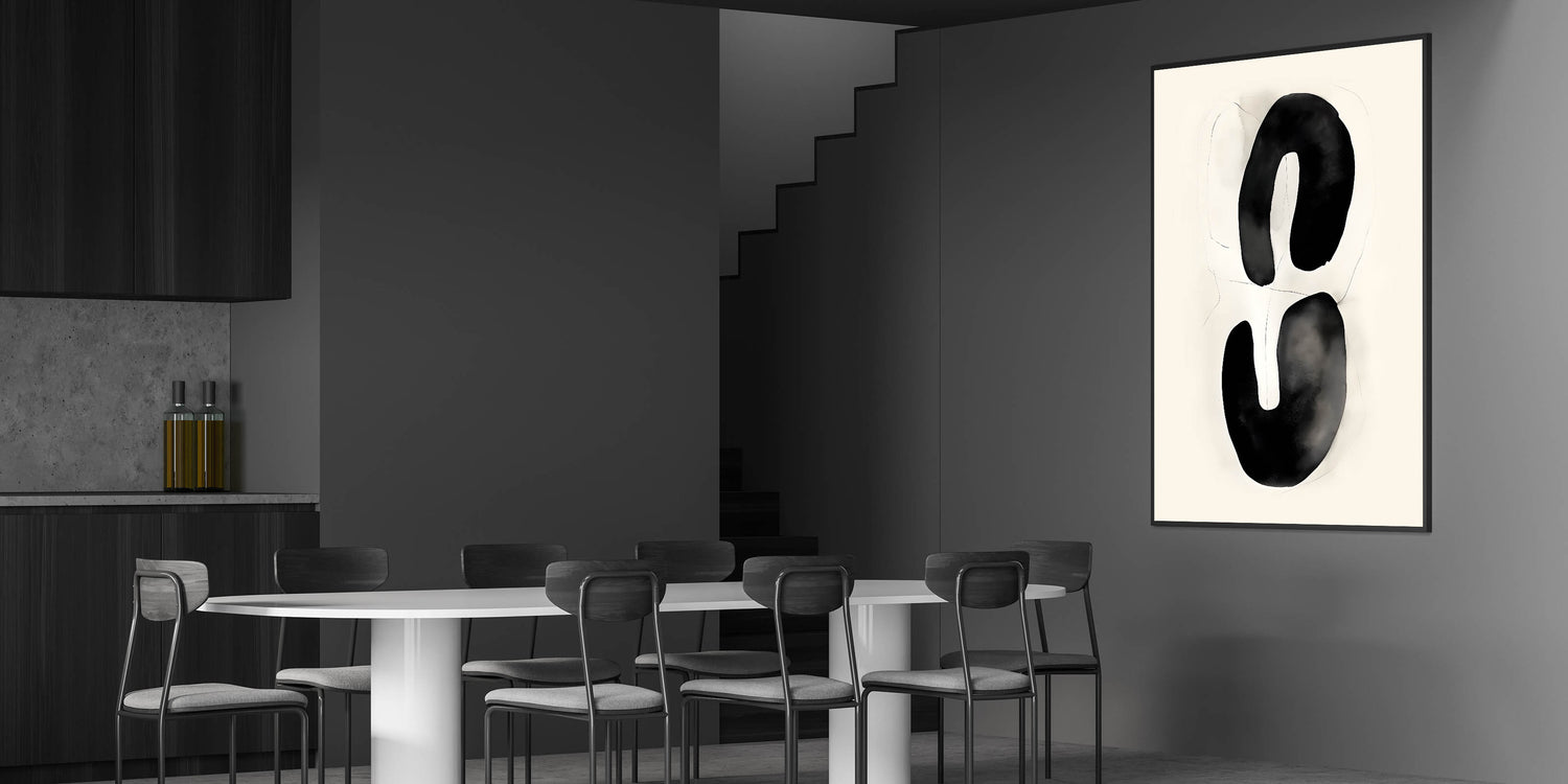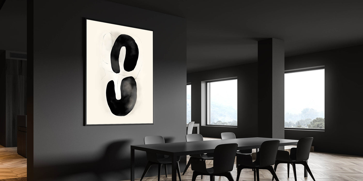 • Contemporary Abstract Design – A timeless black and white composition ideal for modern dining room art styles.