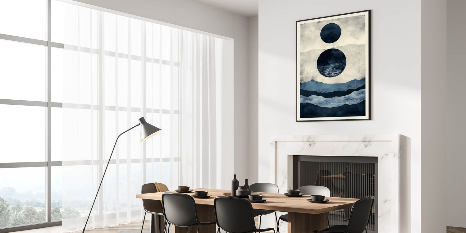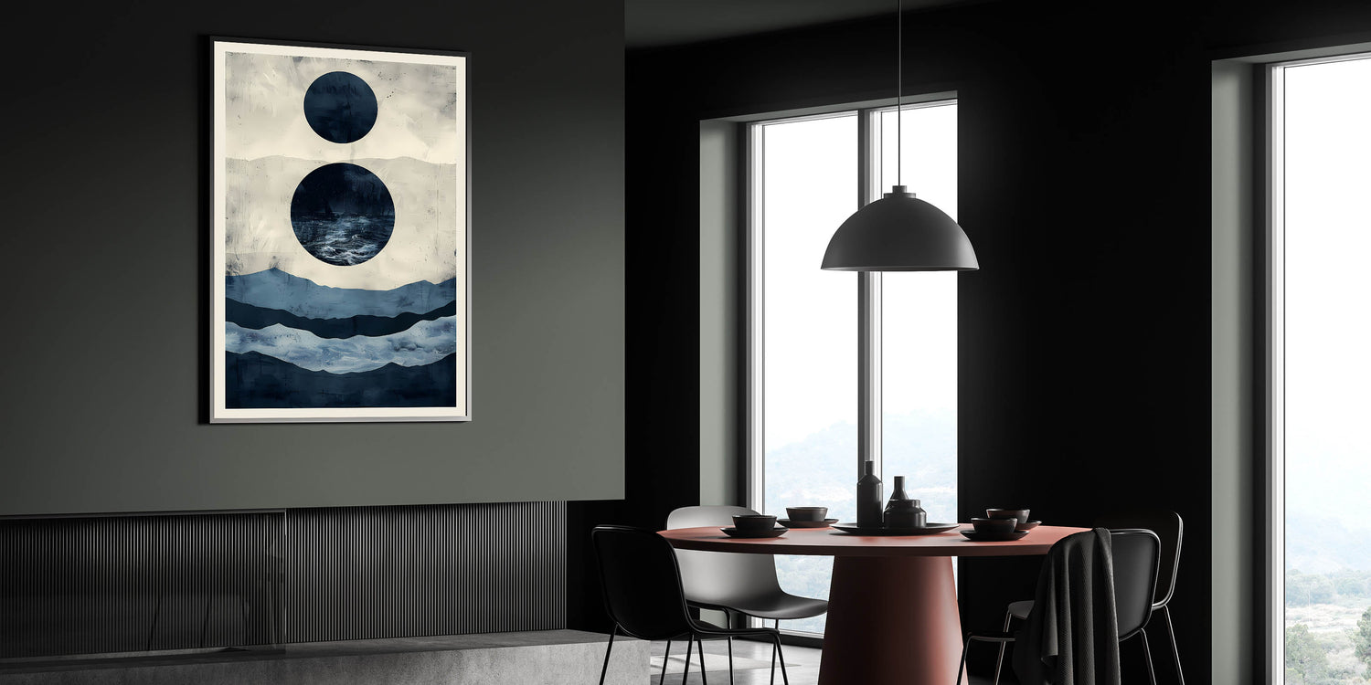 Elevate your dining space with this elegant dining room wall art, featuring an abstract interplay of navy blue and beige. The contemporary design with geometric elements and ocean-inspired tones brings a calming and sophisticated ambiance to your dining area.