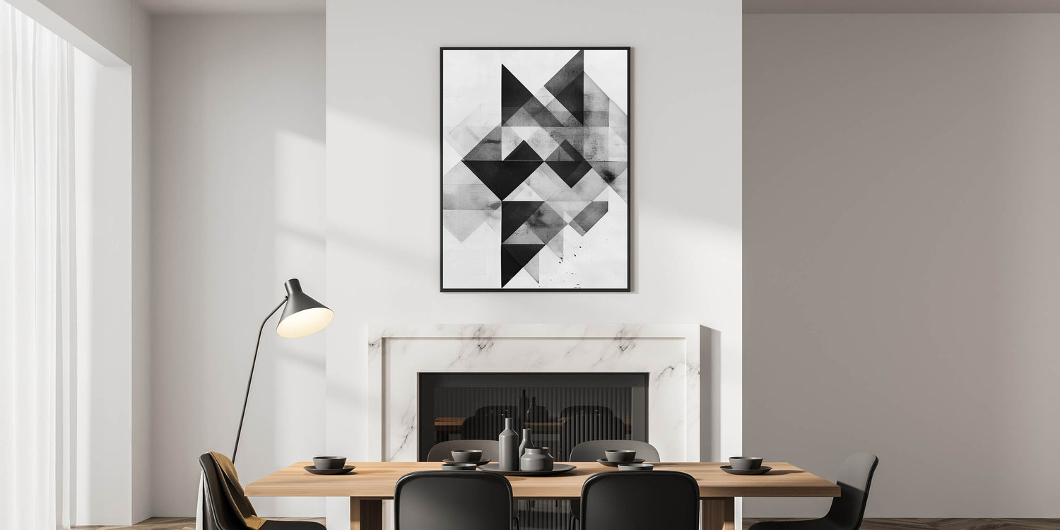 Enhance your dining space with this elegant dining room wall art, featuring a bold geometric abstract design in black, white, and gray tones. This modern dining room art offers a sleek, contemporary touch that complements minimalist and industrial decor styles.