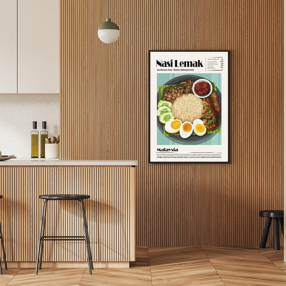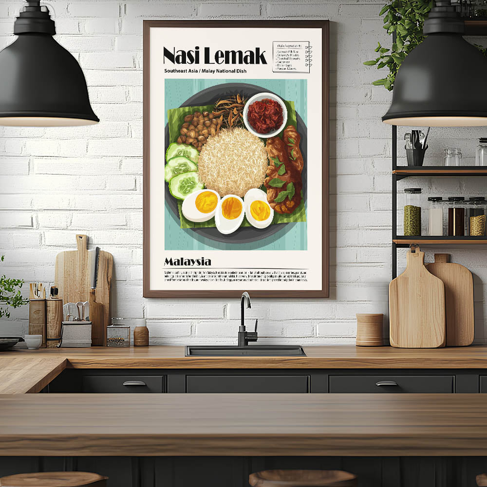 Celebrate the flavors of Malaysia with this Nasi Lemak Dishes Wall Art, a vibrant tribute to the country's national dish. This culinary wall art captures the essence of Nasi Lemak, featuring fragrant coconut rice, crispy anchovies, spicy sambal, crunchy peanuts, fresh cucumbers, and soft-boiled eggs, all beautifully arranged on a banana leaf. The detailed textures and rich colors make this kitchen wall art a perfect statement piece for any food lover.