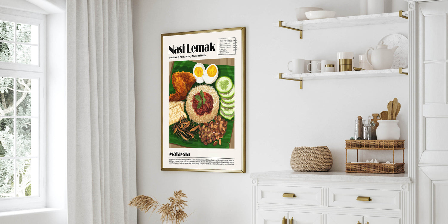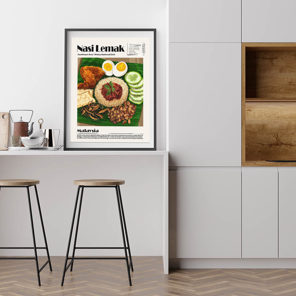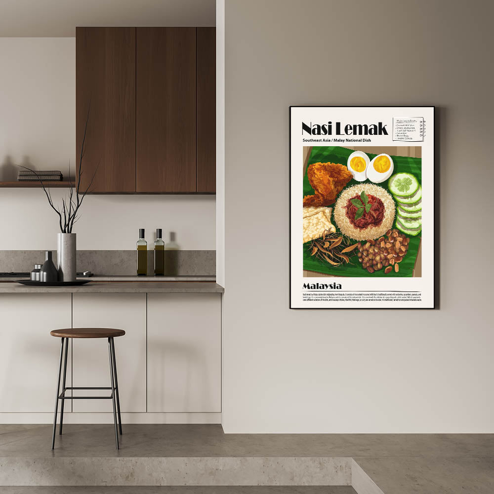 Enhance your kitchen decor with this Nasi Lemak Kitchen Wall Art, a stunning tribute to Malaysia’s most iconic dish. This culinary wall art highlights a beautifully plated Nasi Lemak, featuring fragrant coconut rice, spicy sambal, crispy anchovies, roasted peanuts, fresh cucumbers, boiled eggs, and golden fried chicken. The intricate details and rich colors create a visually appealing food wall art piece that adds warmth to any space.