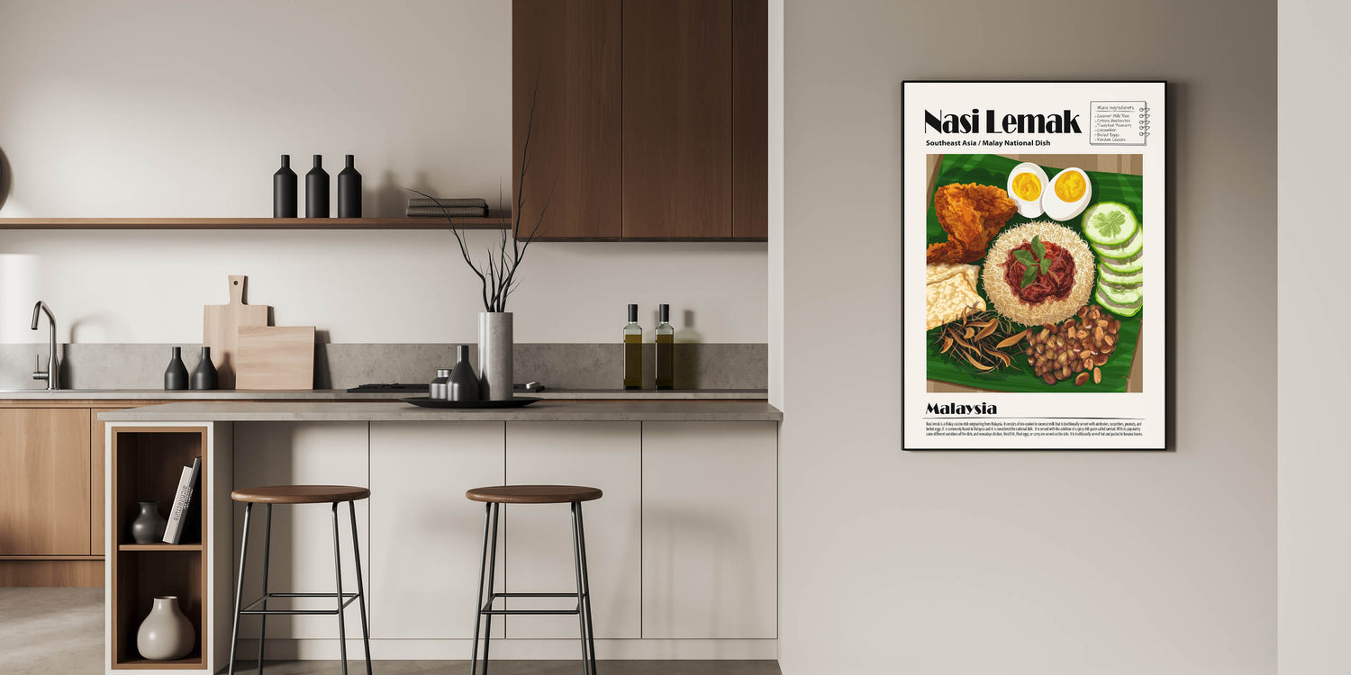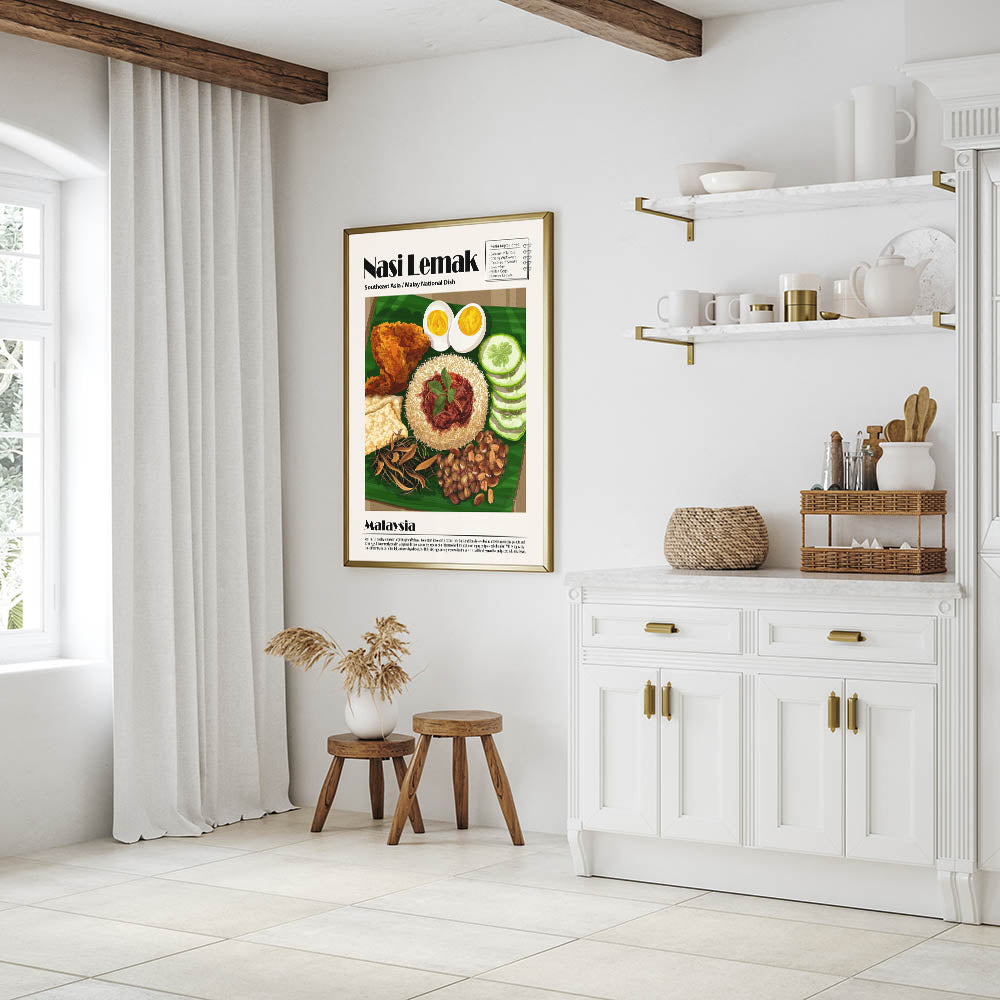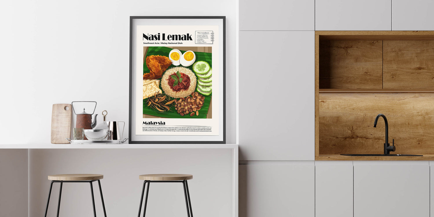 Enhance your kitchen decor with this Nasi Lemak Kitchen Wall Art, a stunning tribute to Malaysia’s most iconic dish. This culinary wall art highlights a beautifully plated Nasi Lemak, featuring fragrant coconut rice, spicy sambal, crispy anchovies, roasted peanuts, fresh cucumbers, boiled eggs, and golden fried chicken. The intricate details and rich colors create a visually appealing food wall art piece that adds warmth to any space.