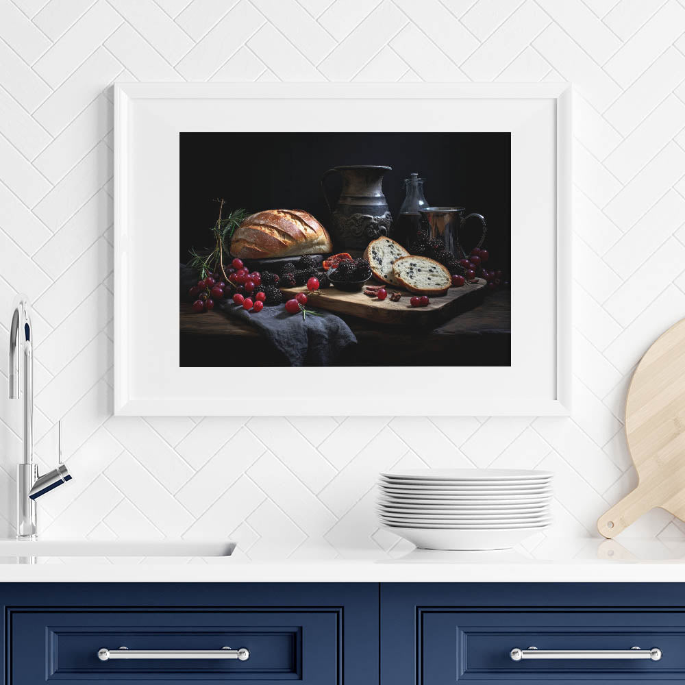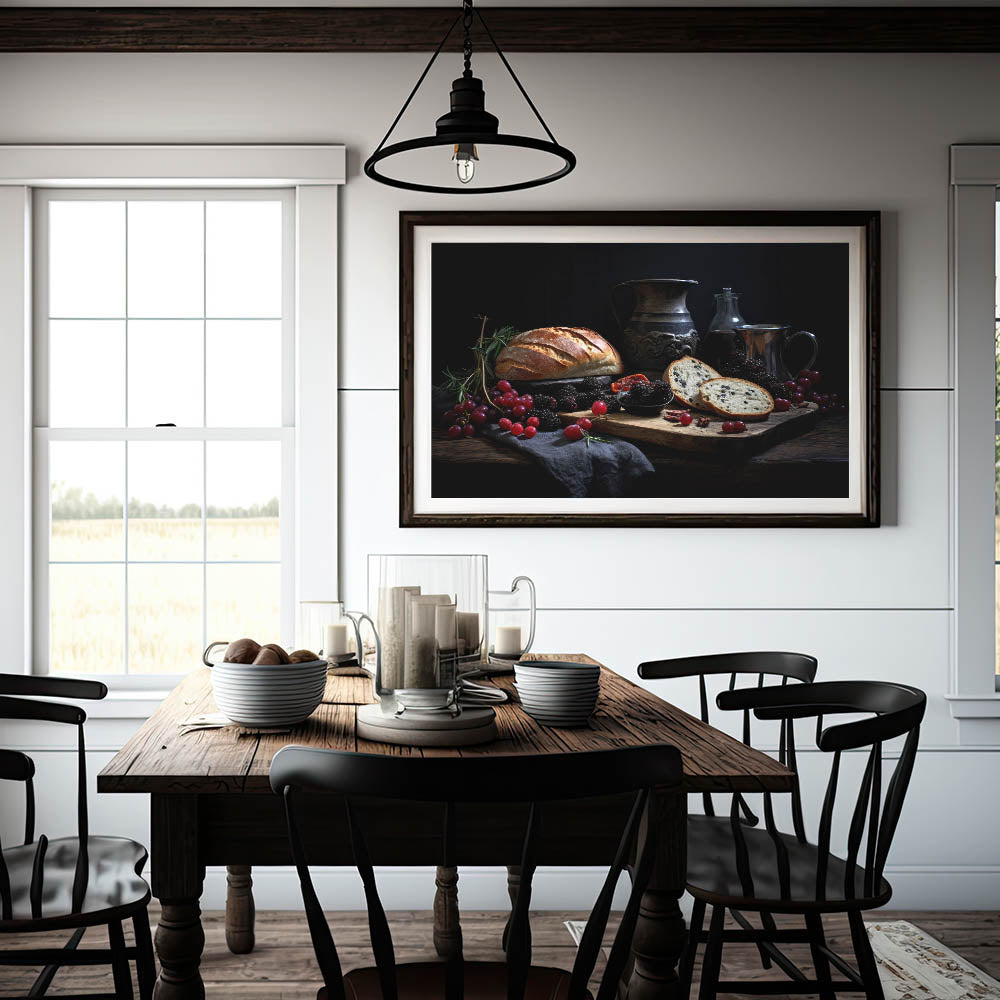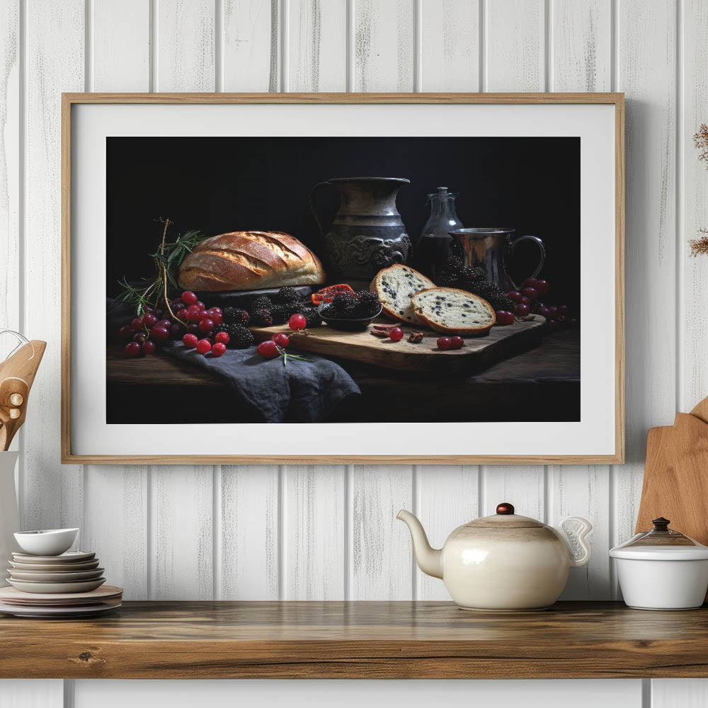 Infuse your space with a timeless, rustic charm with this Rustic Bread Dishes Wall Art. This culinary wall art showcases a beautifully arranged still life featuring artisanal bread, blackberries, red grapes, and a rich berry compote, set against a dramatic, moody background. The warm tones of the bread contrast with the deep hues of the fruits, making this food wall art a sophisticated addition to any kitchen or dining space.