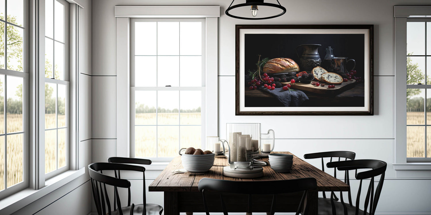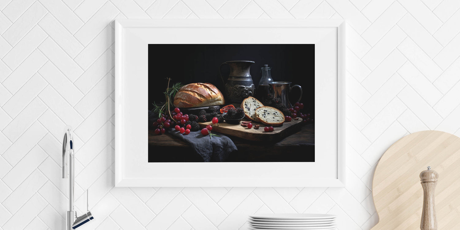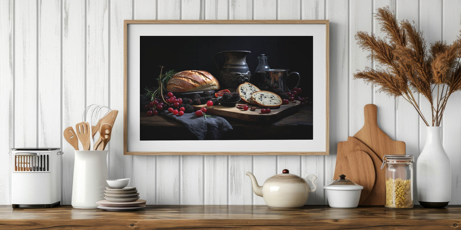 Infuse your space with a timeless, rustic charm with this Rustic Bread Dishes Wall Art. This culinary wall art showcases a beautifully arranged still life featuring artisanal bread, blackberries, red grapes, and a rich berry compote, set against a dramatic, moody background. The warm tones of the bread contrast with the deep hues of the fruits, making this food wall art a sophisticated addition to any kitchen or dining space.