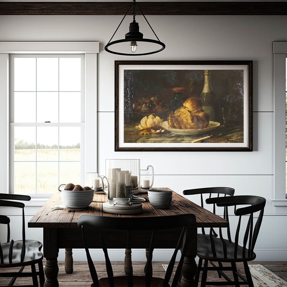 - Rustic Culinary Appeal: A rich portrayal of artisanal bread, fruits, and bottles—ideal for Dining Room Aesthetics.