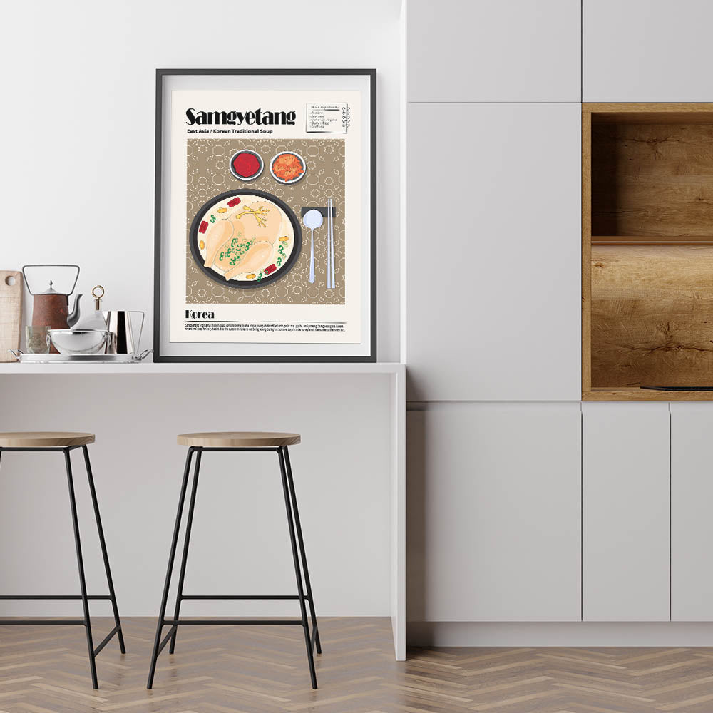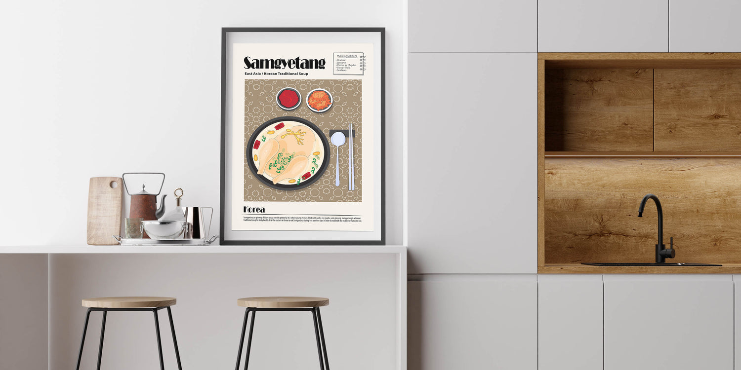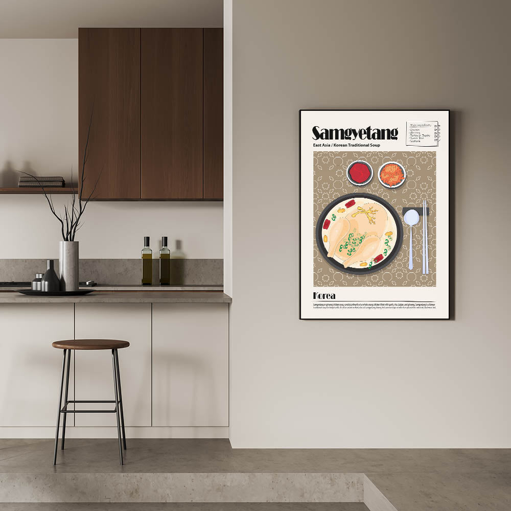 Experience the warmth and nourishment of traditional Korean cuisine with this Samgyetang Dishes Wall Art, a stunning visual representation of the famous ginseng chicken soup. This culinary wall art features a steaming bowl of samgyetang, showcasing a whole chicken simmered in a rich broth with ginseng, jujube dates, garlic, and scallions. Accompanied by classic Korean side dishes like kimchi and gochujang (red pepper paste), this food wall art captures the essence of comfort food and healing traditions, making it a perfect addition to kitchen decor or dining room wall art collections.