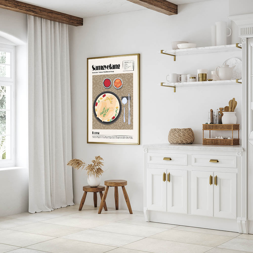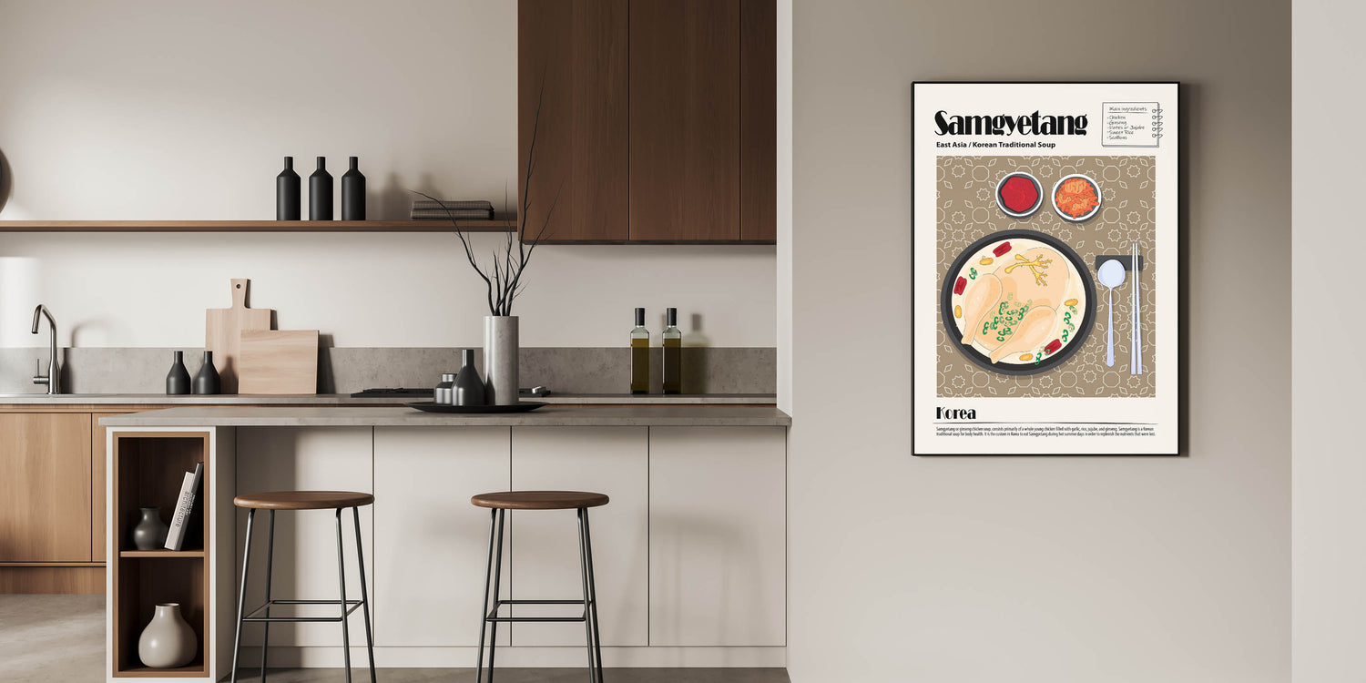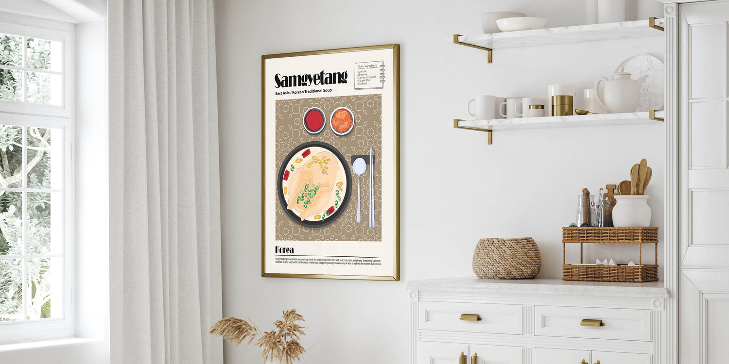 Experience the warmth and nourishment of traditional Korean cuisine with this Samgyetang Dishes Wall Art, a stunning visual representation of the famous ginseng chicken soup. This culinary wall art features a steaming bowl of samgyetang, showcasing a whole chicken simmered in a rich broth with ginseng, jujube dates, garlic, and scallions. Accompanied by classic Korean side dishes like kimchi and gochujang (red pepper paste), this food wall art captures the essence of comfort food and healing traditions, making it a perfect addition to kitchen decor or dining room wall art collections.