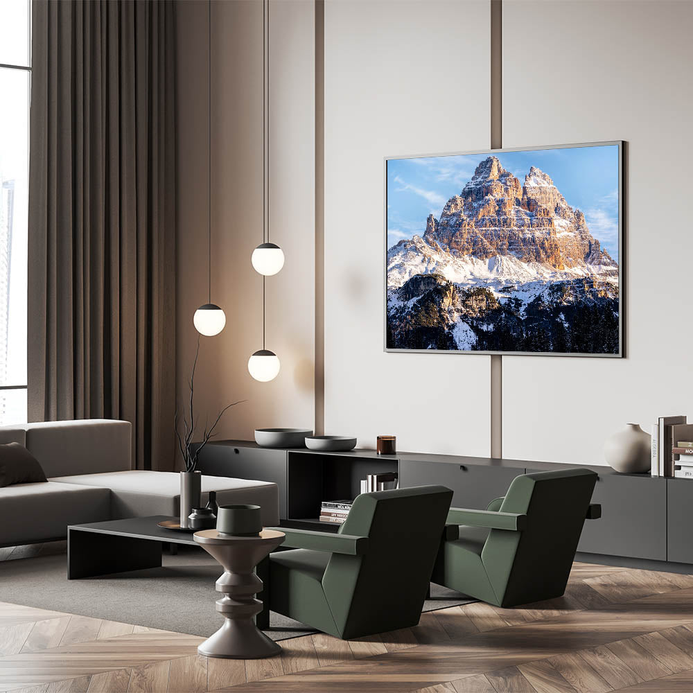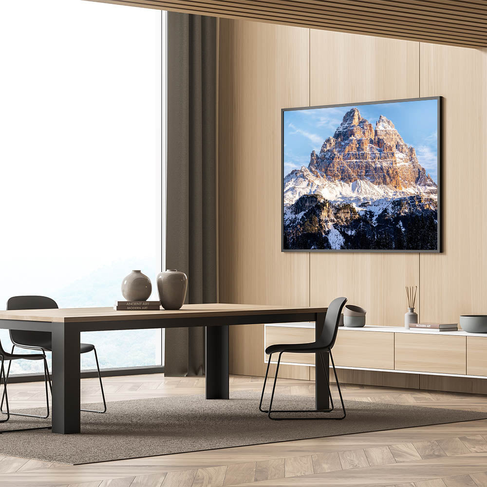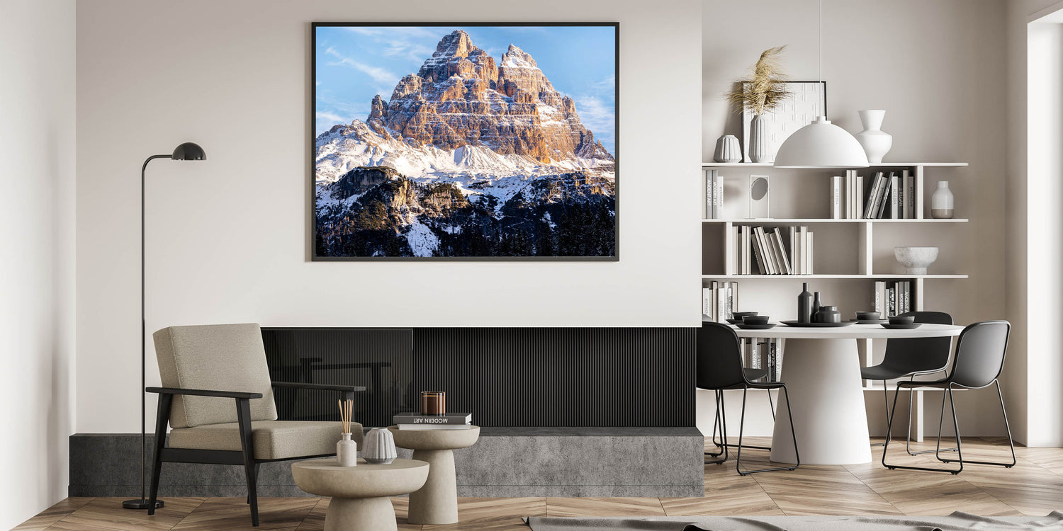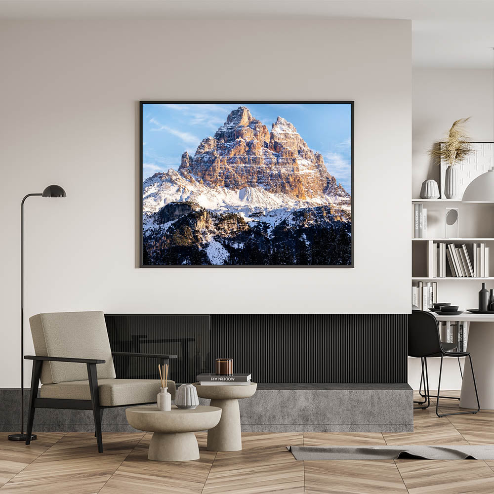 Bring the grandeur of the Dolomites into your home with this stunning canvas print featuring majestic snow-capped peaks. This captivating view captures the Italian Alps at their finest, with towering rock formations blanketed in fresh snow and bathed in soft, golden sunlight. The contrast of the rugged mountains against the crisp winter sky makes this Dolomites photography print a breathtaking centerpiece for any space.