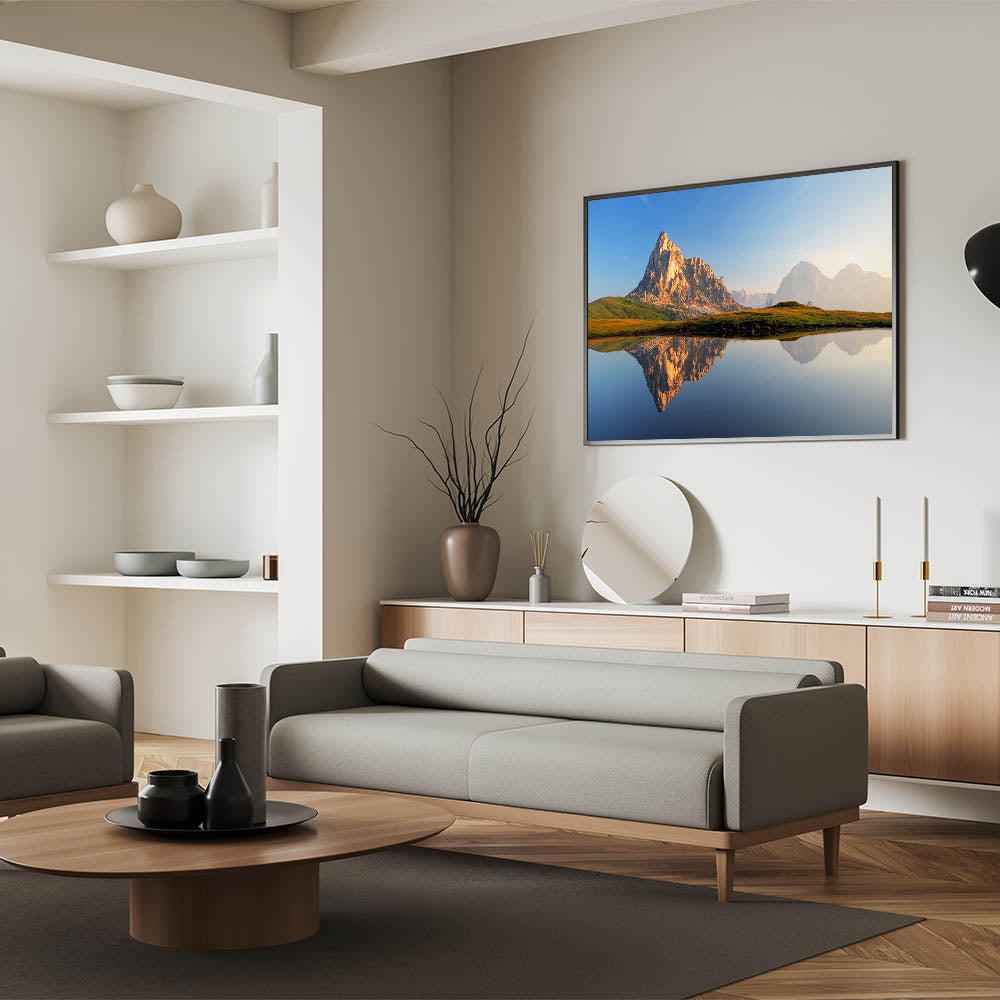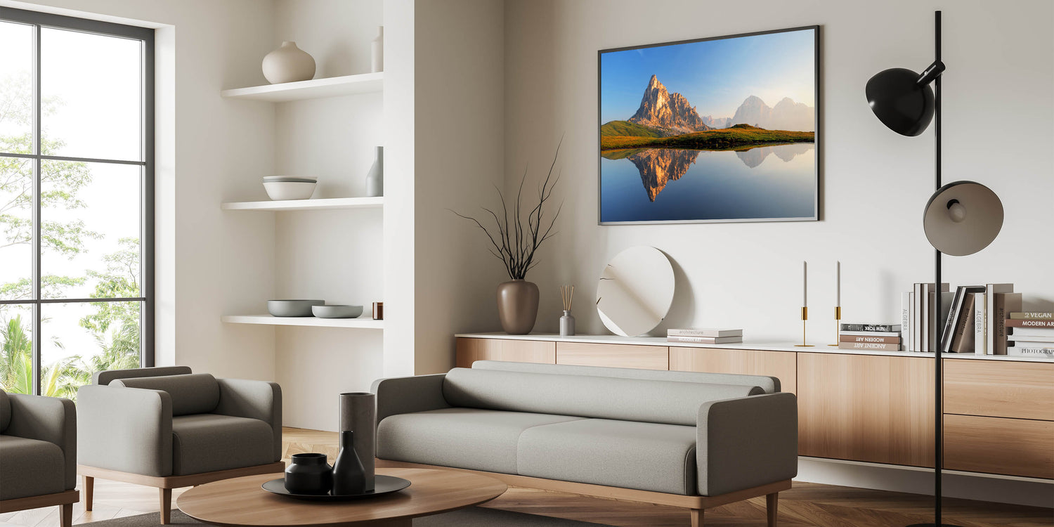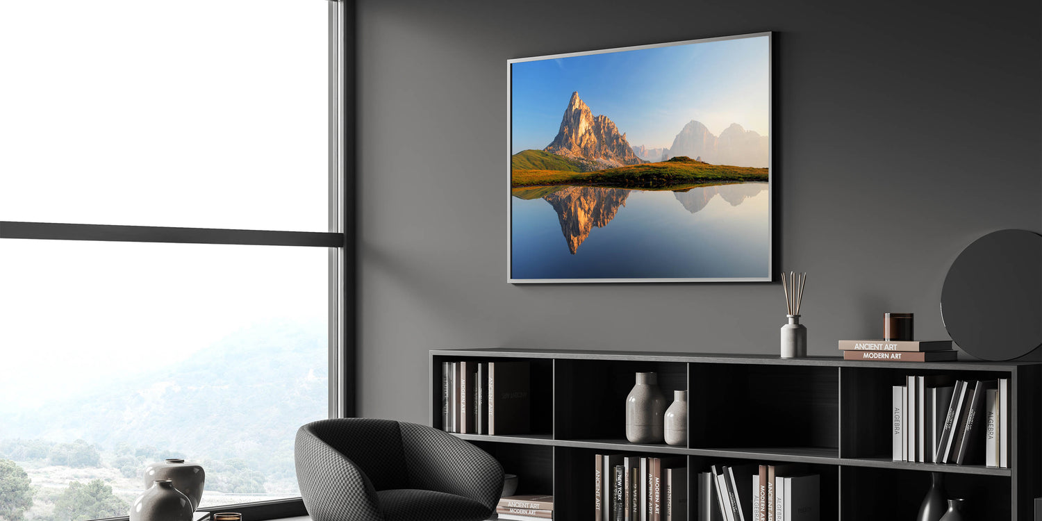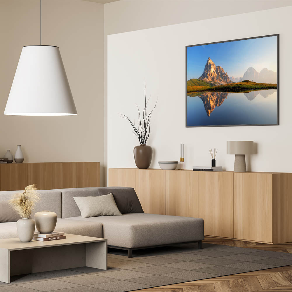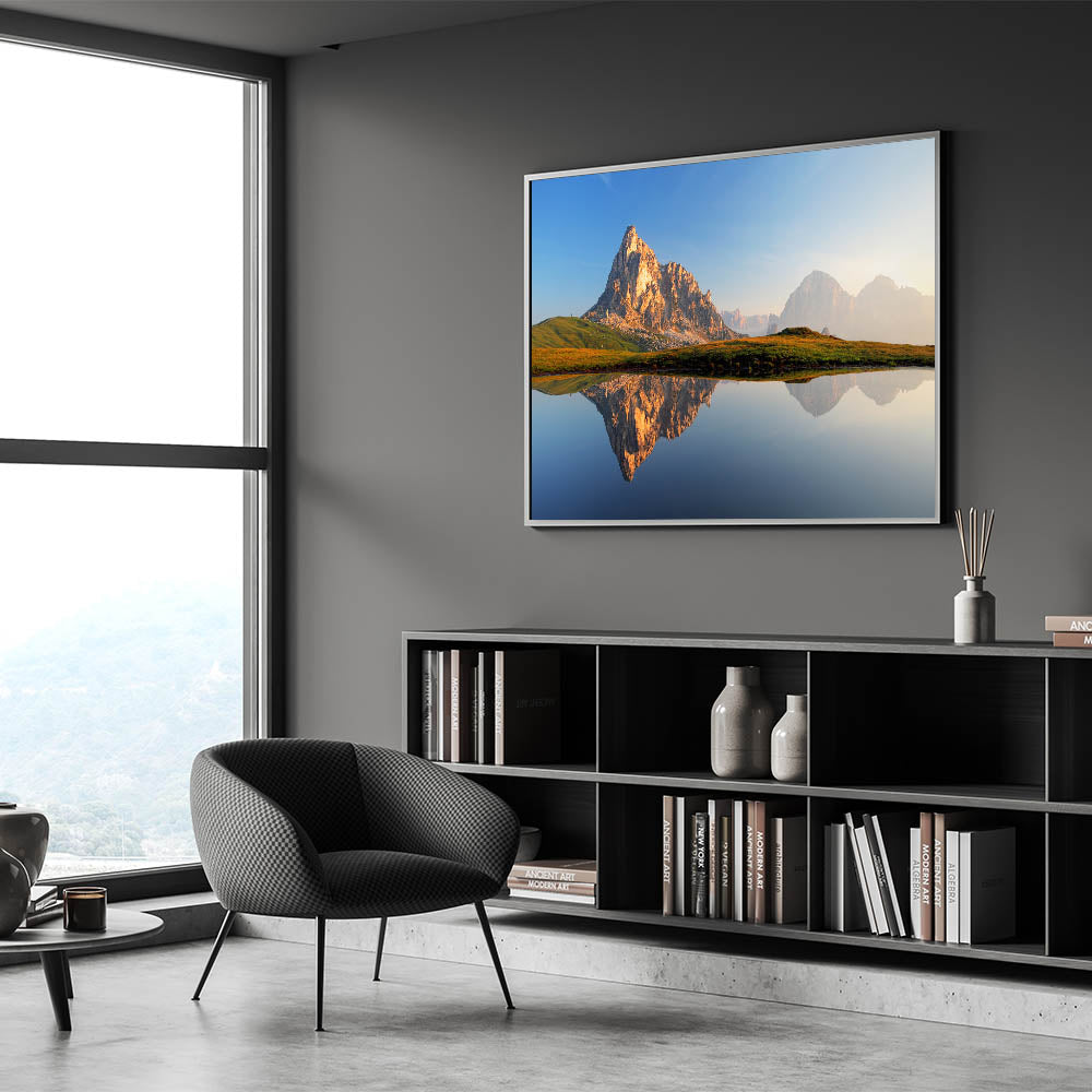 Enhance your space with this stunning Dolomites wall art, capturing the serene beauty of the Italian Alps at sunrise. The majestic mountain peaks are perfectly mirrored in the tranquil waters below, creating a breathtaking reflection that brings balance and peace to any room. This captivating view of the Dolomites is ideal for lovers of nature and landscape photography.
