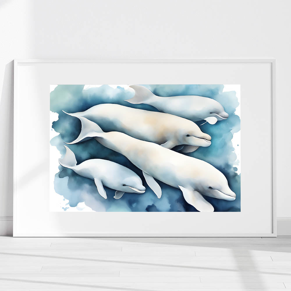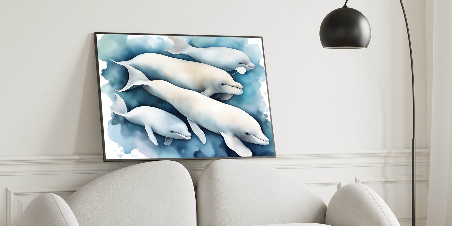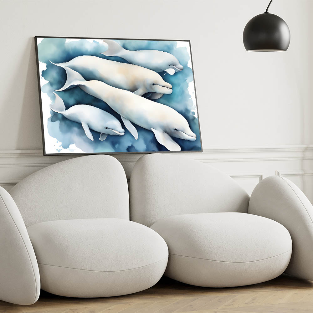 Immerse yourself in the tranquil beauty of the ocean with this Serene Dolphin Wall Art. This elegant piece features a pod of dolphins swimming gracefully through soft, watercolor-inspired waves. The gentle hues of blue and white create a calming atmosphere, making this artwork a perfect addition to any space in need of a peaceful, coastal touch.