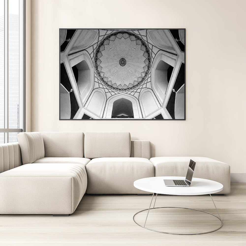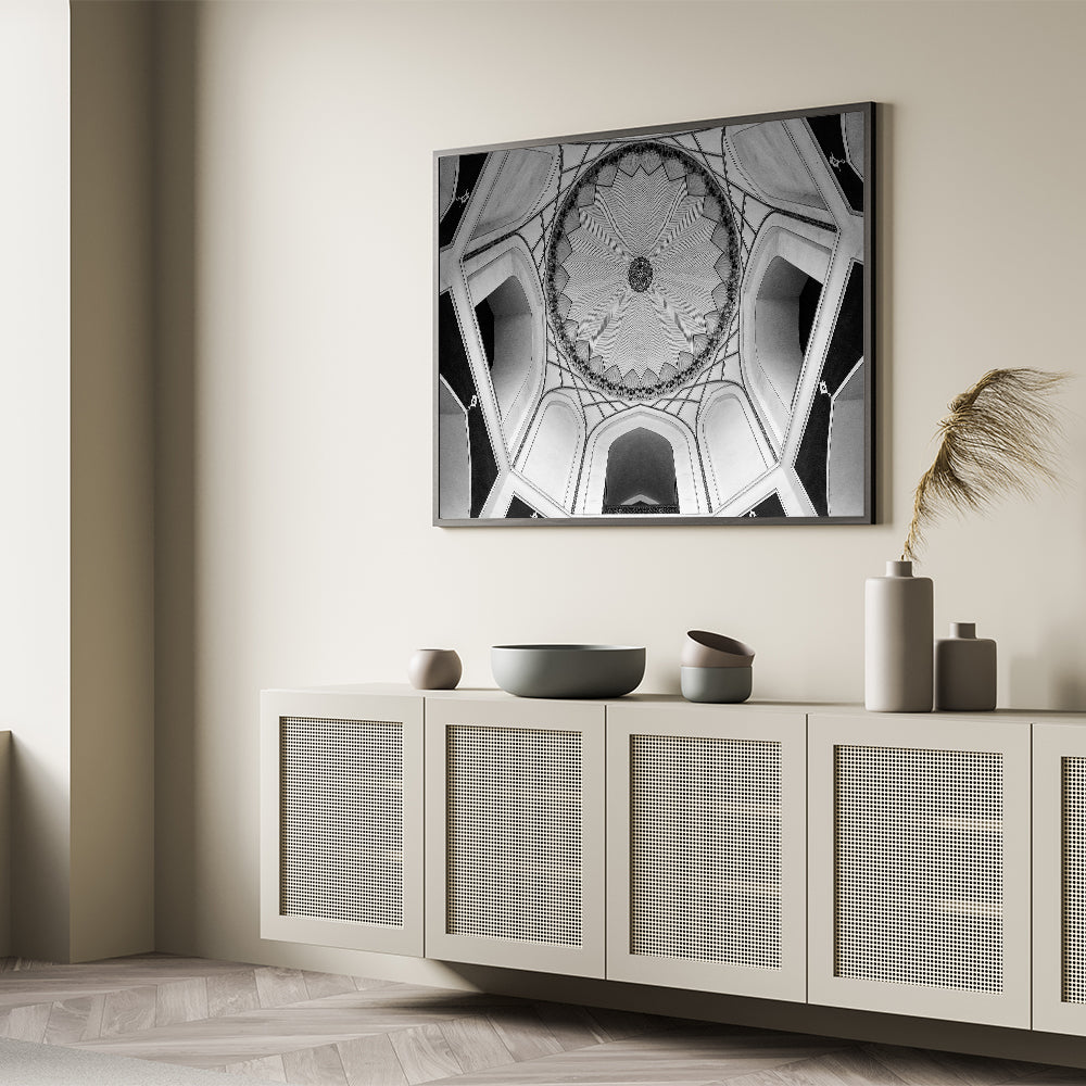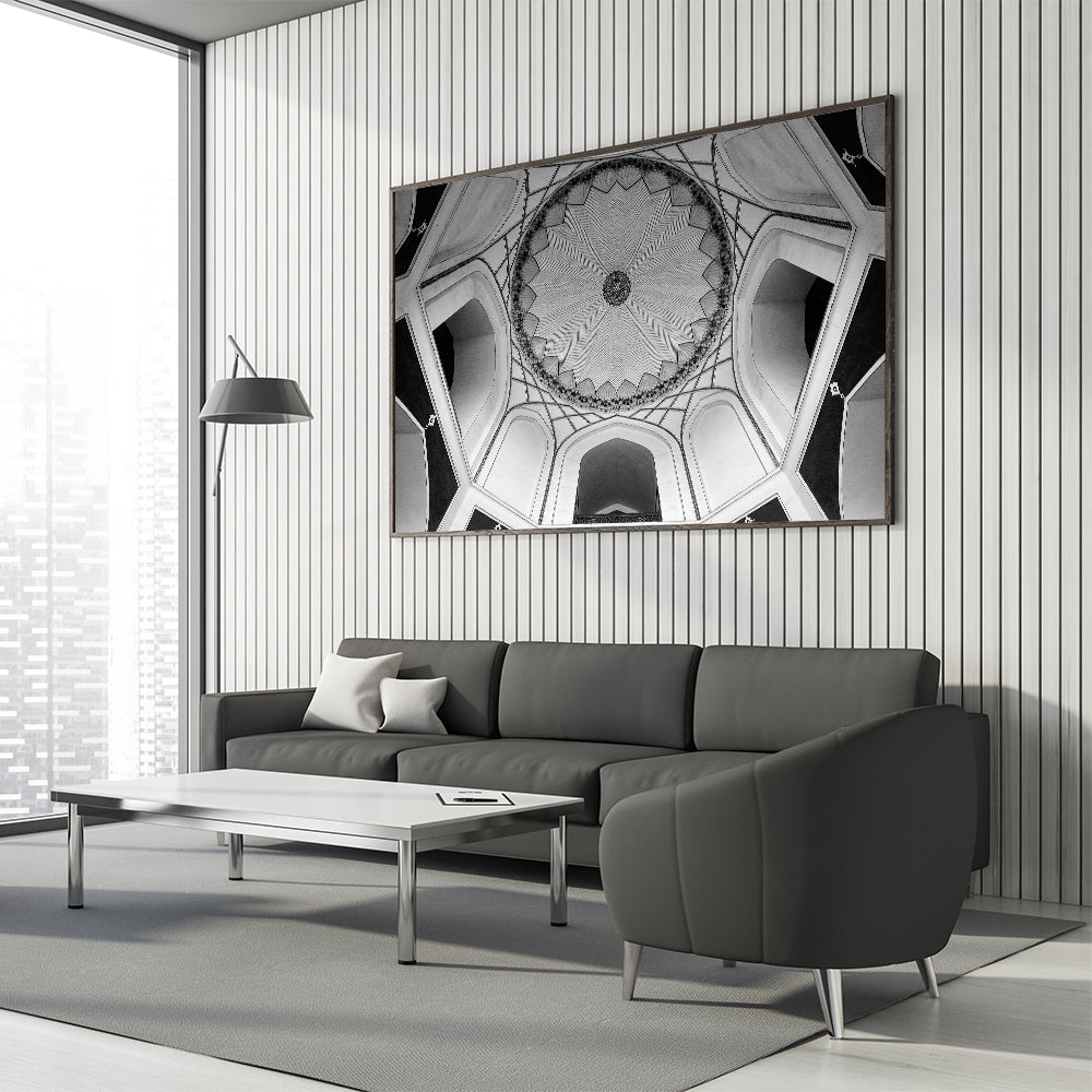 Embrace the elegance of detailed architecture with this striking black and white dome design wall art. This artwork beautifully captures the intricate patterns and symmetry of a traditional dome ceiling, showcasing the craftsmanship and artistry that defines classic architecture. The monochromatic color palette enhances the detailed lines and geometric shapes, making it a perfect piece for modern and minimalist spaces.
