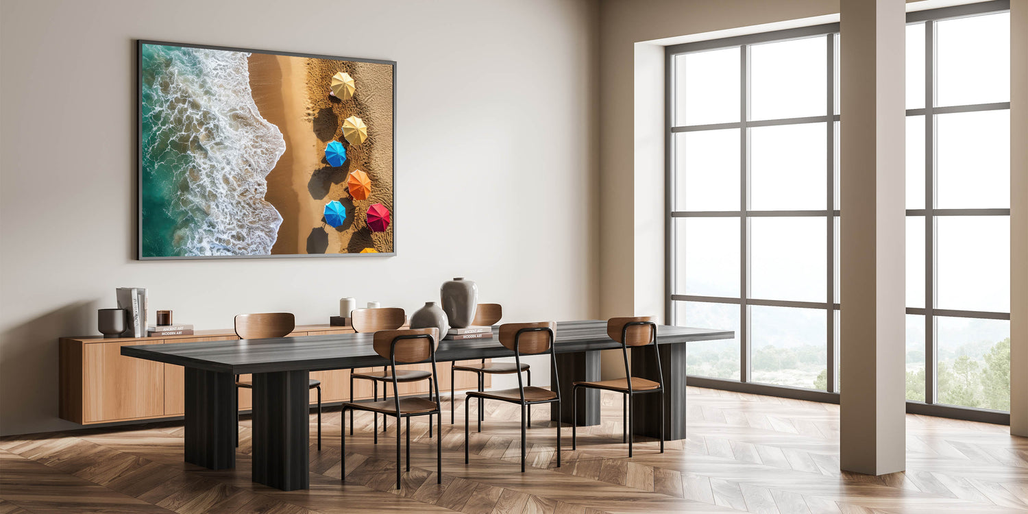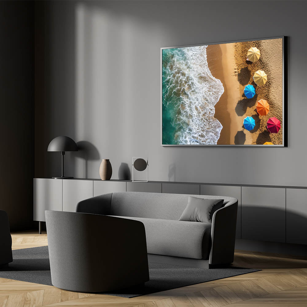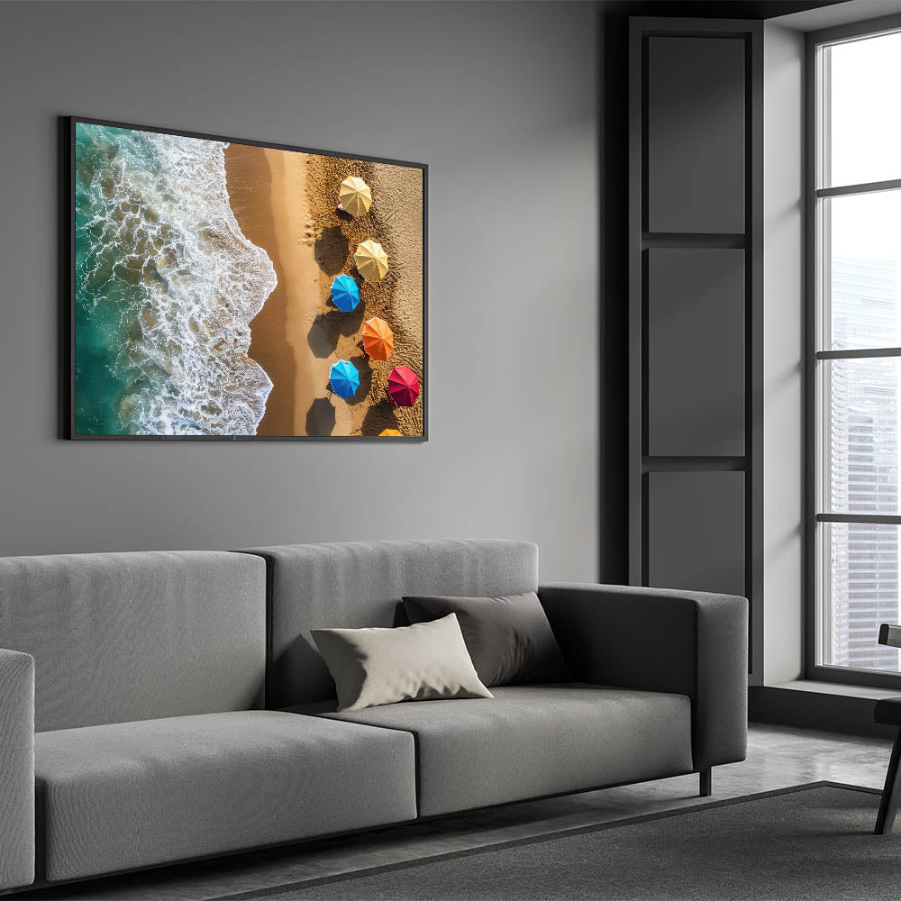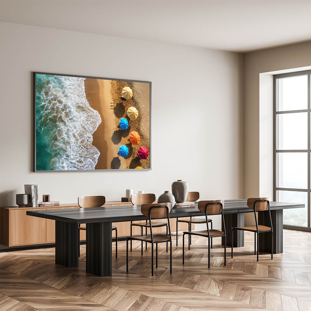 This artwork is perfect for anyone looking to brighten their decor with a vibrant, tropical touch. The combination of the colorful umbrellas and the serene ocean waves will instantly transport you to the warm, sunny beaches of the Dominican Republic.