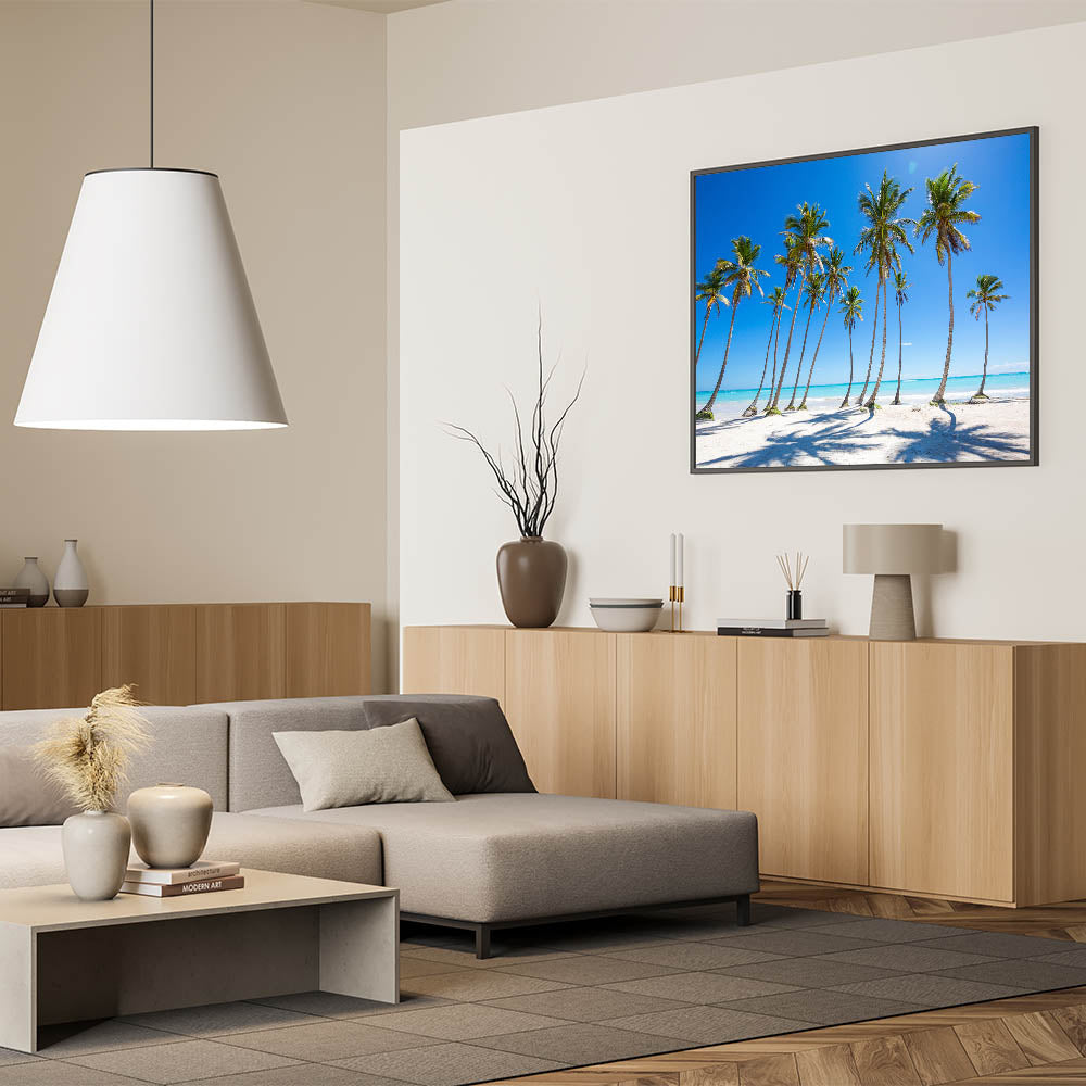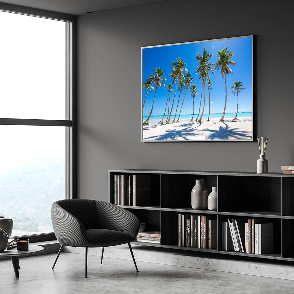 Capture the serene beauty of the Dominican Republic with this stunning tropical beach wall art. Featuring tall, graceful palm trees swaying against a backdrop of pristine white sand and crystal-clear turquoise waters, this artwork brings a refreshing touch of the Caribbean into your space. The vibrant blue sky adds a calming contrast to the bright beach, making this piece perfect for anyone looking to embrace the warmth and tranquility of island life.